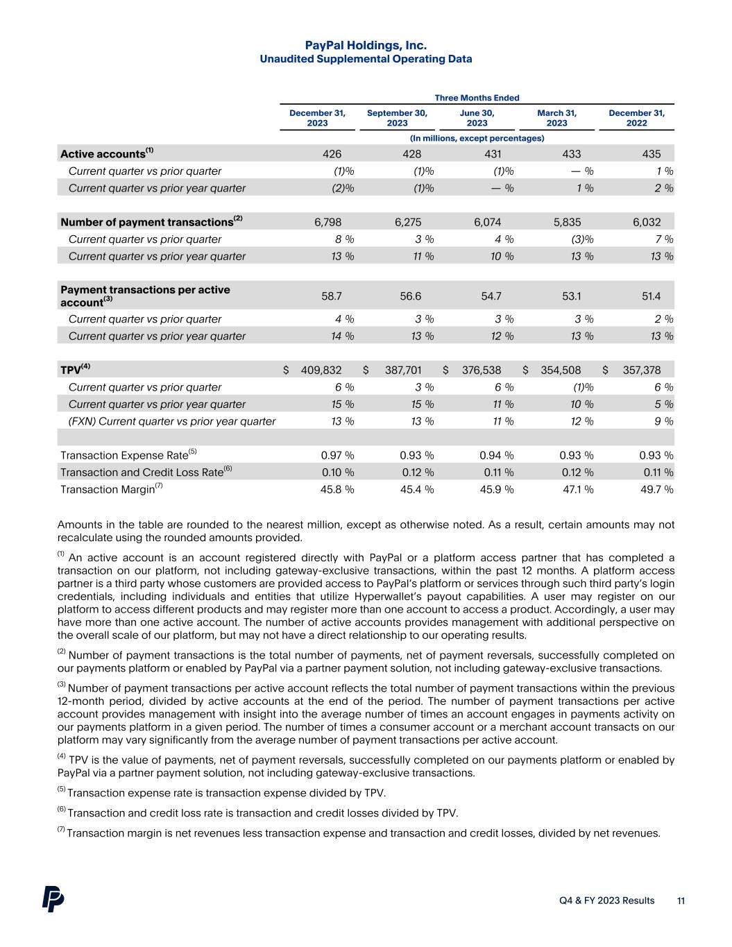 Q4 & FY 2023 Results 11 PayPal Holdings, Inc. Unaudited Supplemental Operating Data Three Months Ended December 31, 2023 September 30, 2023 June 30, 2023 March 31, 2023 December 31, 2022 (In millions, except percentages) Active accounts(1) 426 428 431 433 435 Current quarter vs prior quarter (1) % (1) % (1) % — % 1 % Current quarter vs prior year quarter (2) % (1) % — % 1 % 2 % Number of payment transactions(2) 6,798 6,275 6,074 5,835 6,032 Current quarter vs prior quarter 8 % 3 % 4 % (3) % 7 % Current quarter vs prior year quarter 13 % 11 % 10 % 13 % 13 % Payment transactions per active account(3) 58.7 56.6 54.7 53.1 51.4 Current quarter vs prior quarter 4 % 3 % 3 % 3 % 2 % Current quarter vs prior year quarter 14 % 13 % 12 % 13 % 13 % TPV(4) $ 409,832 $ 387,701 $ 376,538 $ 354,508 $ 357,378 Current quarter vs prior quarter 6 % 3 % 6 % (1) % 6 % Current quarter vs prior year quarter 15 % 15 % 11 % 10 % 5 % (FXN) Current quarter vs prior year quarter 13 % 13 % 11 % 12 % 9 % Transaction Expense Rate(5) 0.97 % 0.93 % 0.94 % 0.93 % 0.93 % Transaction and Credit Loss Rate(6) 0.10 % 0.12 % 0.11 % 0.12 % 0.11 % Transaction Margin(7) 45.8 % 45.4 % 45.9 % 47.1 % 49.7 % Amounts in the table are rounded to the nearest million, except as otherwise noted. As a result, certain amounts may not recalculate using the rounded amounts provided. (1) An active account is an account registered directly with PayPal or a platform access partner that has completed a transaction on our platform, not including gateway-exclusive transactions, within the past 12 months. A platform access partner is a third party whose customers are provided access to PayPal’s platform or services through such third party’s login credentials, including individuals and entities that utilize Hyperwallet’s payout capabilities. A user may register on our platform to access different products and may register more than one account to access a product. Accordingly, a user may have more than one active account. The number of active accounts provides management with additional perspective on the overall scale of our platform, but may not have a direct relationship to our operating results. (2) Number of payment transactions is the total number of payments, net of payment reversals, successfully completed on our payments platform or enabled by PayPal via a partner payment solution, not including gateway-exclusive transactions. (3) Number of payment transactions per active account reflects the total number of payment transactions within the previous 12-month period, divided by active accounts at the end of the period. The number of payment transactions per active account provides management with insight into the average number of times an account engages in payments activity on our payments platform in a given period. The number of times a consumer account or a merchant account transacts on our platform may vary significantly from the average number of payment transactions per active account. (4) TPV is the value of payments, net of payment reversals, successfully completed on our payments platform or enabled by PayPal via a partner payment solution, not including gateway-exclusive transactions. (5) Transaction expense rate is transaction expense divided by TPV. (6) Transaction and credit loss rate is transaction and credit losses divided by TPV. (7) Transaction margin is net revenues less transaction expense and transaction and credit losses, divided by net revenues.