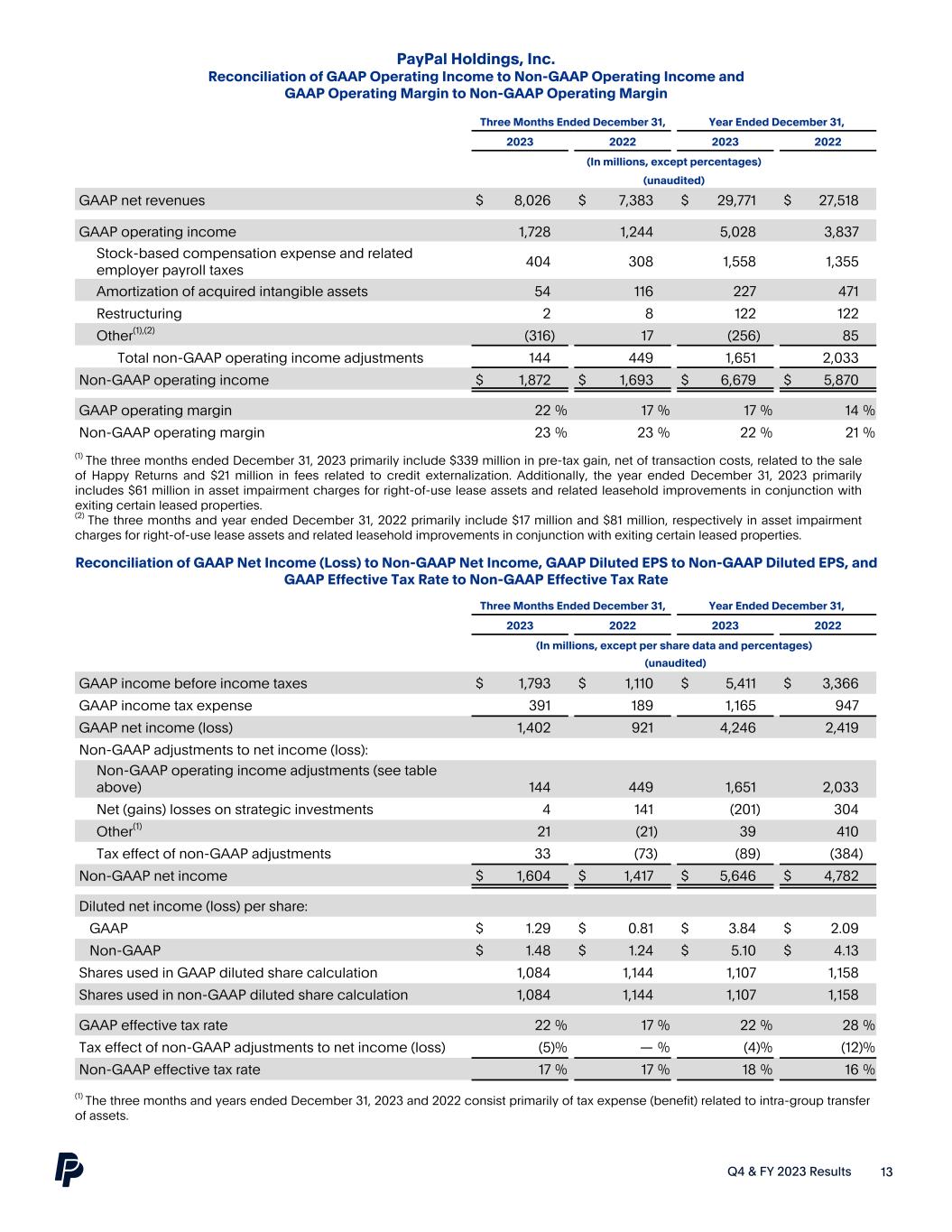 Q4 & FY 2023 Results 12 PayPal Holdings, Inc. Non-GAAP Measures of Financial Performance To supplement the company’s condensed consolidated financial statements presented in accordance with generally accepted accounting principles, or GAAP, the company uses non-GAAP measures of certain components of financial performance. These non-GAAP measures include non-GAAP net income, non-GAAP earnings per diluted share, non-GAAP operating income, non-GAAP operating margin, non-GAAP effective tax rate, free cash flow, and adjusted free cash flow. These non-GAAP measures are not in accordance with, or an alternative to, measures prepared in accordance with GAAP and may be different from non-GAAP measures used by other companies. In addition, these non-GAAP measures are not based on any comprehensive set of accounting rules or principles. Non-GAAP measures have limitations in that they do not reflect all of the amounts associated with the company’s results of operations as determined in accordance with GAAP. These measures should only be used to evaluate the company’s results of operations in conjunction with the corresponding GAAP measures. Reconciliation of all non-GAAP measures to the most directly comparable GAAP measures can be found in the subsequent tables included in this press release. These non-GAAP measures are provided to enhance investors’ overall understanding of the company’s current financial performance and its prospects for the future. Specifically, the company believes the non-GAAP measures provide useful information to both management and investors by excluding certain expenses, gains and losses, as the case may be, that may not be indicative of its core operating results and business outlook. In addition, because the company has historically reported certain non-GAAP results to investors, the company believes that the inclusion of non-GAAP measures provides consistency in the company’s financial reporting. For its internal budgeting process, and as discussed further below, the company’s management uses financial measures that do not include stock-based compensation expense, employer payroll taxes on stock-based compensation, amortization or impairment of acquired intangible assets, impairment of goodwill, restructuring-related charges, certain other gains, losses, benefits, or charges that are not indicative of the company’s core operating results, and the income taxes associated with the foregoing. In addition to the corresponding GAAP measures, the company’s management also uses the foregoing non-GAAP measures in reviewing the financial results of the company. The company excludes the following items from non-GAAP net income, non-GAAP earnings per diluted share, non-GAAP operating income, non-GAAP operating margin, and non-GAAP effective tax rate: Stock-based compensation expense and related employer payroll taxes. This consists of expenses for equity awards under our equity incentive plans. We exclude stock-based compensation expense from our non-GAAP measures primarily because they are non-cash expenses. The related employer payroll taxes are dependent on our stock price and the timing and size of exercises and vesting of equity awards, over which management has limited to no control, and as such management does not believe it correlates to the operation of our business. Amortization or impairment of acquired intangible assets, impairment of goodwill, and transaction expenses from the acquisition or disposal of a business. We incur amortization or impairment of acquired intangible assets and goodwill in connection with acquisitions and may incur significant gains or losses or transactional expenses from the acquisition or disposal of a business and therefore exclude these amounts from our non-GAAP measures. We exclude these items because management does not believe they are reflective of our ongoing operating results. Restructuring. These consist of expenses for employee severance and other exit and disposal costs. The company excludes significant restructuring charges primarily because management does not believe they are reflective of ongoing operating results. Gains and losses on strategic investments. The gains and losses we record on our strategic investments are tied to the performance of the companies that we invest in. We exclude such gains and losses in full because the operations of the investee and the related gains and losses are not indicative of our ongoing operating results. Certain other significant gains, losses, benefits, or charges that are not indicative of the company’s core operating results. These are significant gains, losses, benefits, or charges during a period that are the result of isolated events or transactions which have not occurred frequently in the past and are not expected to occur regularly in the future. The company excludes these amounts from its non-GAAP results because management does not believe they are indicative of our current or ongoing operating results. Tax effect of non-GAAP adjustments. This adjustment is made to present stock-based compensation and the other amounts described above on an after-tax basis consistent with the presentation of non-GAAP net income. Free cash flow represents operating cash flows less purchases of property and equipment. The company uses free cash flow as a liquidity measure that provides useful information to management and investors about the amount of cash generated by the business after the purchases of property, buildings, and equipment, which can then be used to, among other things, invest in the company’s business, make strategic acquisitions and investments, and repurchase stock. A limitation of the utility of free cash flow as a measure of financial performance is that it does not represent the total increase or decrease in the company’s cash balance for the period. In addition to the non-GAAP measures discussed above, the company also analyzes certain measures, includ