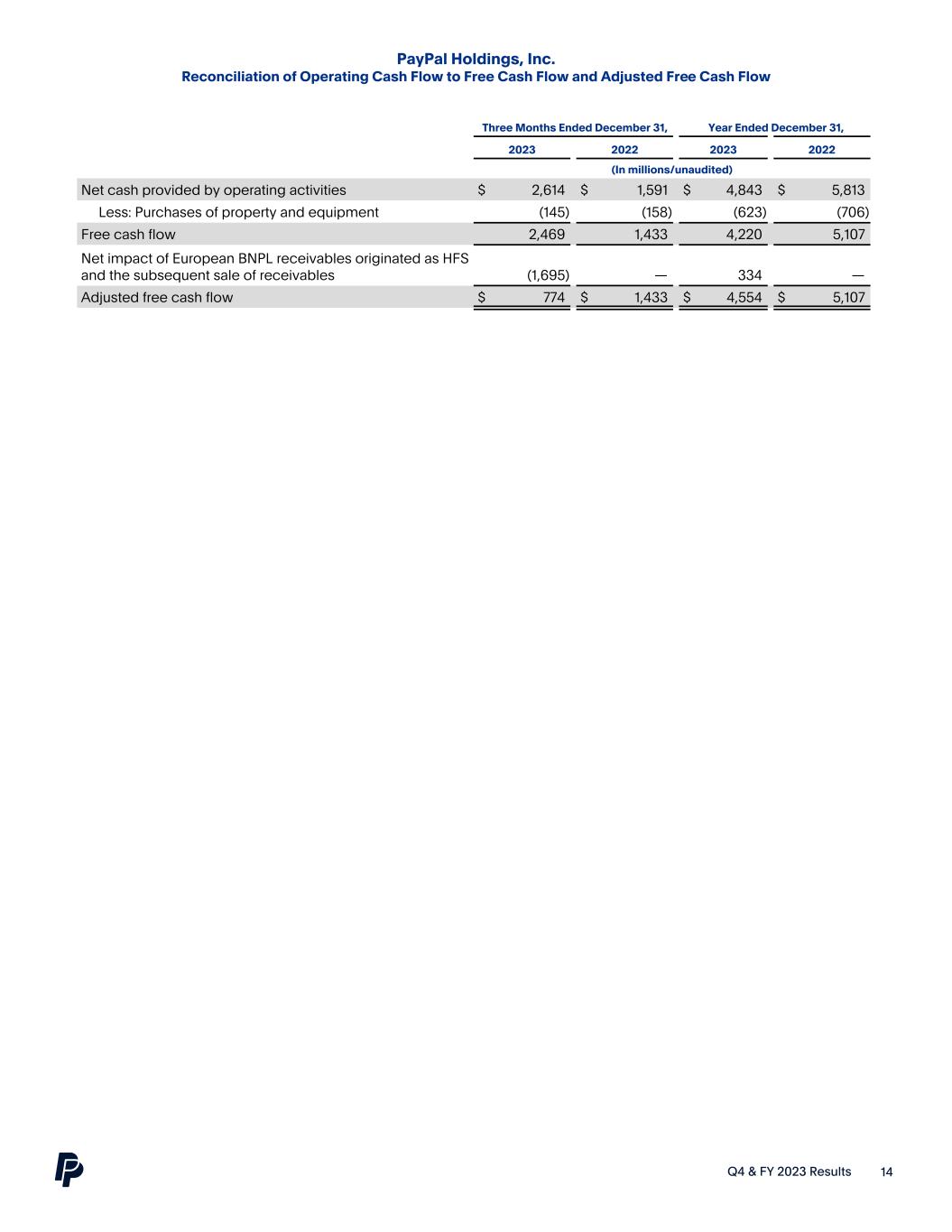 Q4 & FY 2023 Results 14 PayPal Holdings, Inc. Reconciliation of Operating Cash Flow to Free Cash Flow and Adjusted Free Cash Flow Three Months Ended December 31, Year Ended December 31, 2023 2022 2023 2022 (In millions/unaudited) Net cash provided by operating activities $ 2,614 $ 1,591 $ 4,843 $ 5,813 Less: Purchases of property and equipment (145) (158) (623) (706) Free cash flow 2,469 1,433 4,220 5,107 Net impact of European BNPL receivables originated as HFS and the subsequent sale of receivables (1,695) — 334 — Adjusted free cash flow $ 774 $ 1,433 $ 4,554 $ 5,107