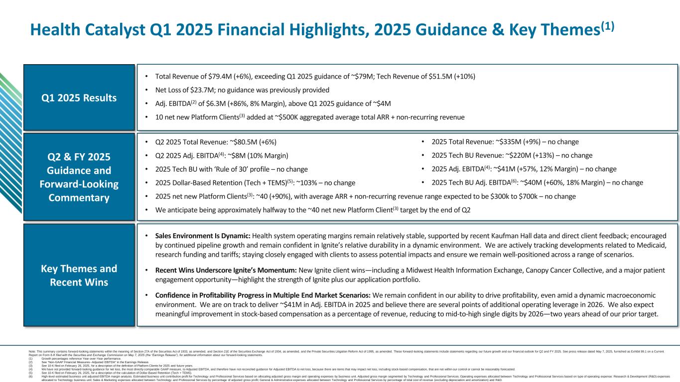 本日2025年5月7日(水)午後5時(東部標準時)より、結果を確認するための電話会議を開催します。電話会議には、米国からの参加者は(800) 343-5172、海外からの参加者は(203) 518-9856にダイヤルし、会議ID "HCATQ125" を指定してください。ライブ・オーディオ・ウェブキャストは、https://ir.healthcatalyst.com/。電話会議のリプレイはウェブキャストを通じてオンデマンドで聴くことができ、電話会議終了後すぐに同じウェブリンクから入手可能で、約90日間利用できる。