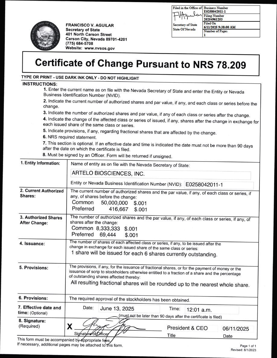 On June 12, 2025, Artelo Biosciences, Inc., a Nevada corporation (the “Company”), filed with the Secretary of State of the State of Nevada a Certificate of Change (the “Certificate of Change”), pursuant to Nevada Revised Statutes 78.209, to effect a one-for-six (1-for-6) reverse stock split (the “Reverse Split”) of the Company’s issued and outstanding common stock, par value $0.001 per share (the “Common Stock”). The Reverse Split will be effective as of 12:01 a.m. Eastern Time on June 13, 2025 (the “Effective Time”). Pursuant to the Nevada Revised Statutes 78.207, the Company’s board of directors has the authority to effect a reverse stock split without stockholder approval if the number of authorized shares of common stock and the number of outstanding shares of common stock are proportionally reduced.