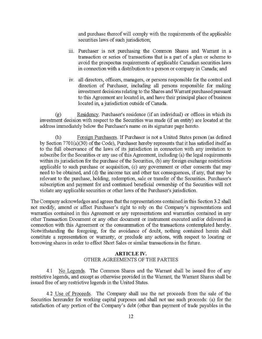 On April 9, 2020, the Canadian government launched the Canada Emergency Business Account (“CEBA”) which is intended to support businesses during COVID19 by providing interest free financing of up to $30,200 (CA$40,000) until December 31, 2023. If 75% of the loan is repaid by December 31, 2023 (extended to January 18, 2024), the loan recipient will be eligible for a loan forgiveness of the remaining 25% of the amount loaned. On April 15, 2020, the Company received a loan in the amount of $30,200 through the CEBA. If the loan has not been repaid by January 18, 2024, the outstanding amount will be automatically extended for an additional two years at 5% interest per annum payable monthly and maturing on December 31, 2025. The Company repaid 75% of the amount borrowed on January 15, 2024. The balance was forgiven, resulting in a gain of $7,298.