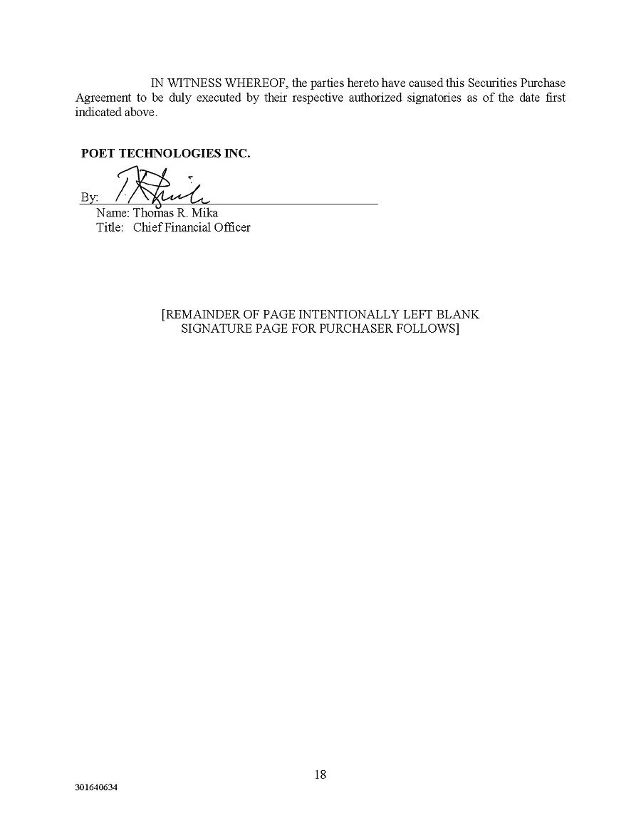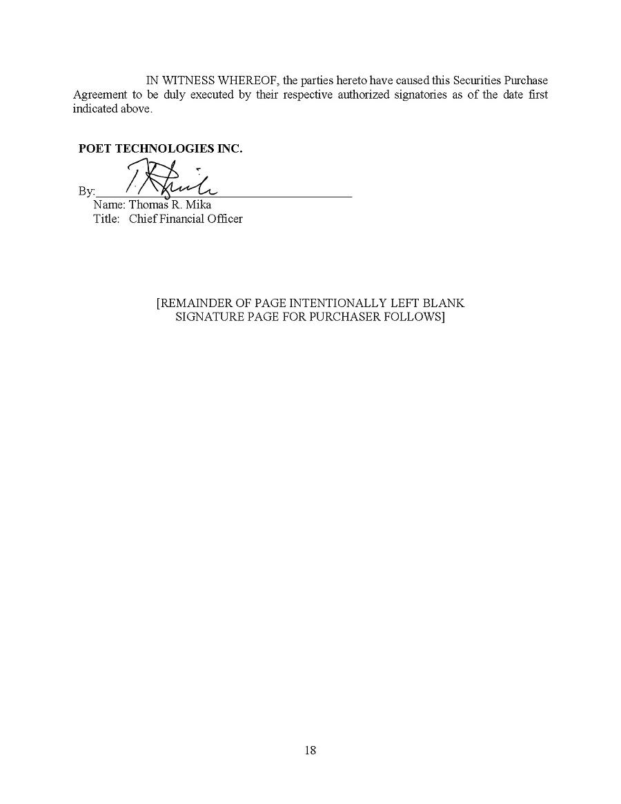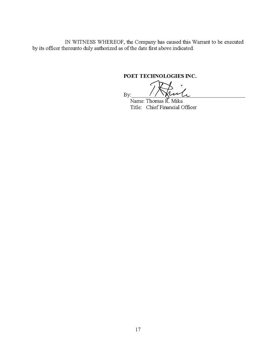 Pursuant to 18 U.S.C. Section 1350, as adopted pursuant to Section 906 of the Sarbanes-Oxley Act of 2002, I, Thomas Mika, the Chief Financial Officer of POET Technologies Inc. (the “Company”), hereby certify, that, to my knowledge: