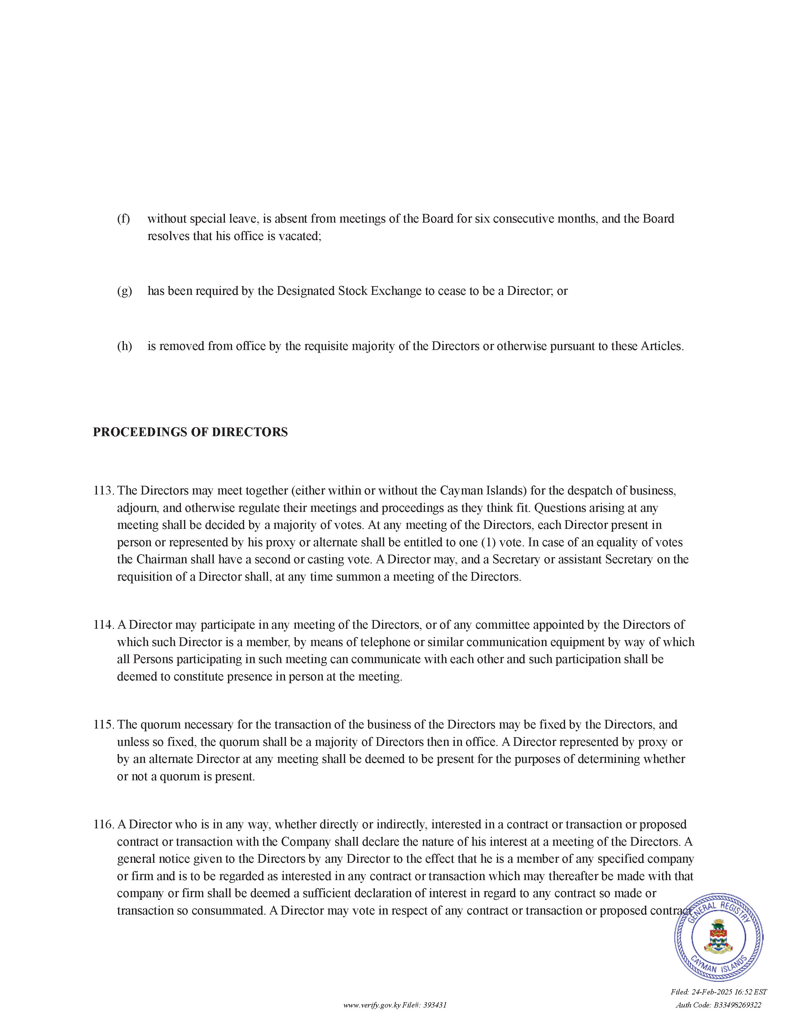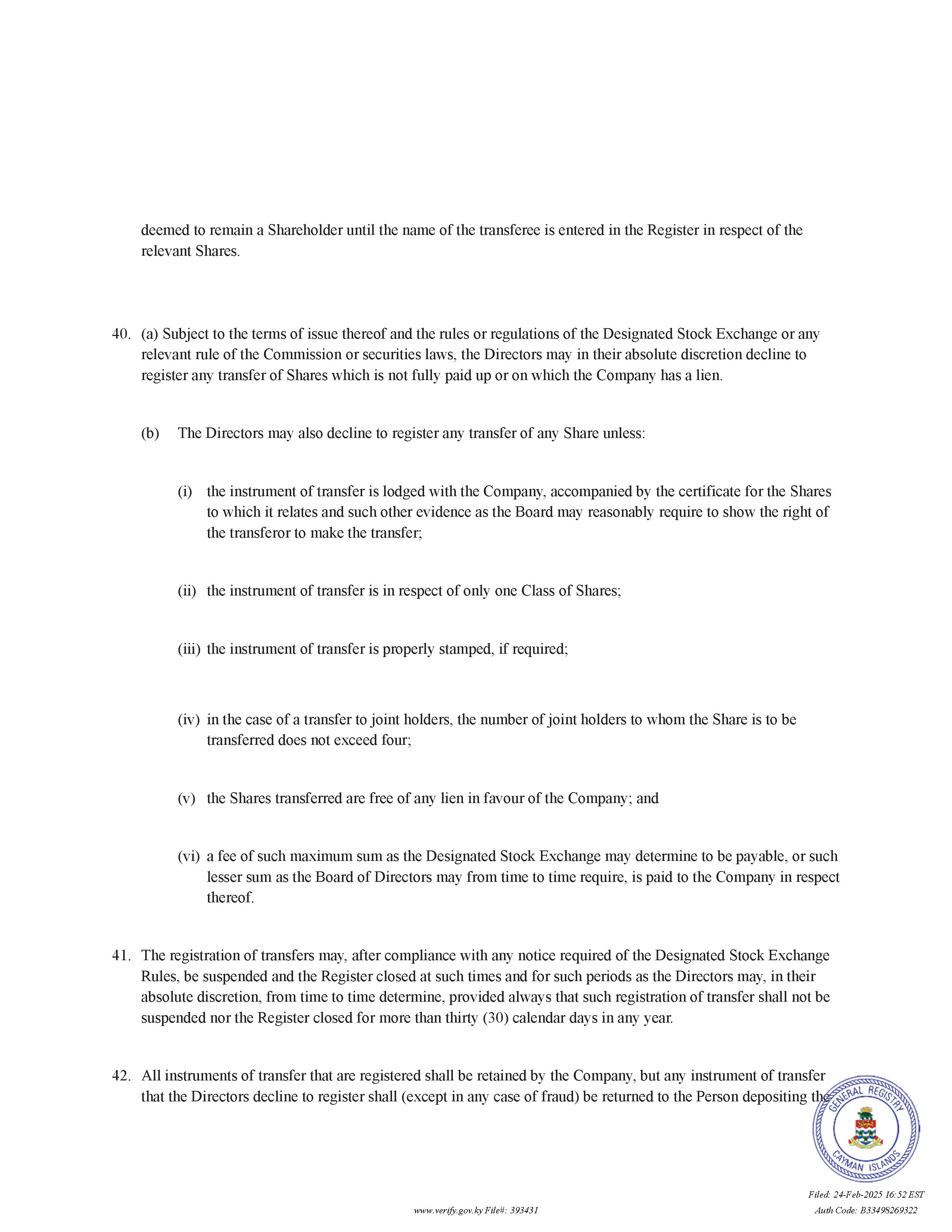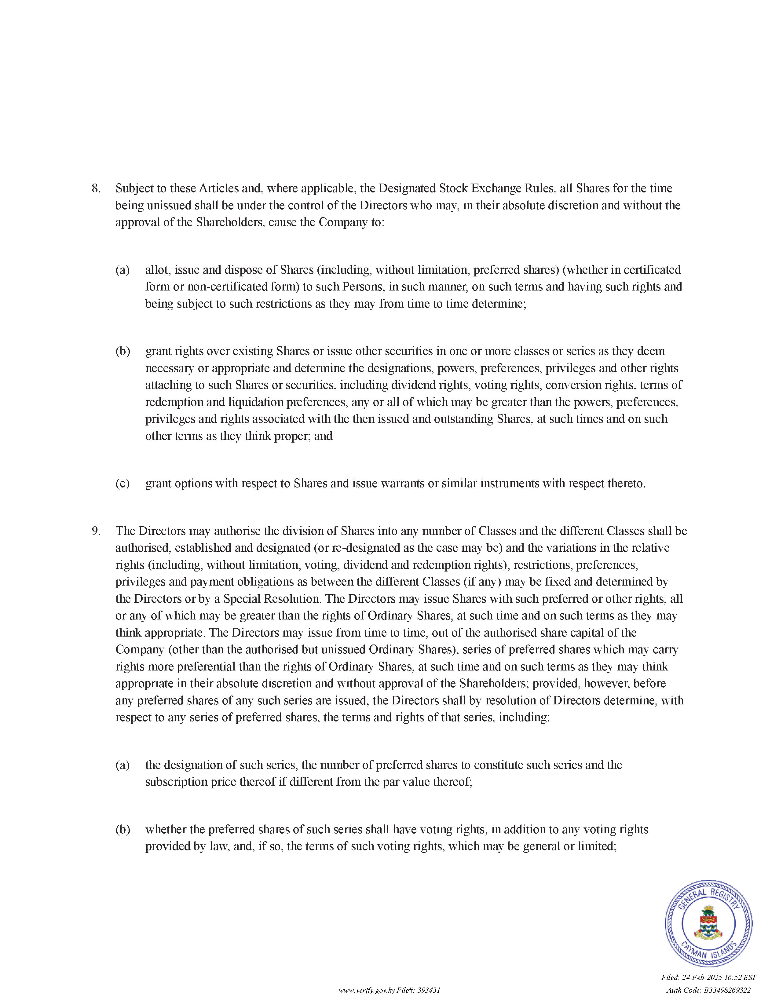 | (ii) | 481,374,039 authorized but unissued ordinary shares of a nominal or par value of US$0.0001 each in the capital of the Company be consolidated into 60,171,754 ordinary shares of a par value of US$0.0008 each, having the rights set out in the Amended and Restated Memorandum and Articles of Association, with effect from 13 December 2024; | |