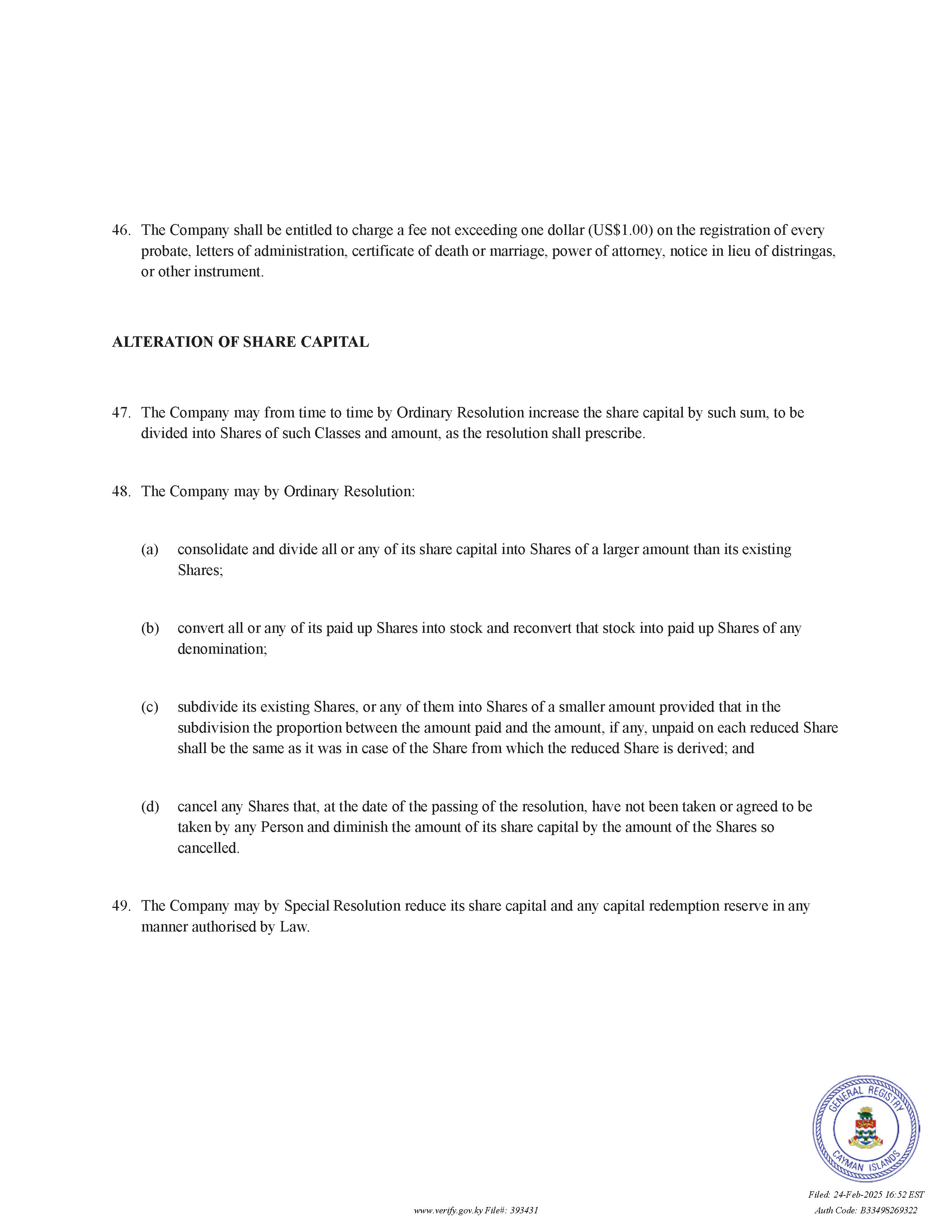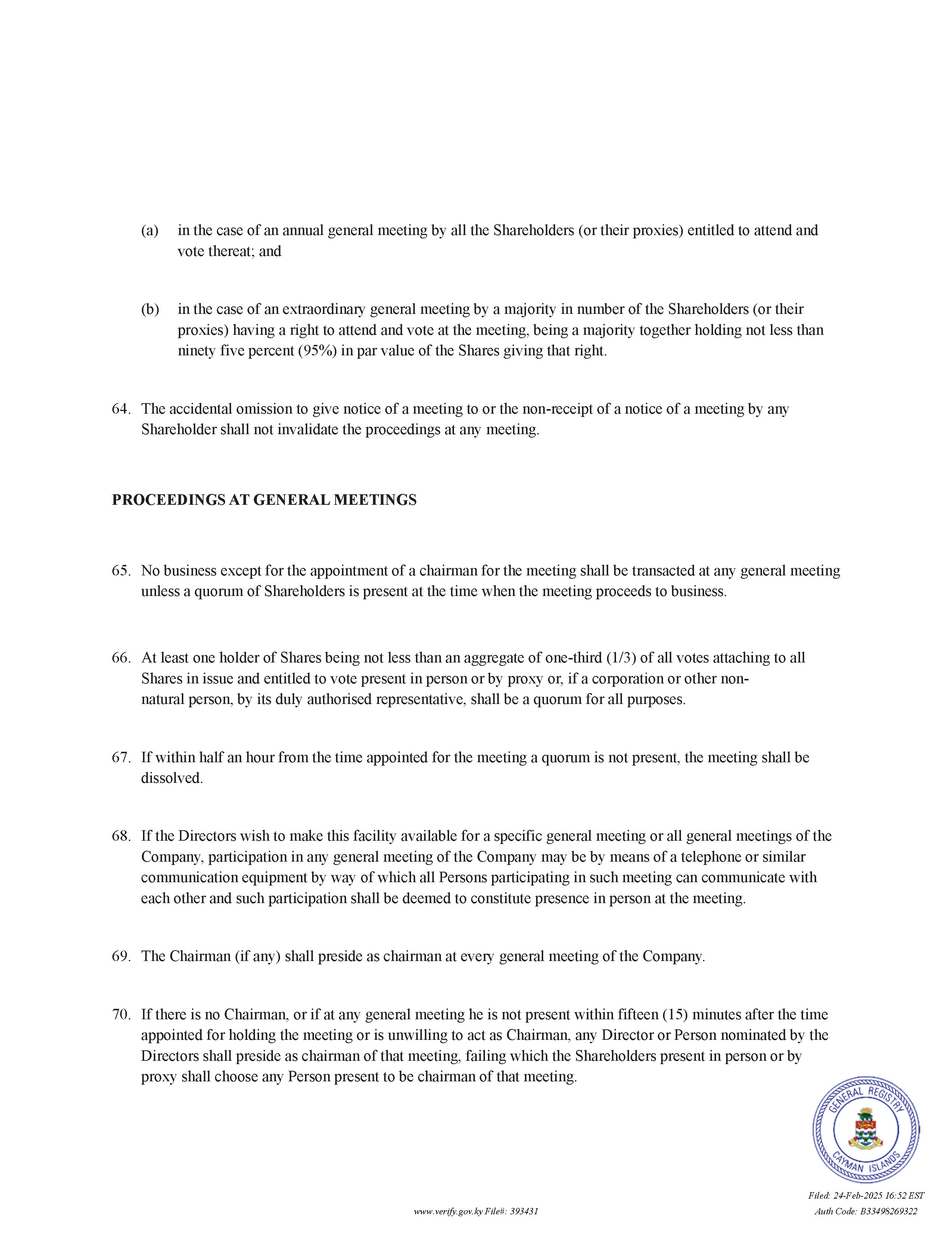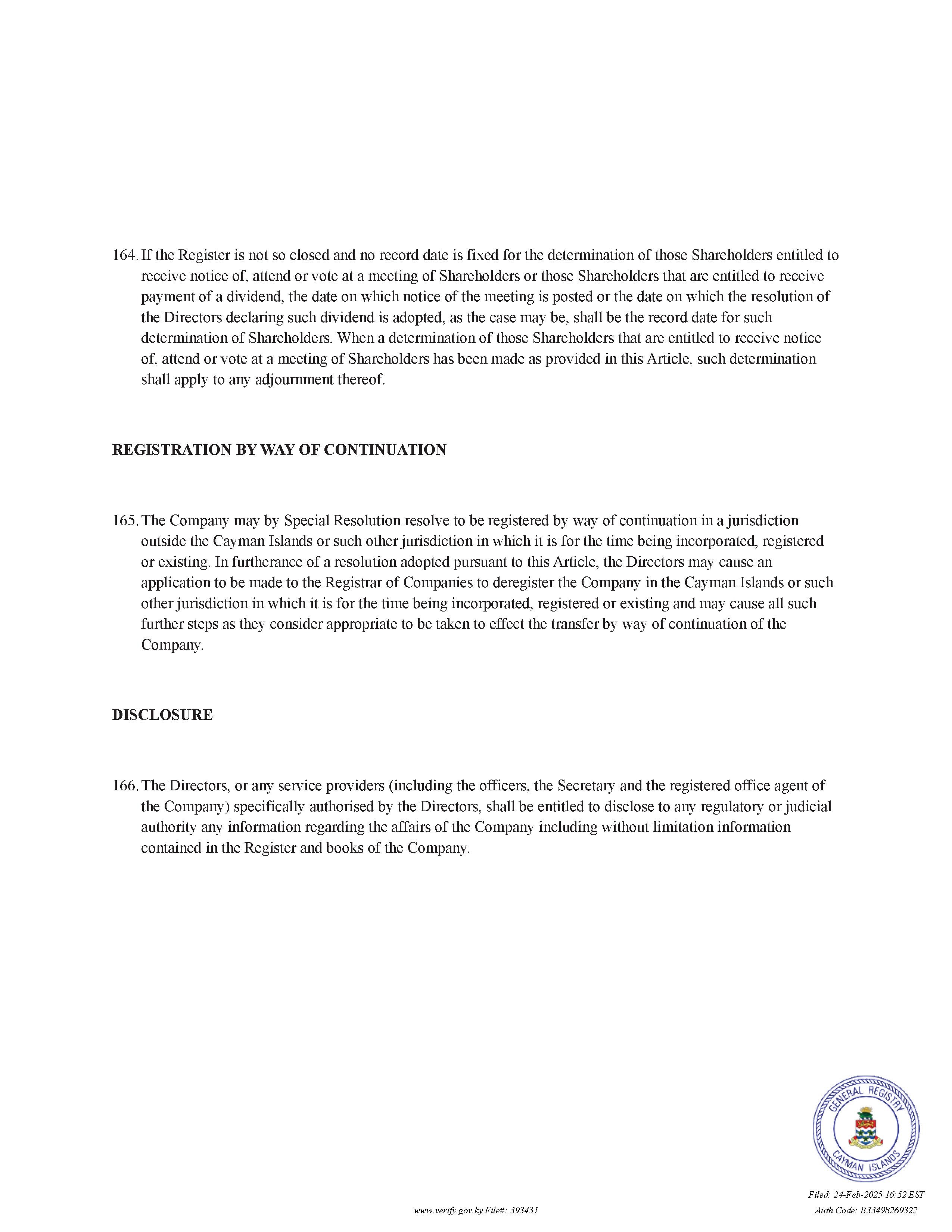 | (ii) | 481,374,039 authorized but unissued ordinary shares of a nominal or par value of US$0.0001 each in the capital of the Company be consolidated into 60,171,754 ordinary shares of a par value of US$0.0008 each, having the rights set out in the Amended and Restated Memorandum and Articles of Association, with effect from 13 December 2024; | |