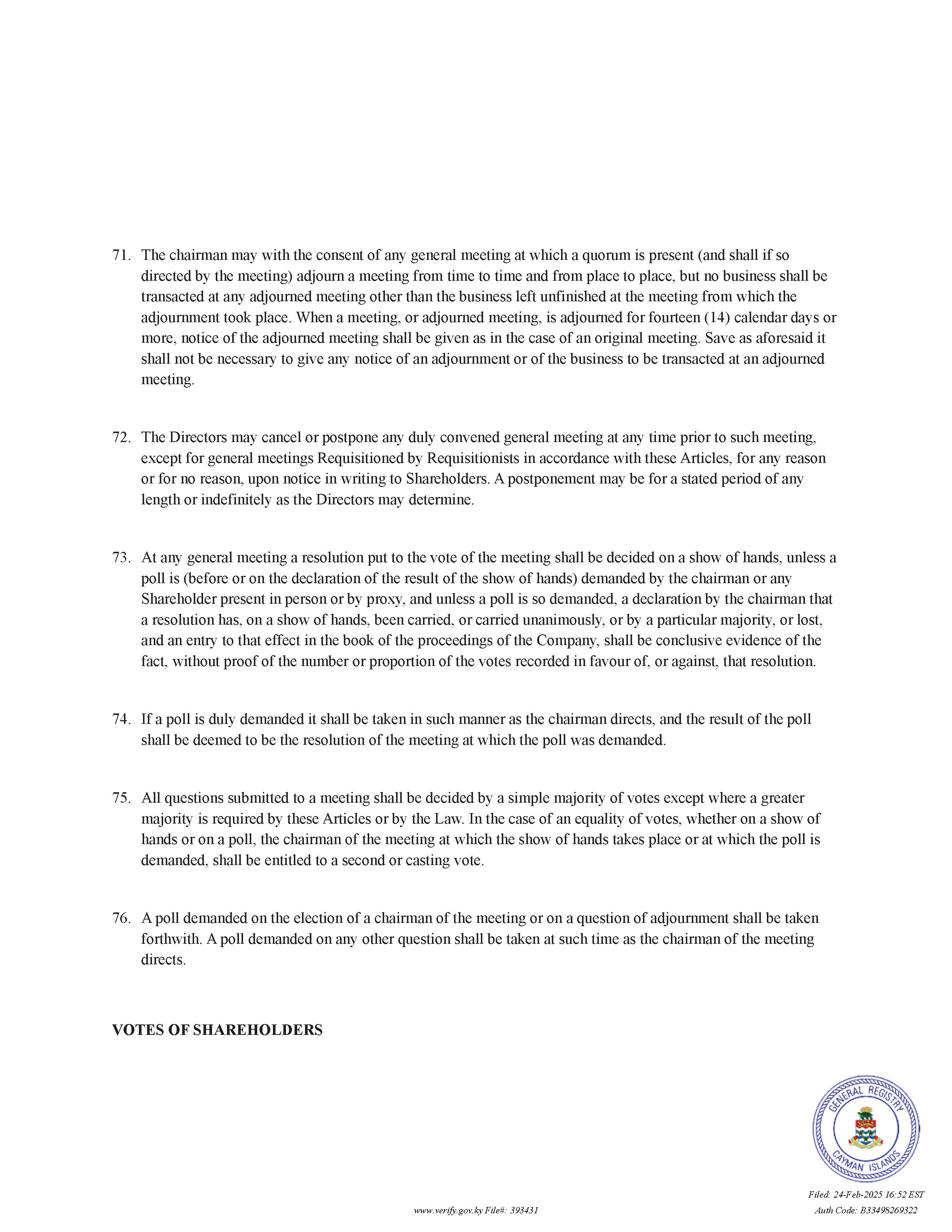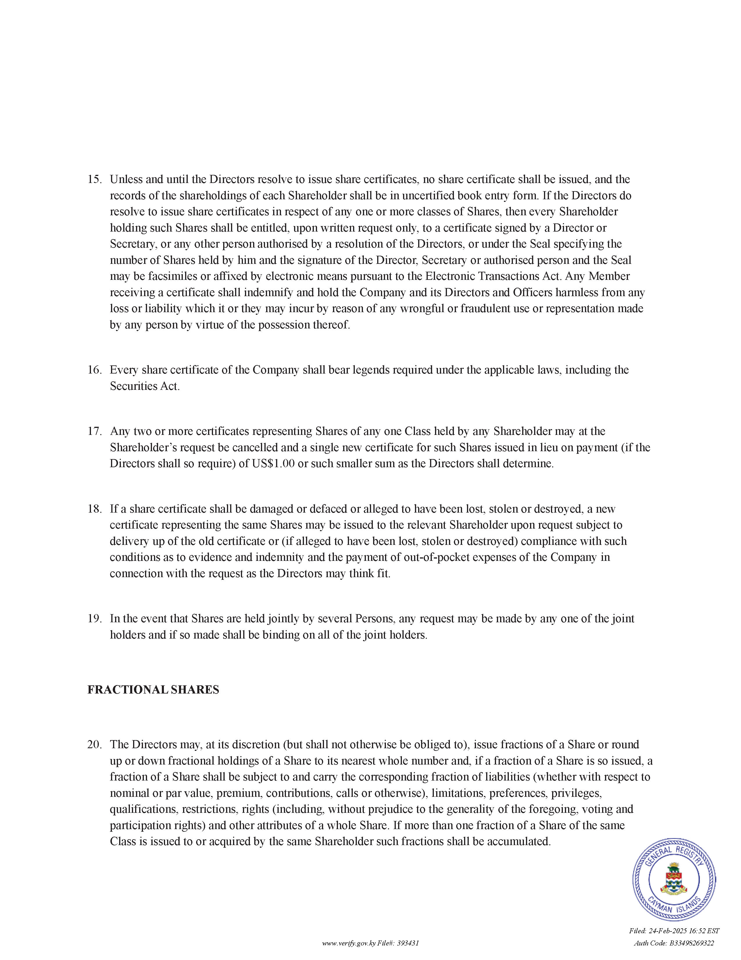 | (iii) | no fractional shares be issued in connection with the share consolidation and, in the event that a shareholder would otherwise be entitled to a fractional share upon the share consolidation, the total number of shares to be received by such shareholder may be rounded up to the nearest whole number, with effect from 13 December 2024; and | |