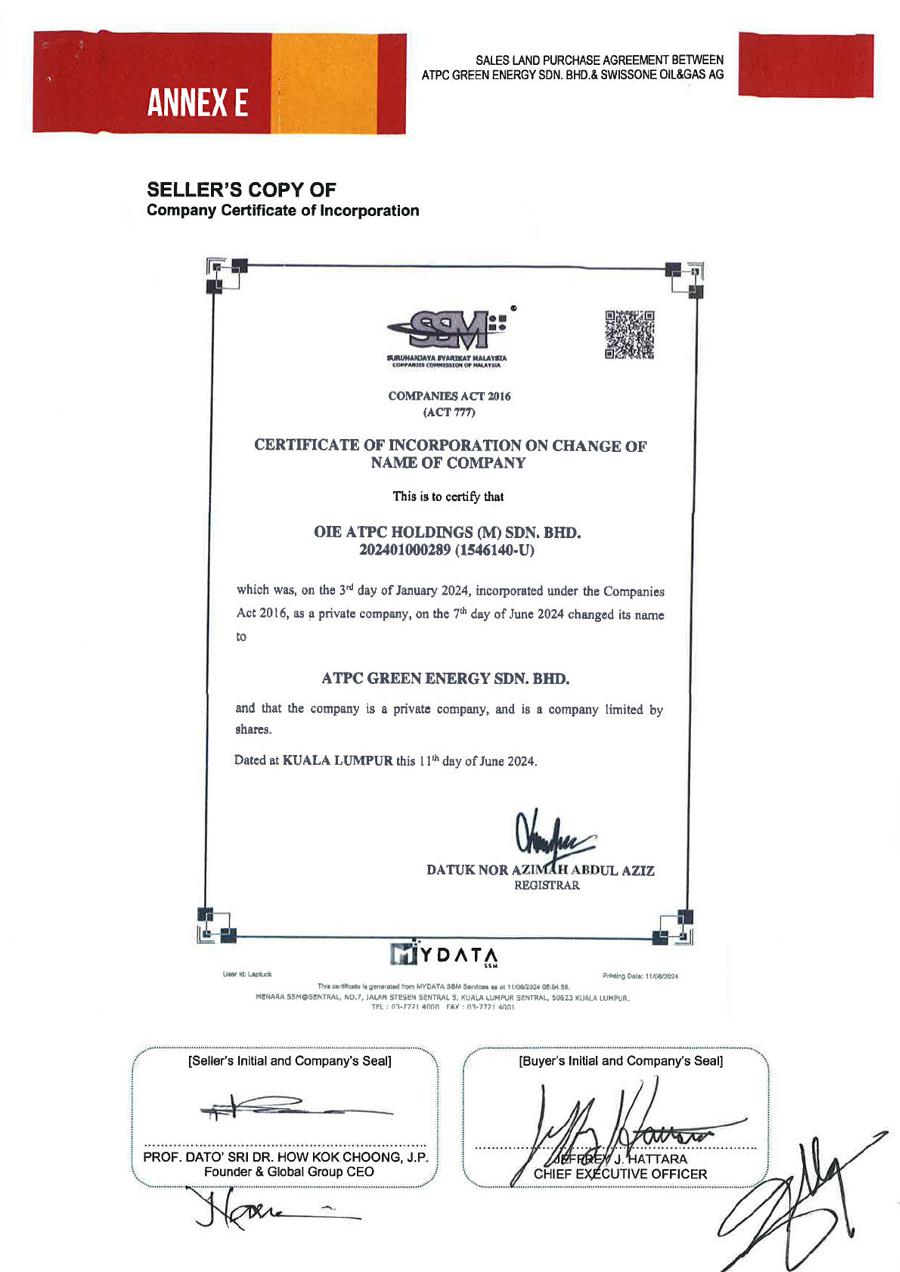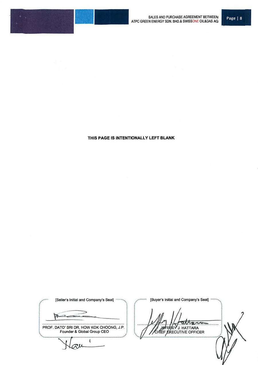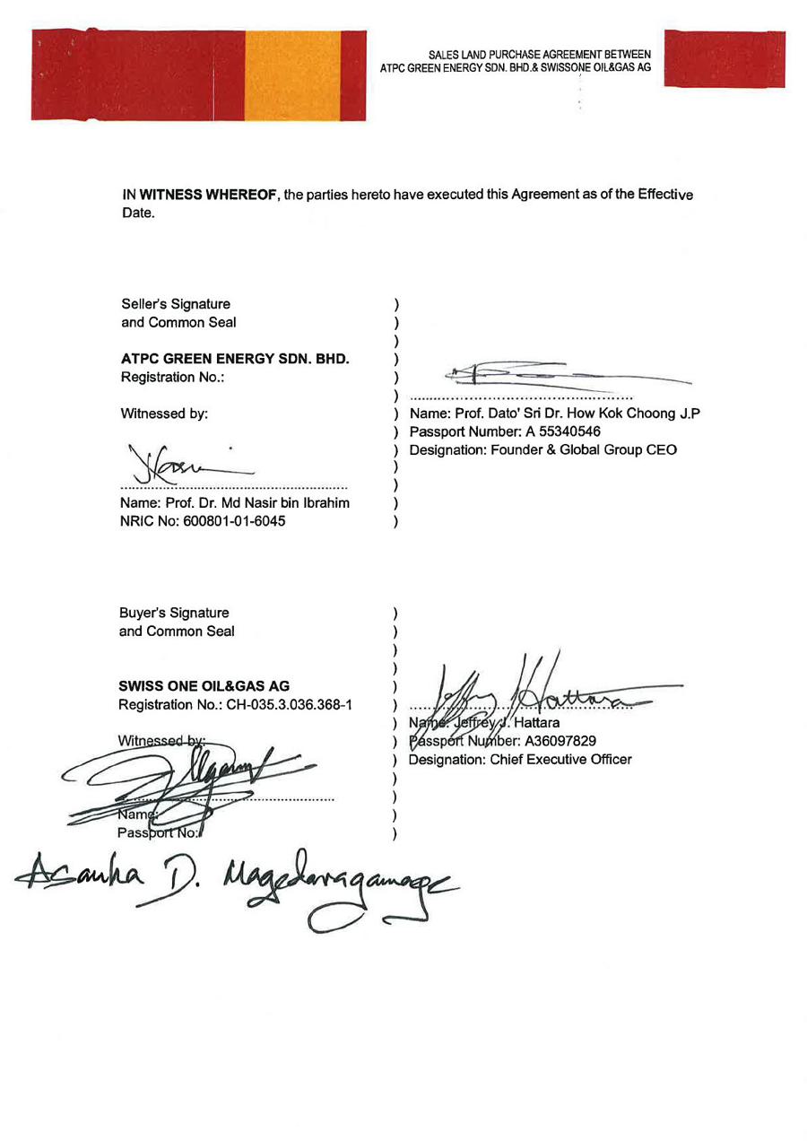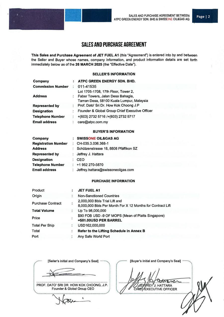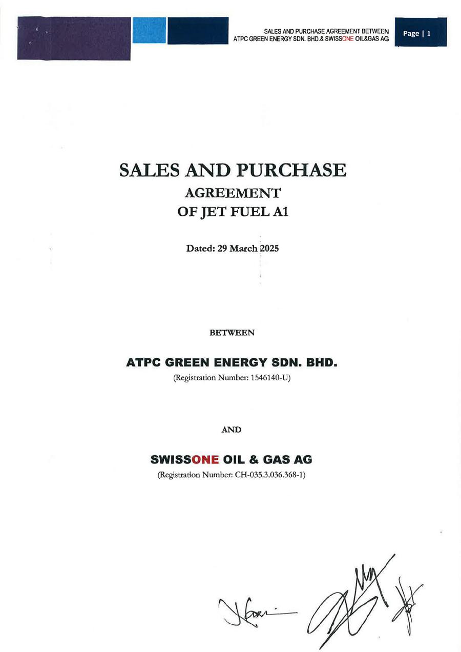 | 99.3 | Form of Sales and Purchase Agreement between ATPC Green Energy Sdn. Bhd. and Swiss One Oil & Gas AG for Jet Fuel A1 | |