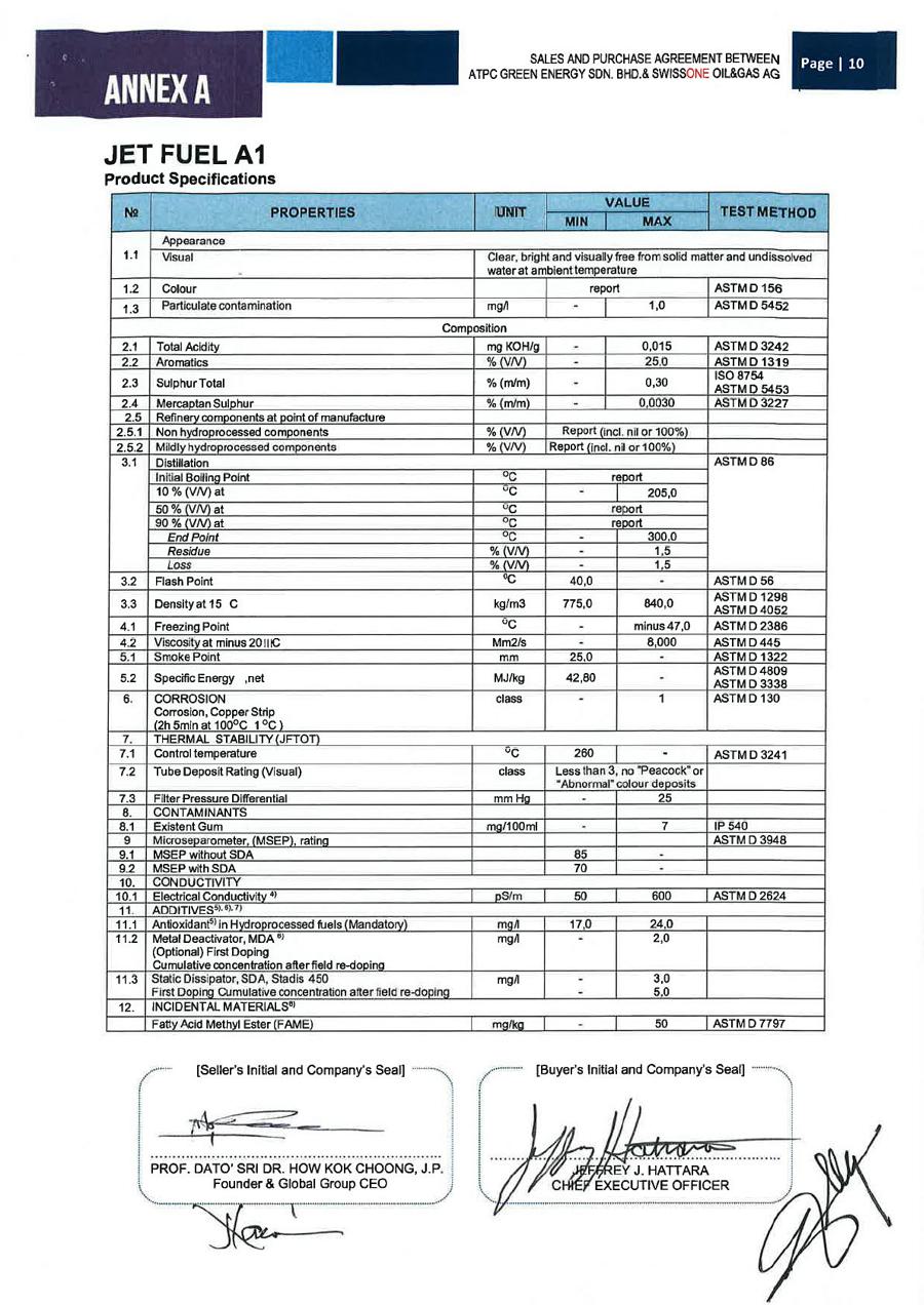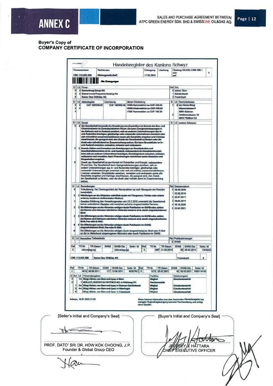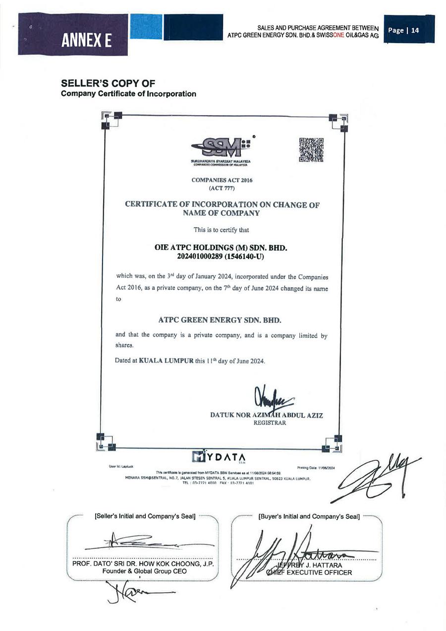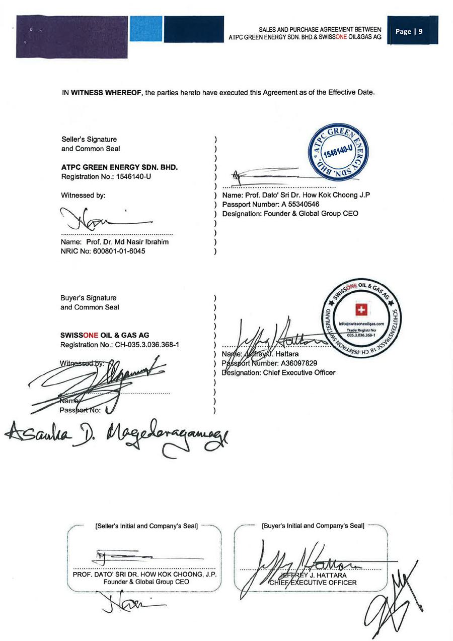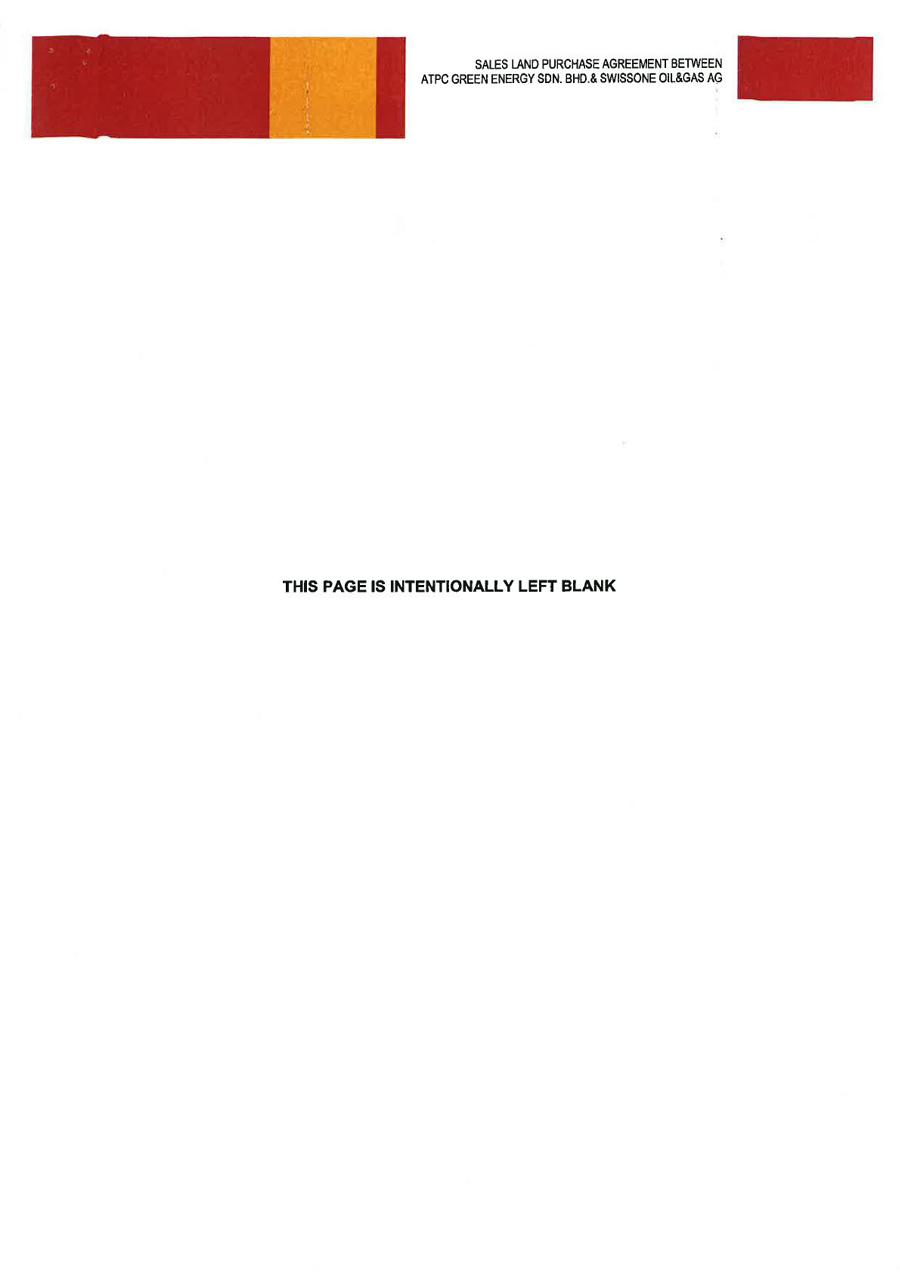 | 99.3 | Form of Sales and Purchase Agreement between ATPC Green Energy Sdn. Bhd. and Swiss One Oil & Gas AG for Jet Fuel A1 | |