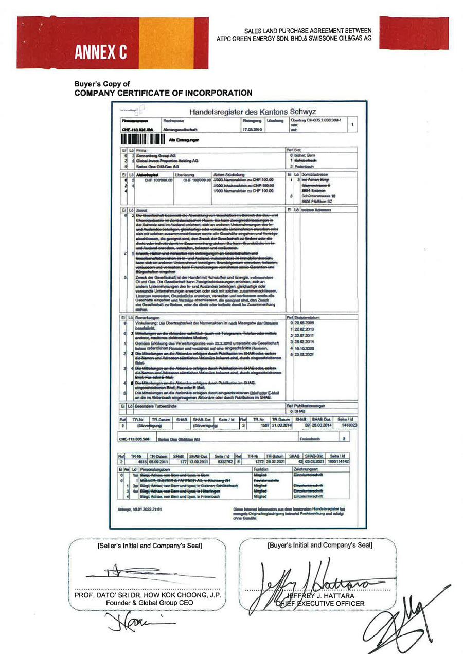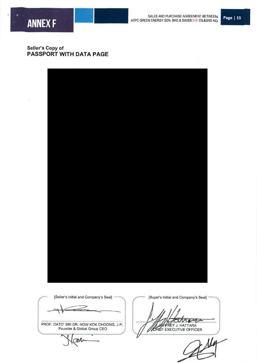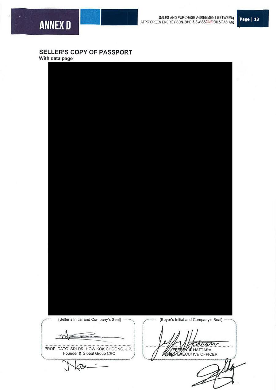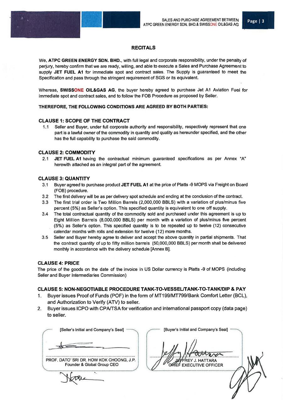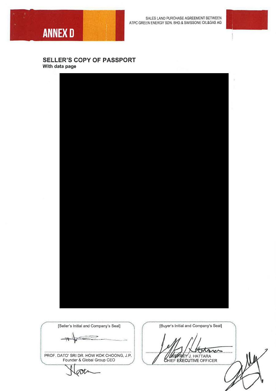 | 99.3 | Form of Sales and Purchase Agreement between ATPC Green Energy Sdn. Bhd. and Swiss One Oil & Gas AG for Jet Fuel A1 | |