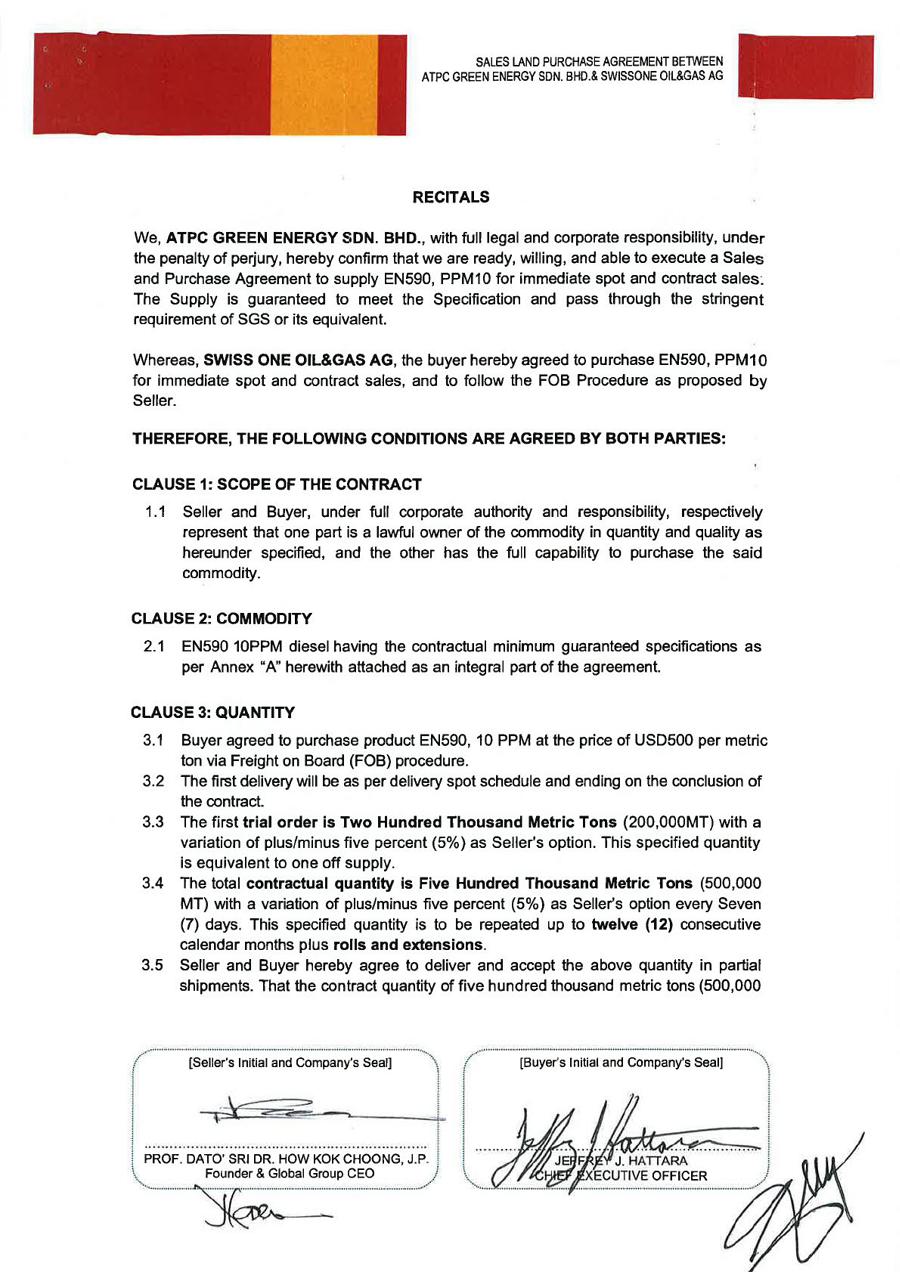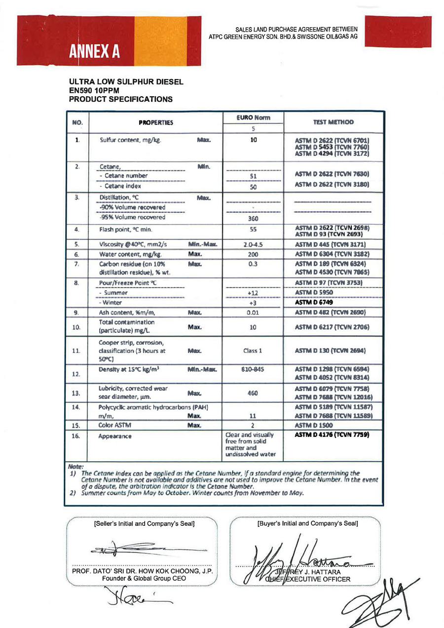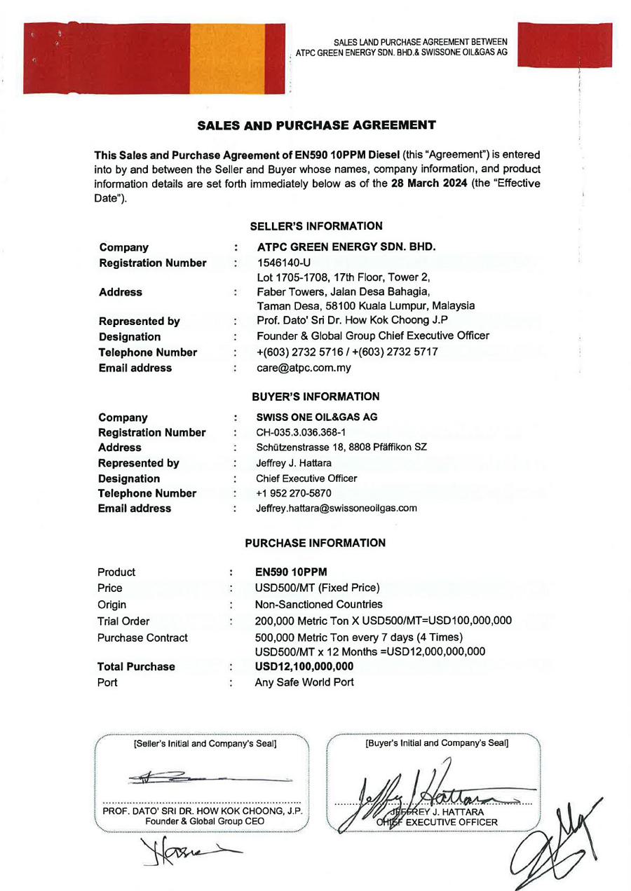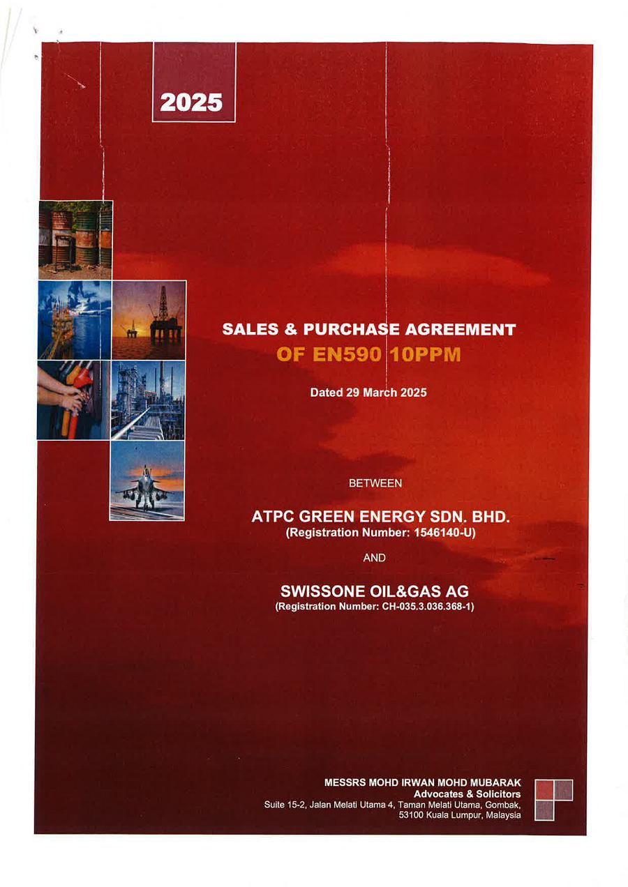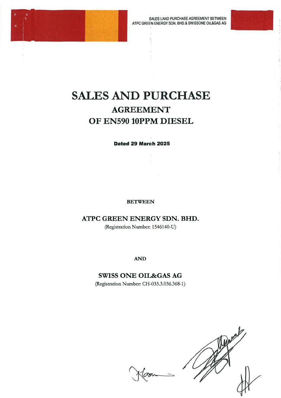 | 99.4 | Form of Sales and Purchase Agreement between ATPC Green Energy Sdn. Bhd. and Swiss One Oil & Gas AG for EN590 10PPM Diesel | |