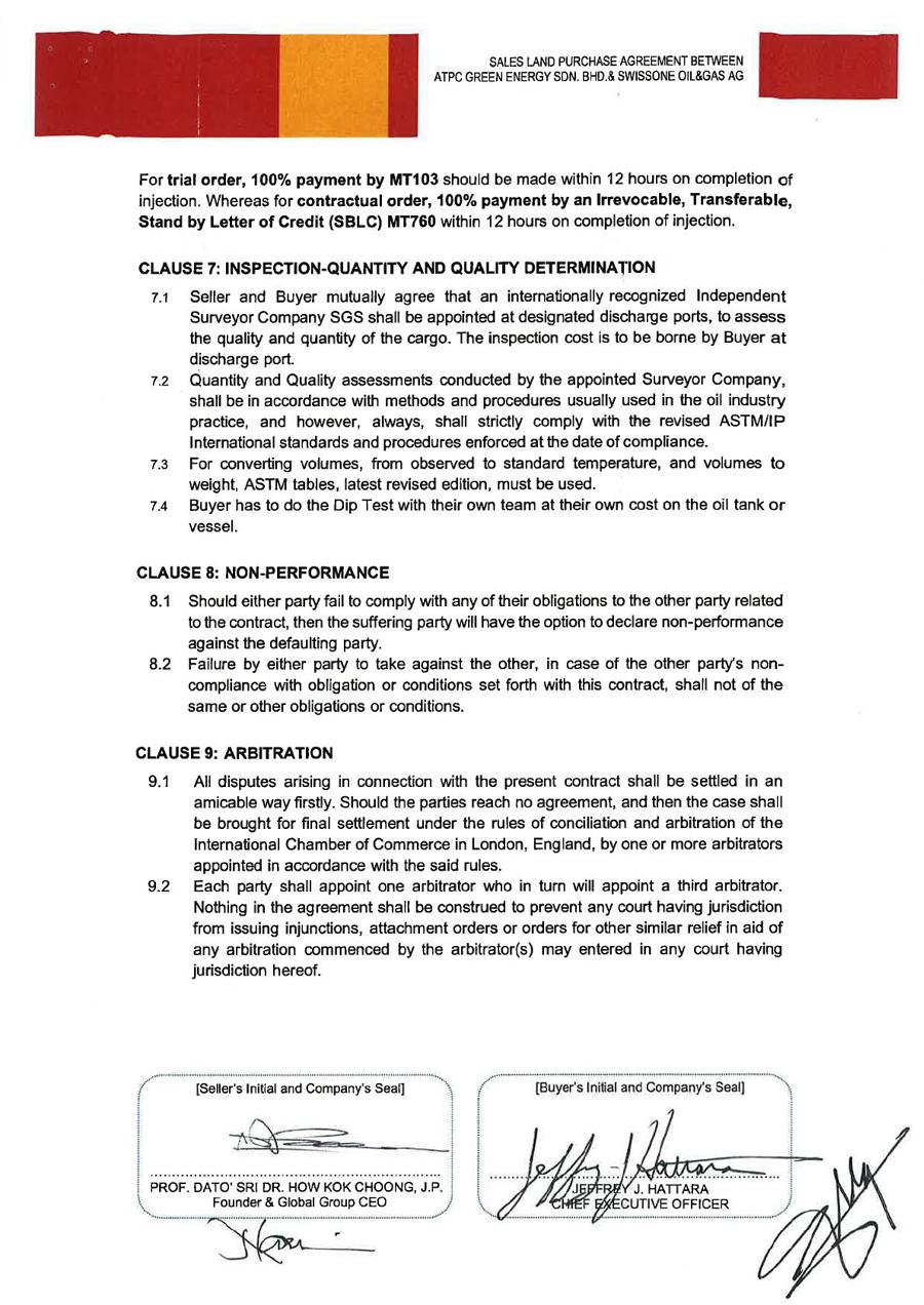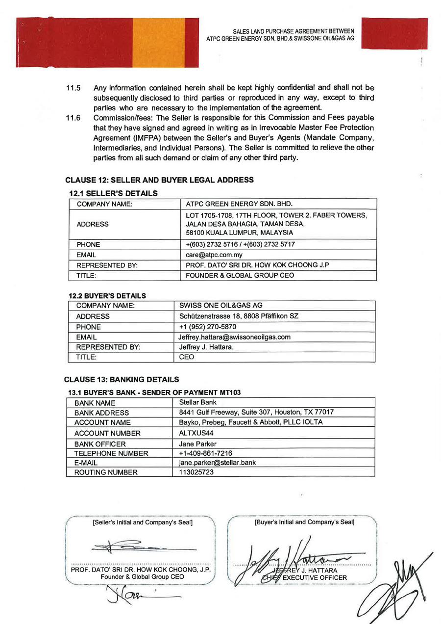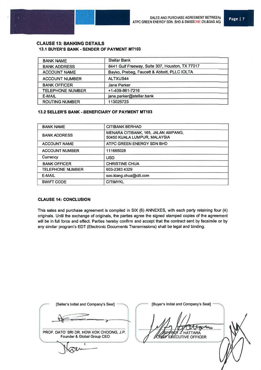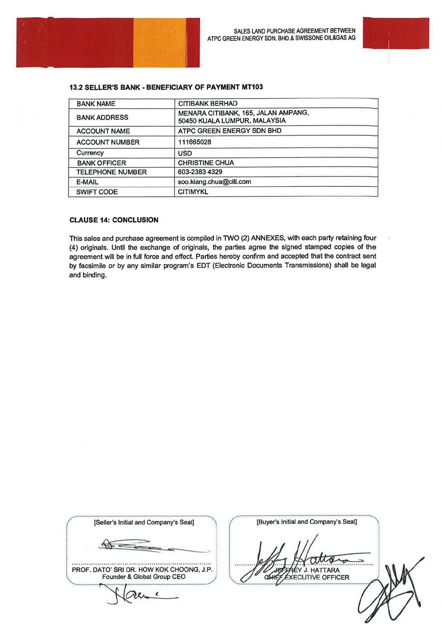 | 99.4 | Form of Sales and Purchase Agreement between ATPC Green Energy Sdn. Bhd. and Swiss One Oil & Gas AG for EN590 10PPM Diesel | |