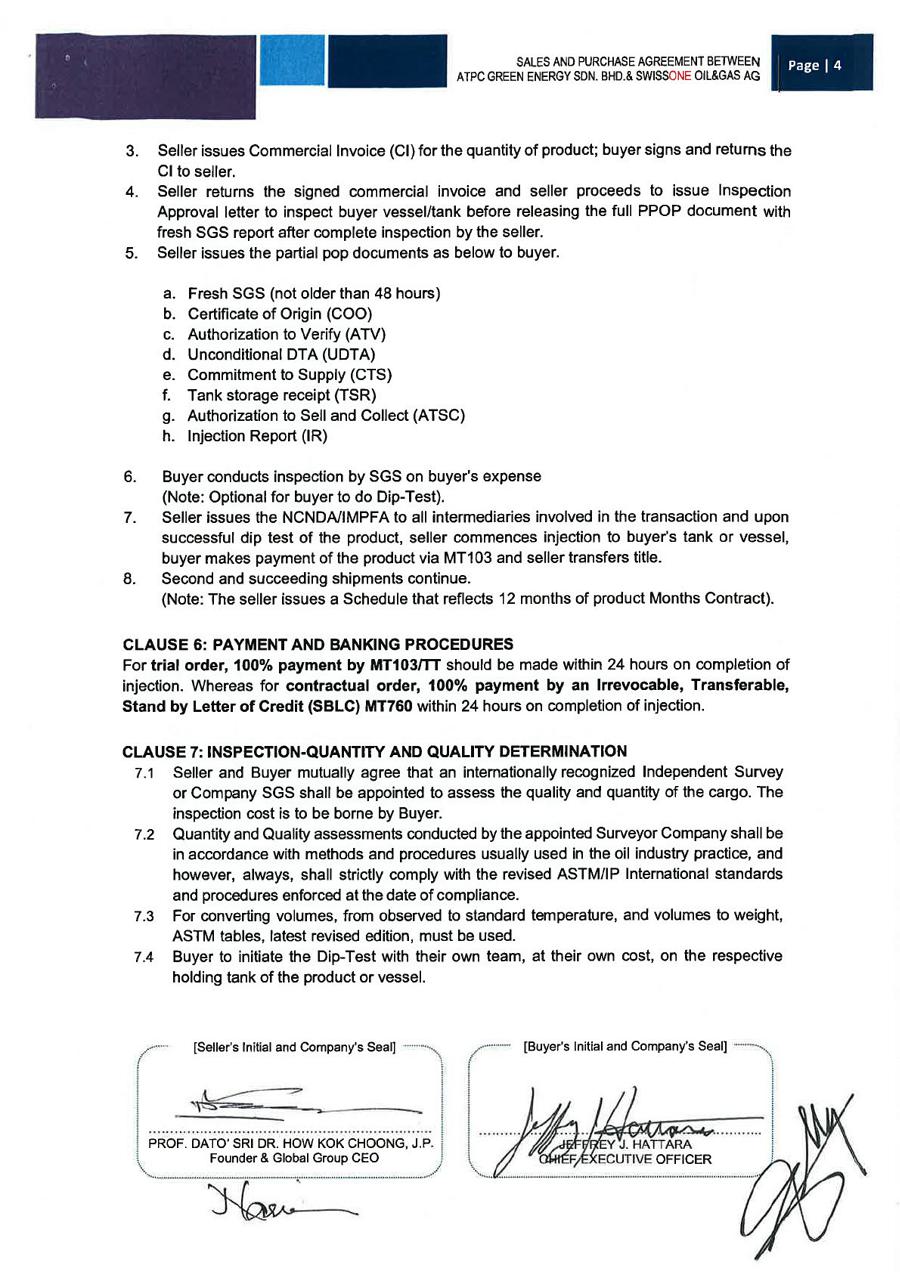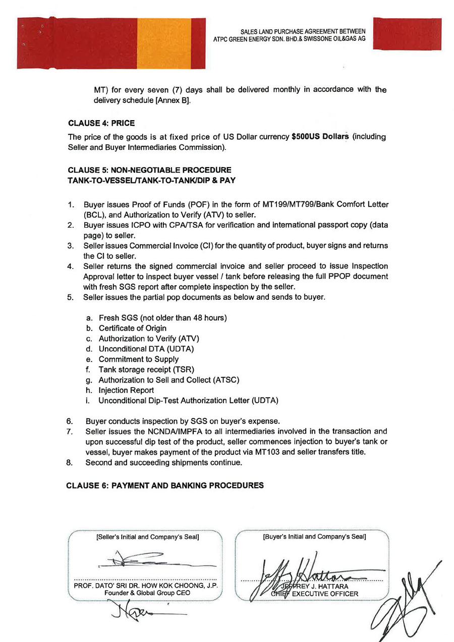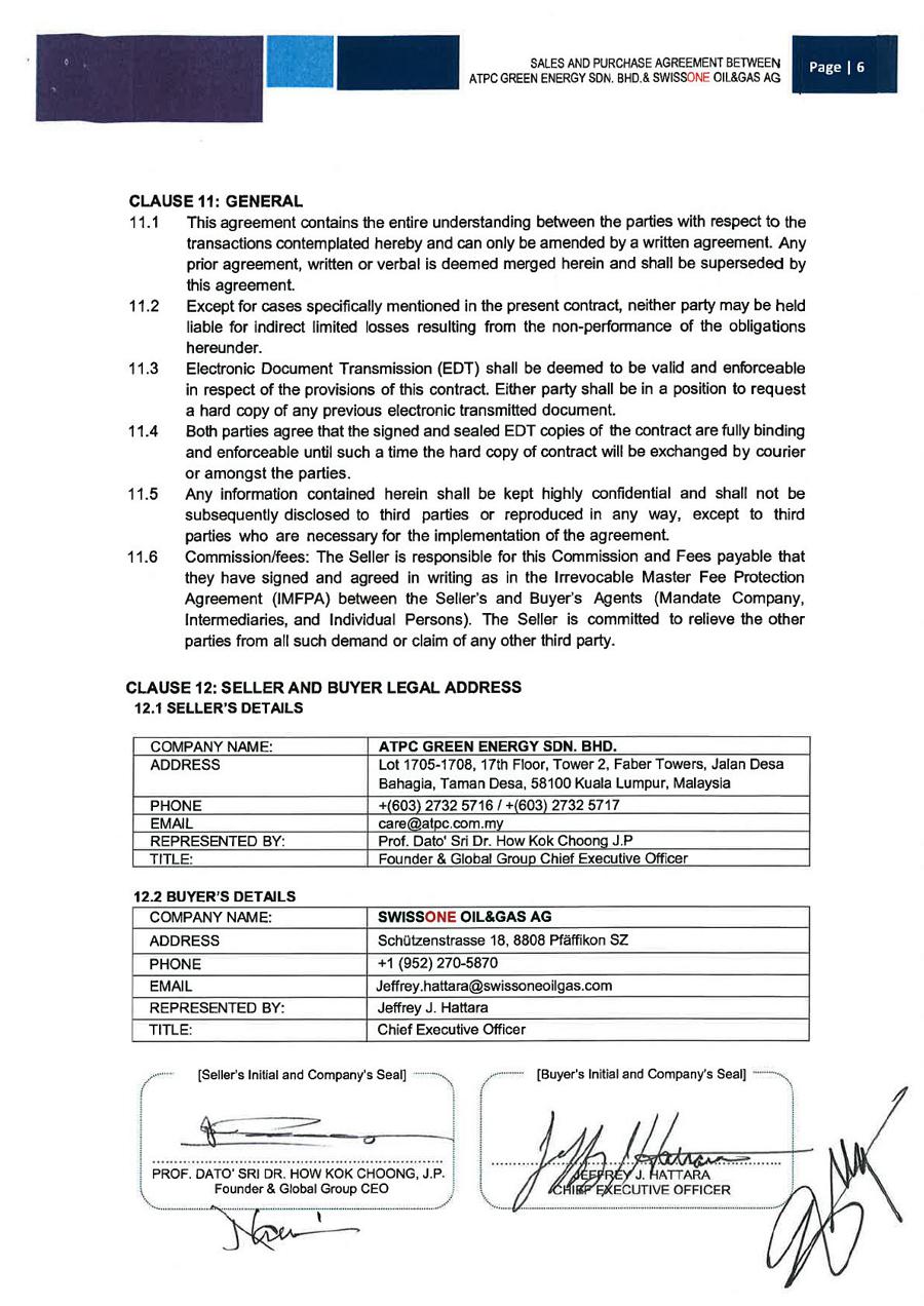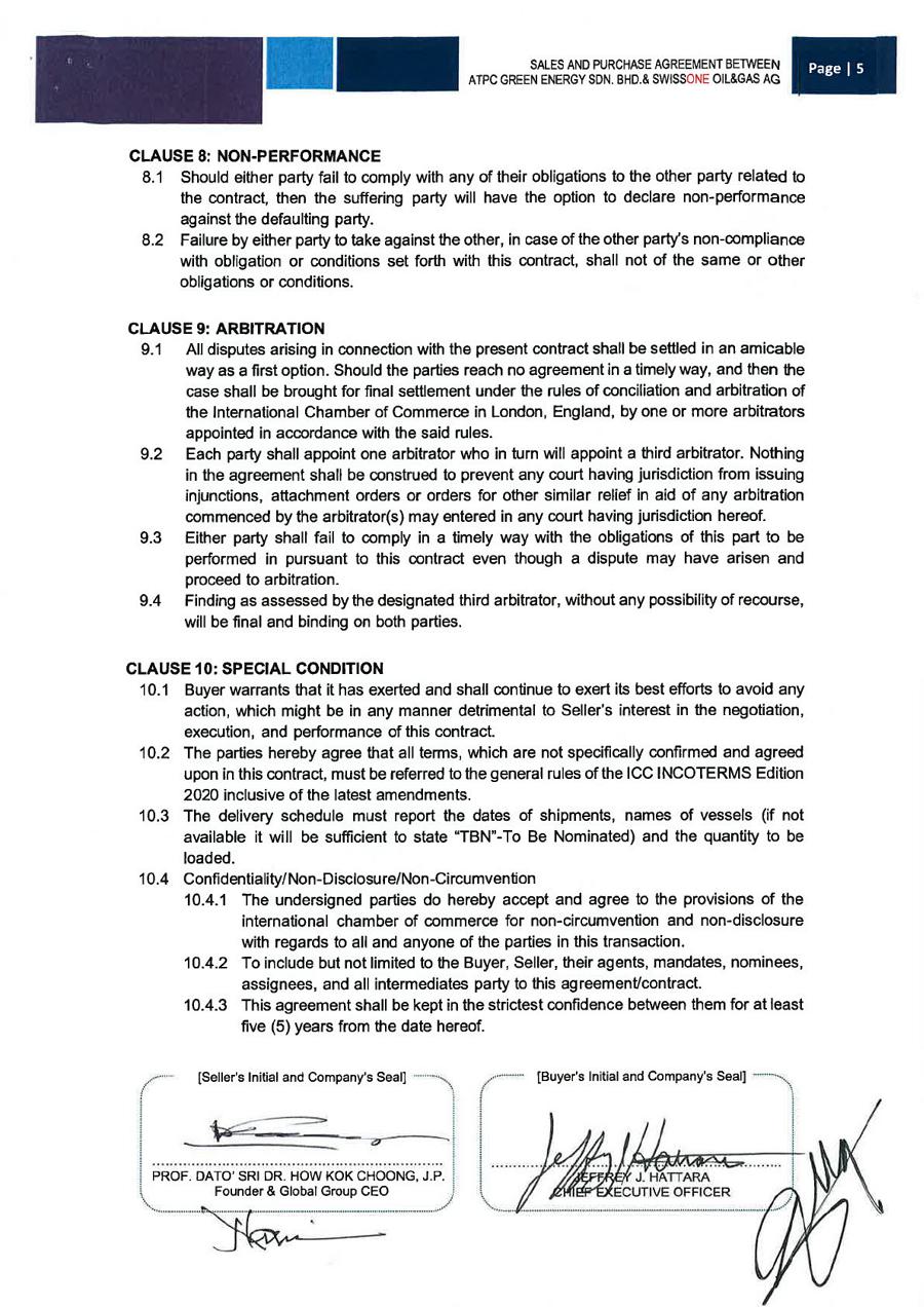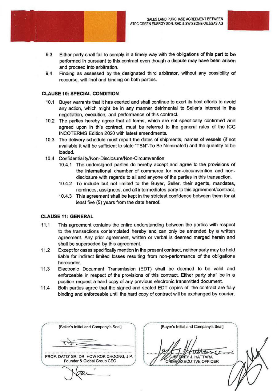 | 99.4 | Form of Sales and Purchase Agreement between ATPC Green Energy Sdn. Bhd. and Swiss One Oil & Gas AG for EN590 10PPM Diesel | |