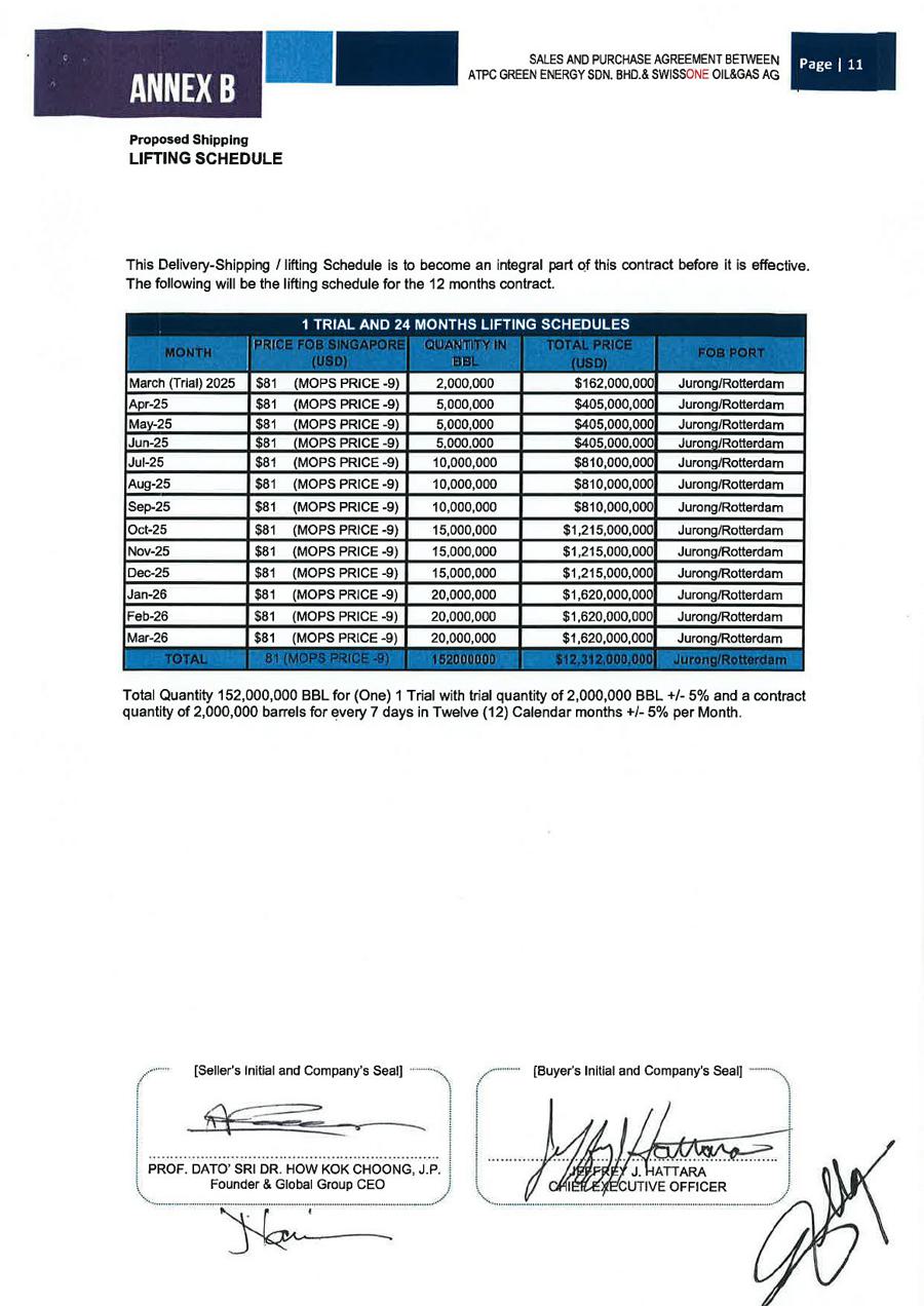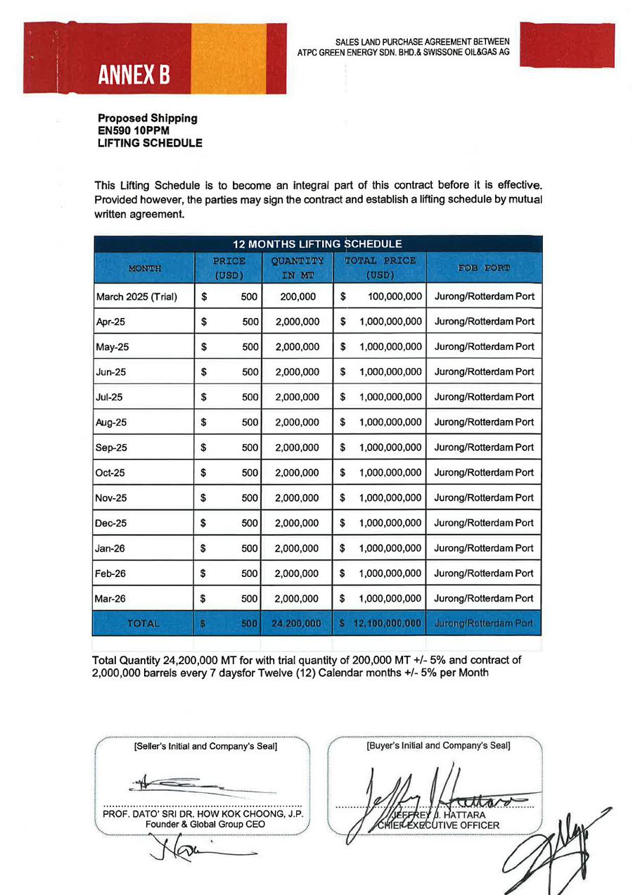 Under the terms of the SPAs, ATPC Green Energy will supply EN590 10PPM diesel and Jet Fuel A1 to Swiss One over a 12-month period plus rolls and extensions, with an initial trial order comprising 200,000 metric tonnes of EN590 10PPM diesel and 2 million barrels of Jet Fuel A1. The trial shipment is scheduled to commence in March 2025. Upon successful completion of the trial, the contract will transition into full-scale supply, with weekly deliveries of 500,000 metric tonnes of EN590 10PPM diesel and 2 million barrels of Jet Fuel A1 to meet growing global demand.