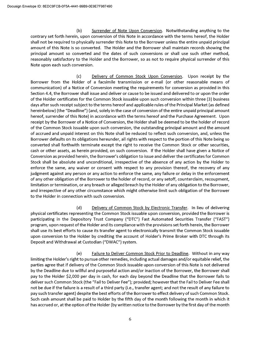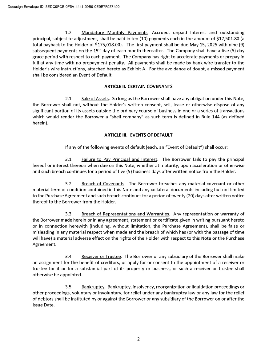 Upon the occurrence and during the continuation of any Event of Default, the Note shall become immediately due and payable and the Company will be obligated to pay to the Lender, in full satisfaction of its obligations, an amount equal to 150% times the sum of (w) the then outstanding principal amount of the Note plus (x) accrued and unpaid interest on the unpaid principal amount of the Note to the date of payment plus (y) default interest, if any, at the rate of 22% per annum on the amounts referred to in clauses (w) and/or (x) plus (z) any amounts owed to the Lender pursuant to the conversion rights referenced below.