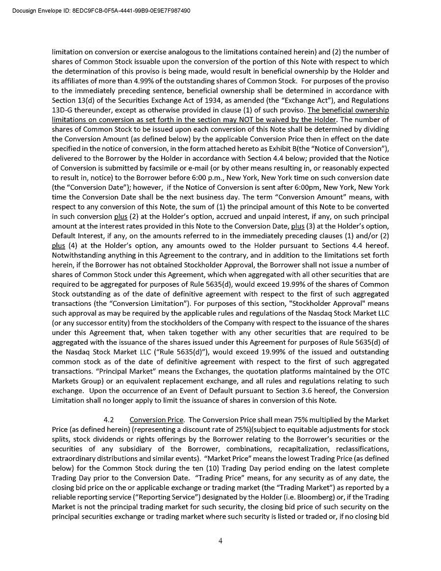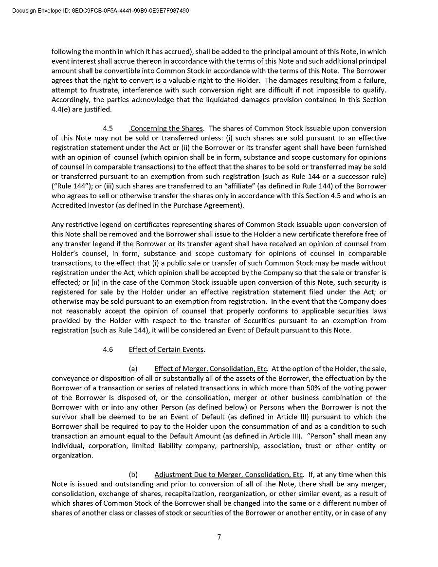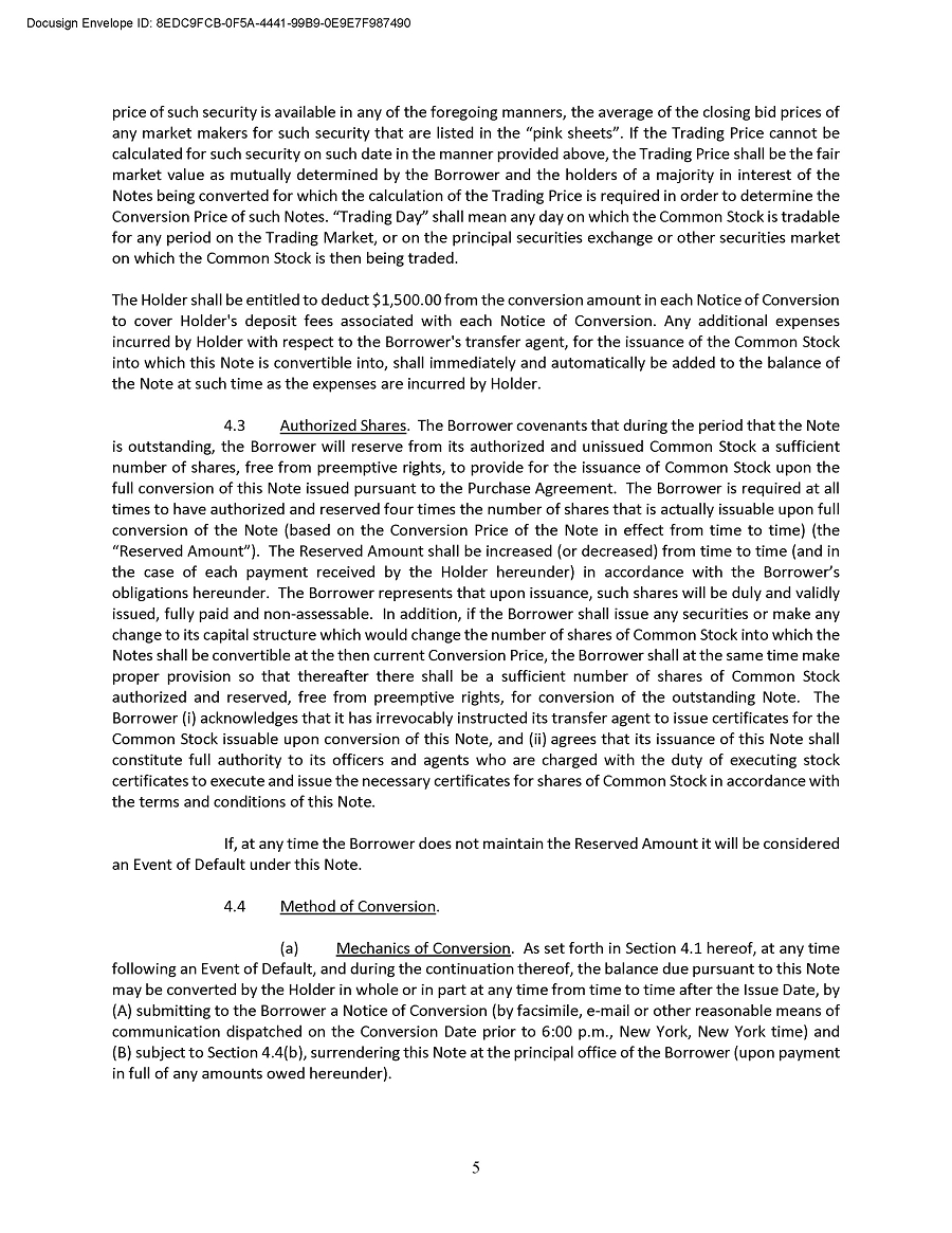 Only upon an occurrence of an event of default under the Note, the Lender may convert the outstanding unpaid principal amount of the Note into restricted shares of common stock of the Company at a discount of 25% of the market price. The Lender agreed to limit the amount of stock received to less than 4.99% of the total outstanding common stock. There are no warrants or other derivatives attached to this Note. The Company agreed to reserve a number of shares of common stock equal to four times the number of shares of common stock which may be issuable upon conversion of the Note at all times.