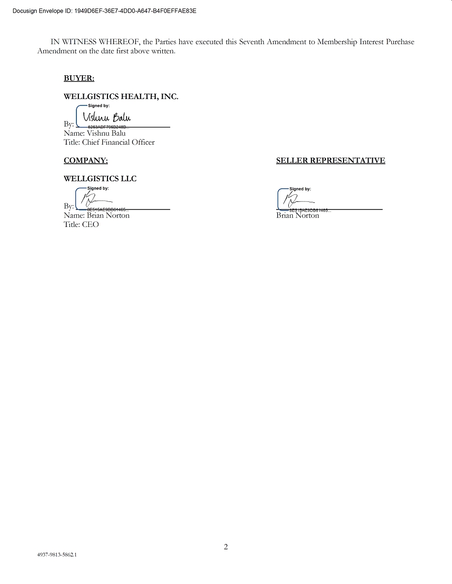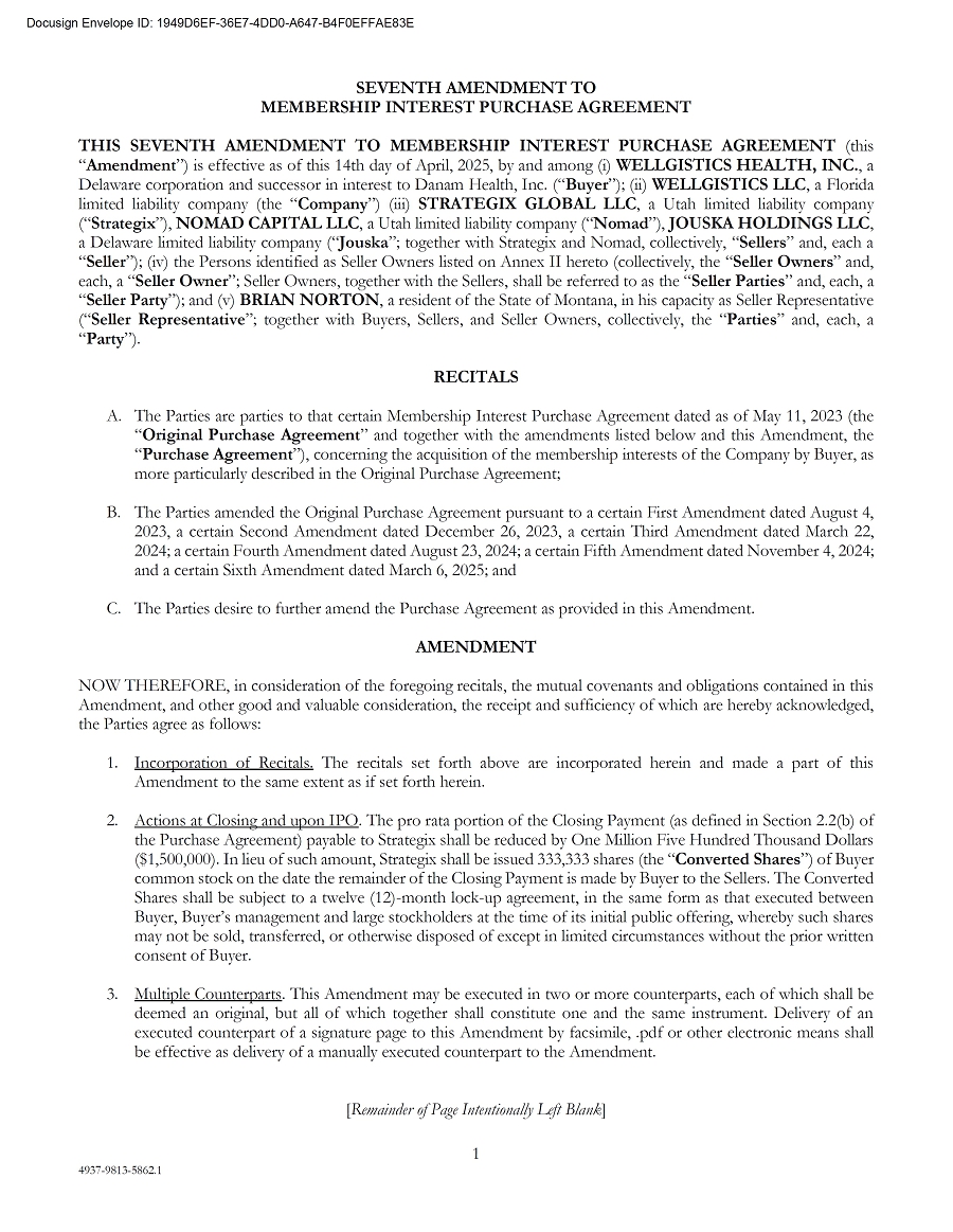 | 2.1 | Seventh Amendment to Membership Interest Purchase Agreement dated May 11, 2023, by and among Wellgistics Health, Inc. (f/k/a Danam Health, Inc.), Wellgistics, LLC, Strategix Global LLC, Nomad Capital LLC, Jouska Holdings LLC, and Brian Norton, as amended. | |
