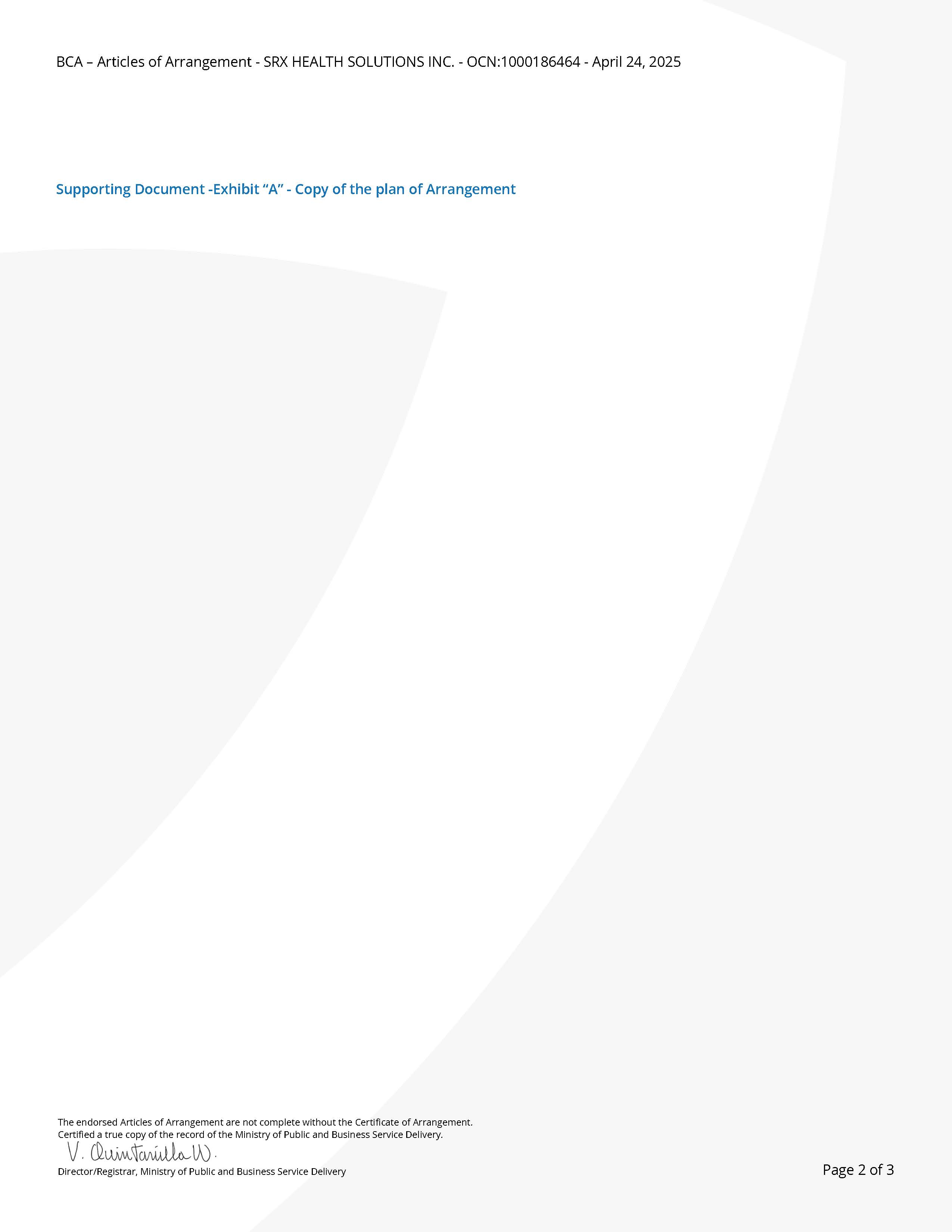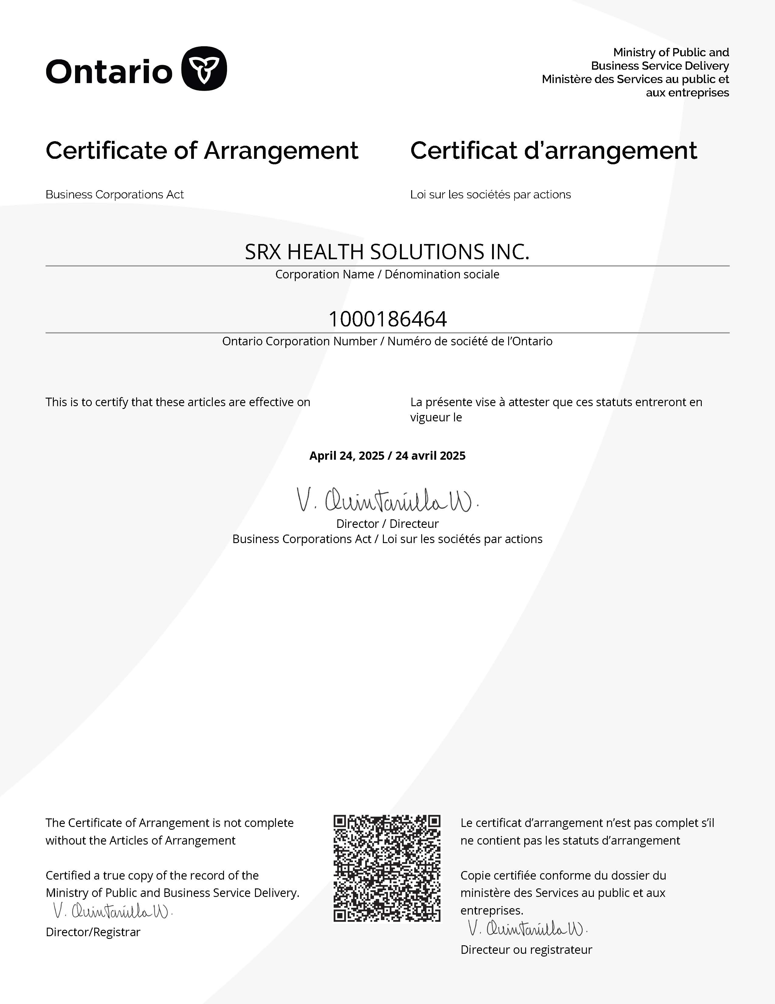 1. The name of the corporation is: SRX Health Solutions, Inc. (the “Company”).