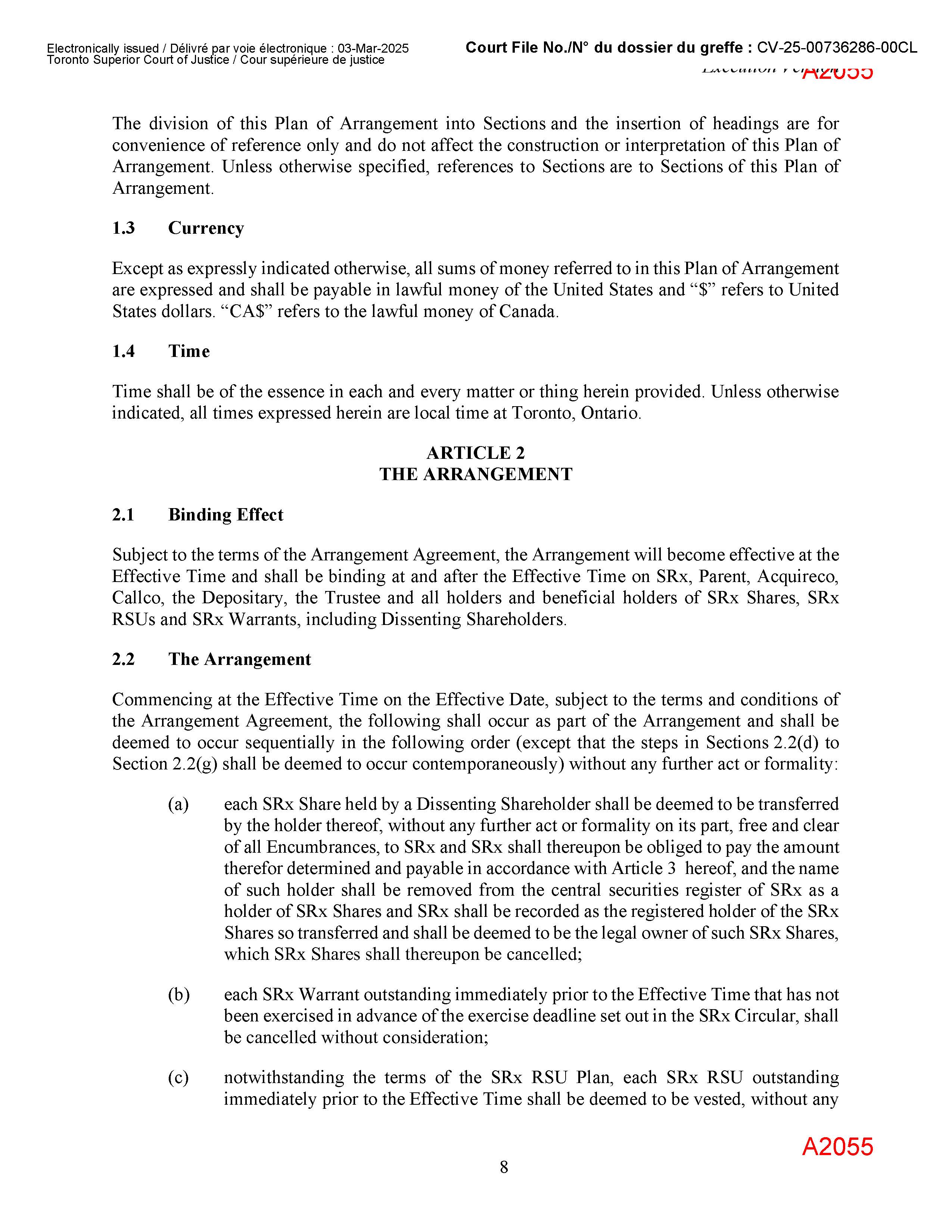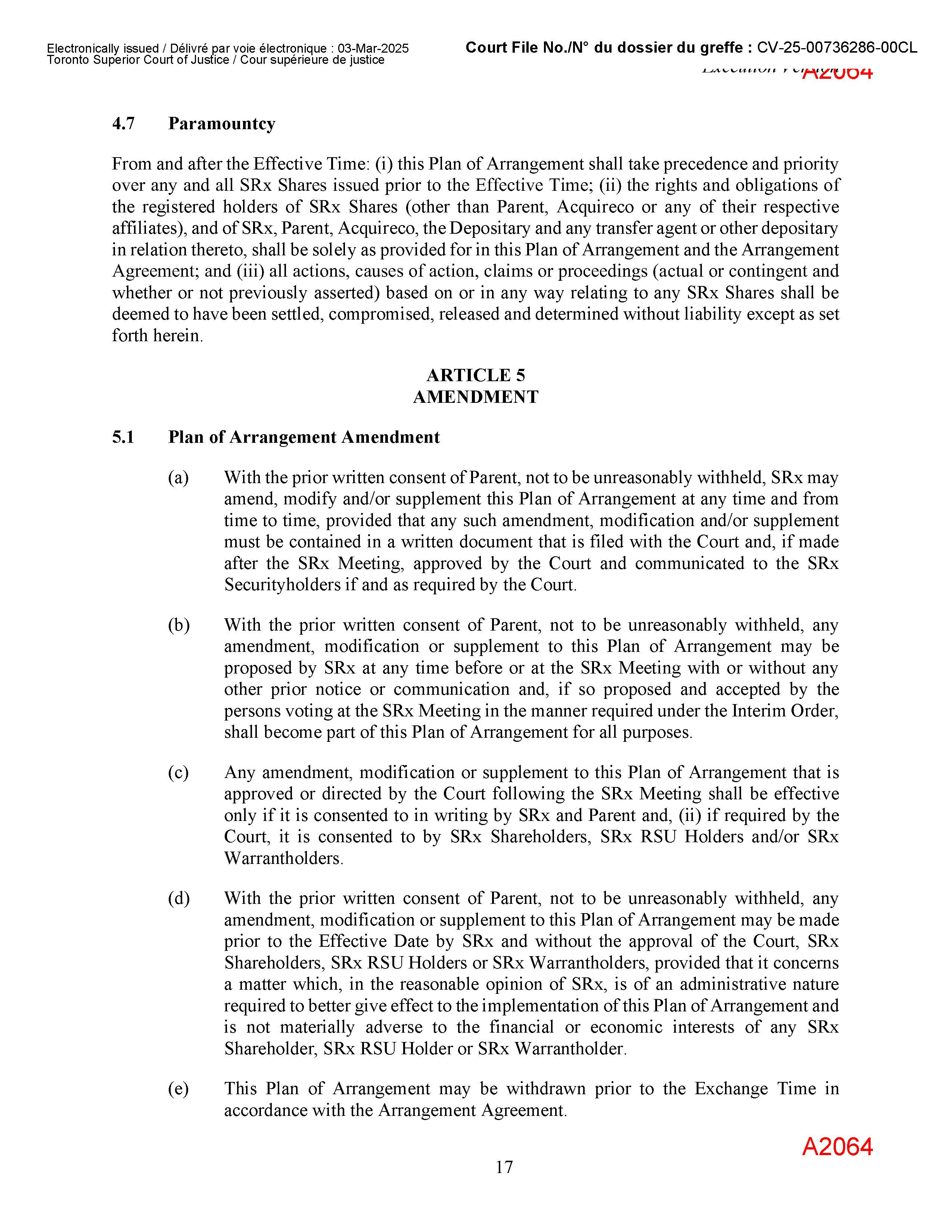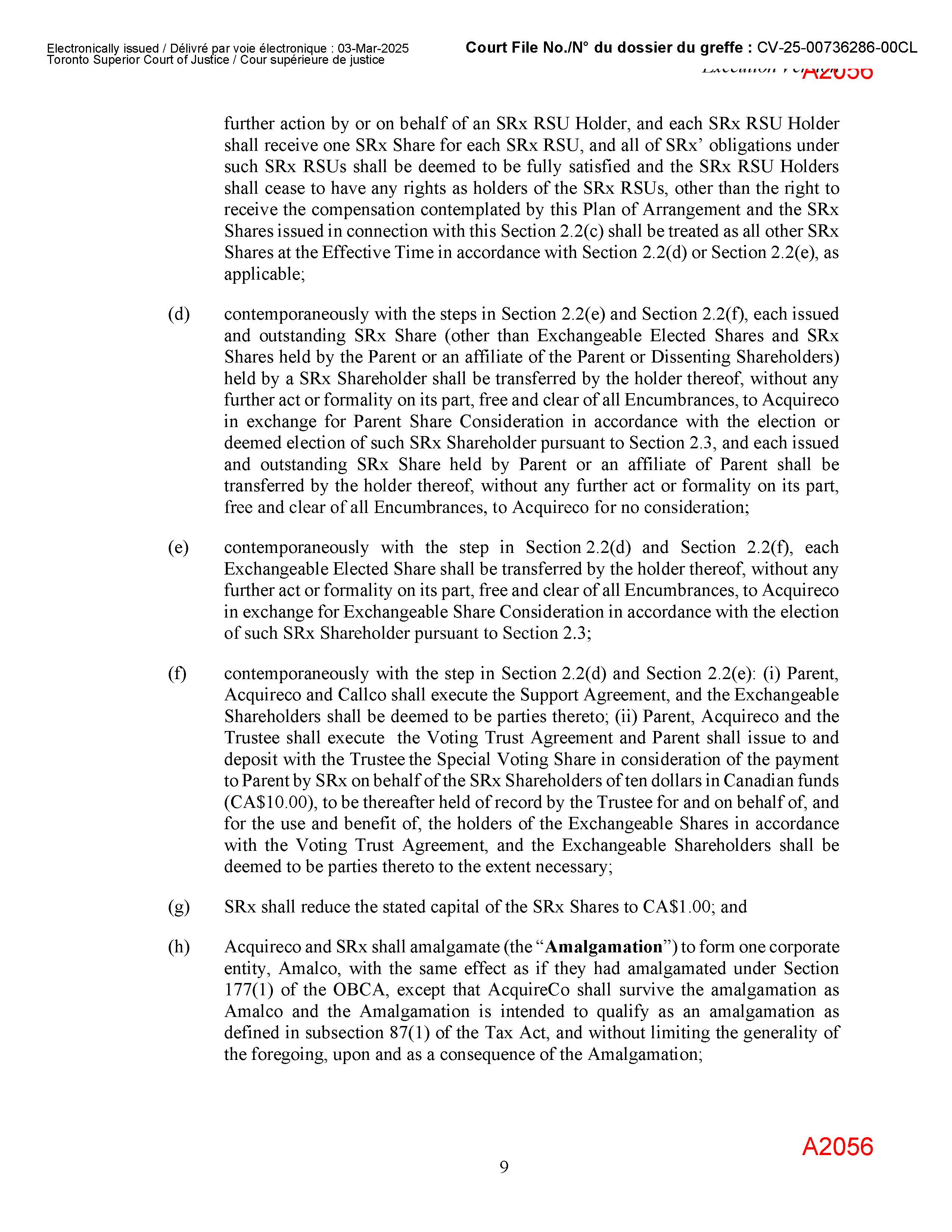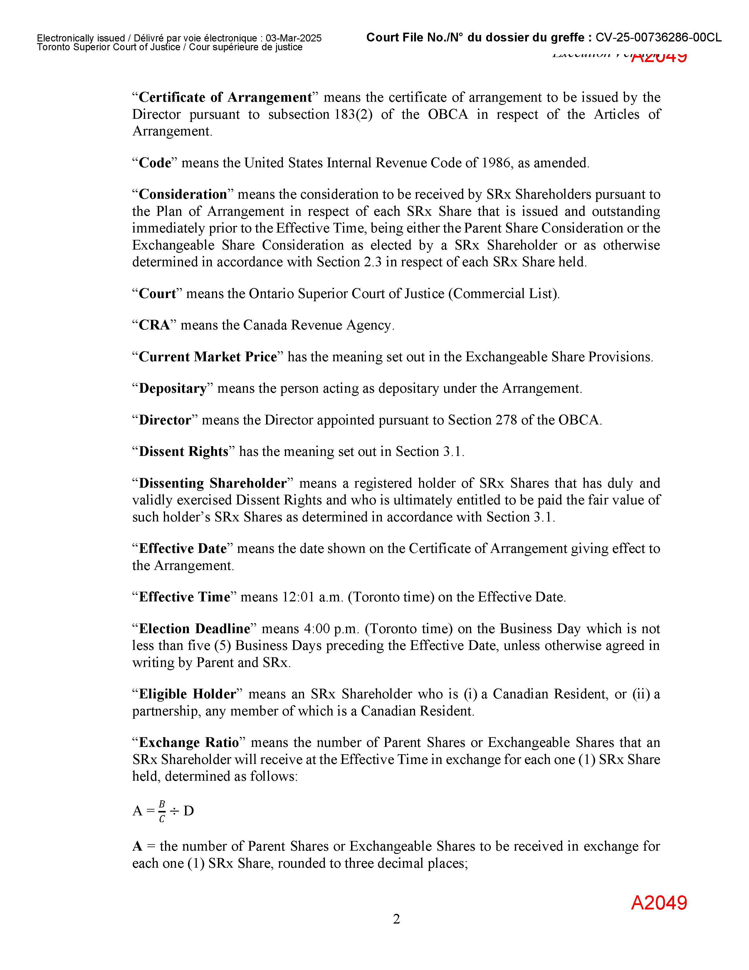 Pursuant to the Arrangement Agreement, on the Closing Date, AcquireCo, a wholly-owned subsidiary of Predecessor, merged with and into SRx Health, with SRx Health remaining as the surviving entity. Predecessor acquired the business of SRx Health pursuant to the Merger and will continue the existing business operations of SRx Health as a wholly-owned subsidiary.