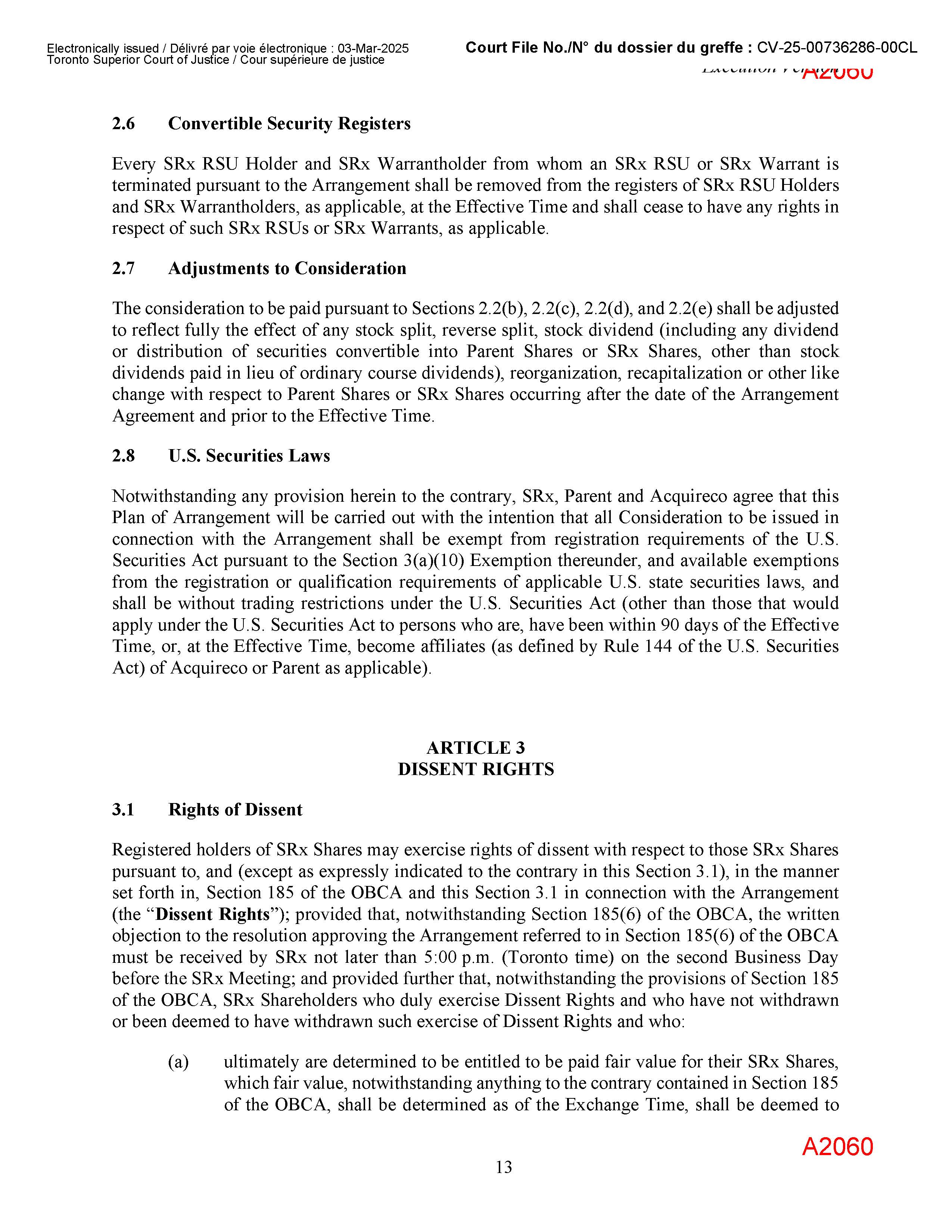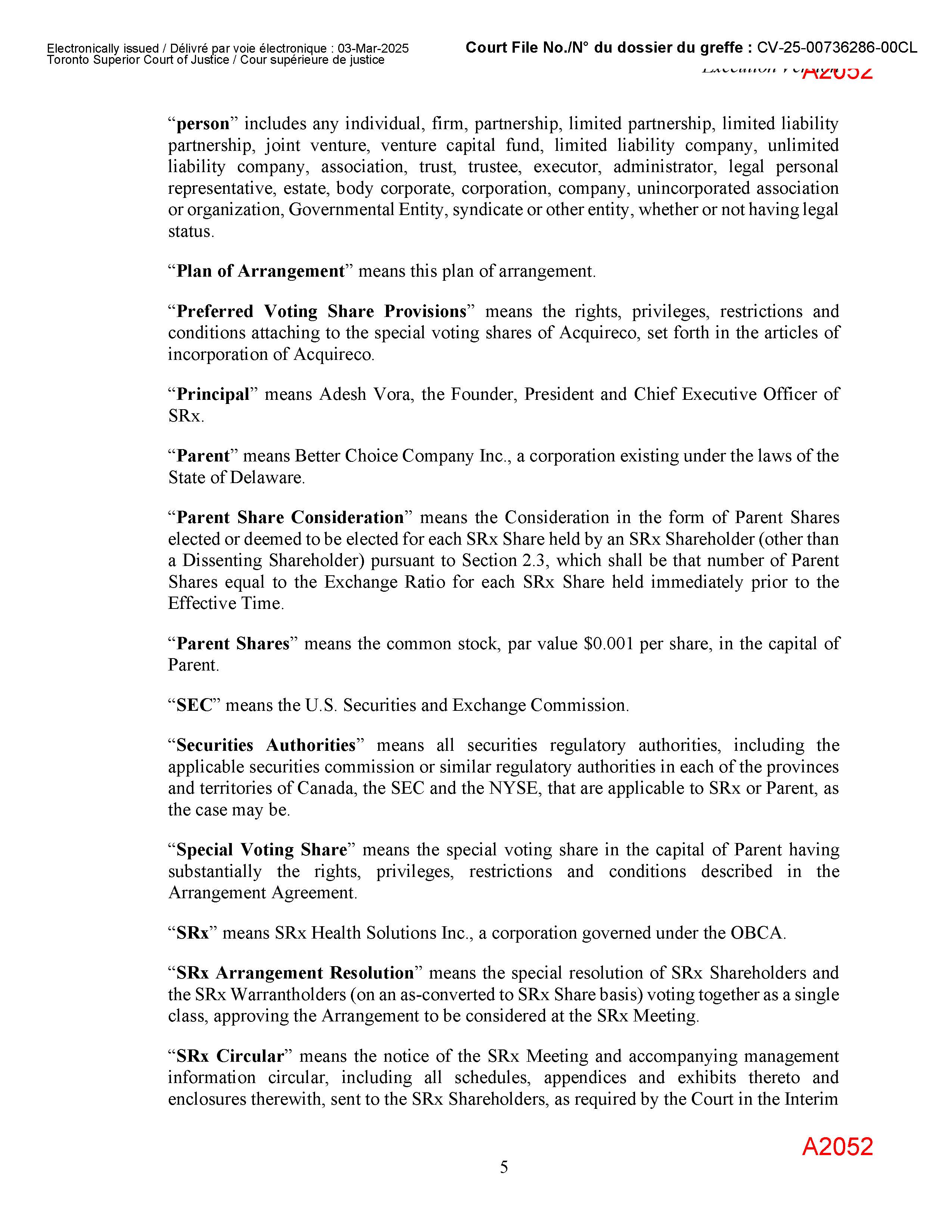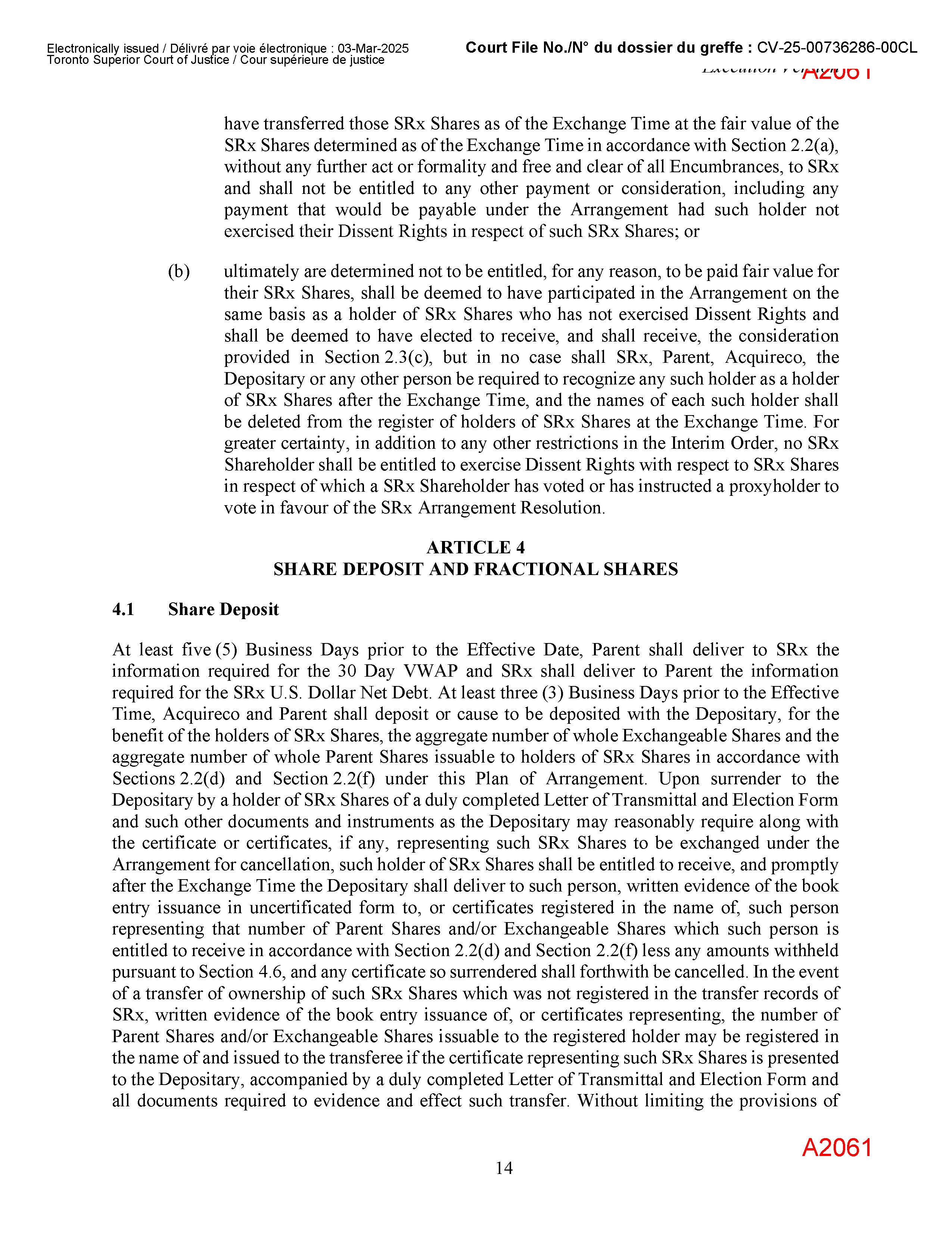 Pursuant to the Arrangement Agreement, on the Closing Date, AcquireCo, a wholly-owned subsidiary of Predecessor, merged with and into SRx Health, with SRx Health remaining as the surviving entity. Predecessor acquired the business of SRx Health pursuant to the Merger and will continue the existing business operations of SRx Health as a wholly-owned subsidiary.