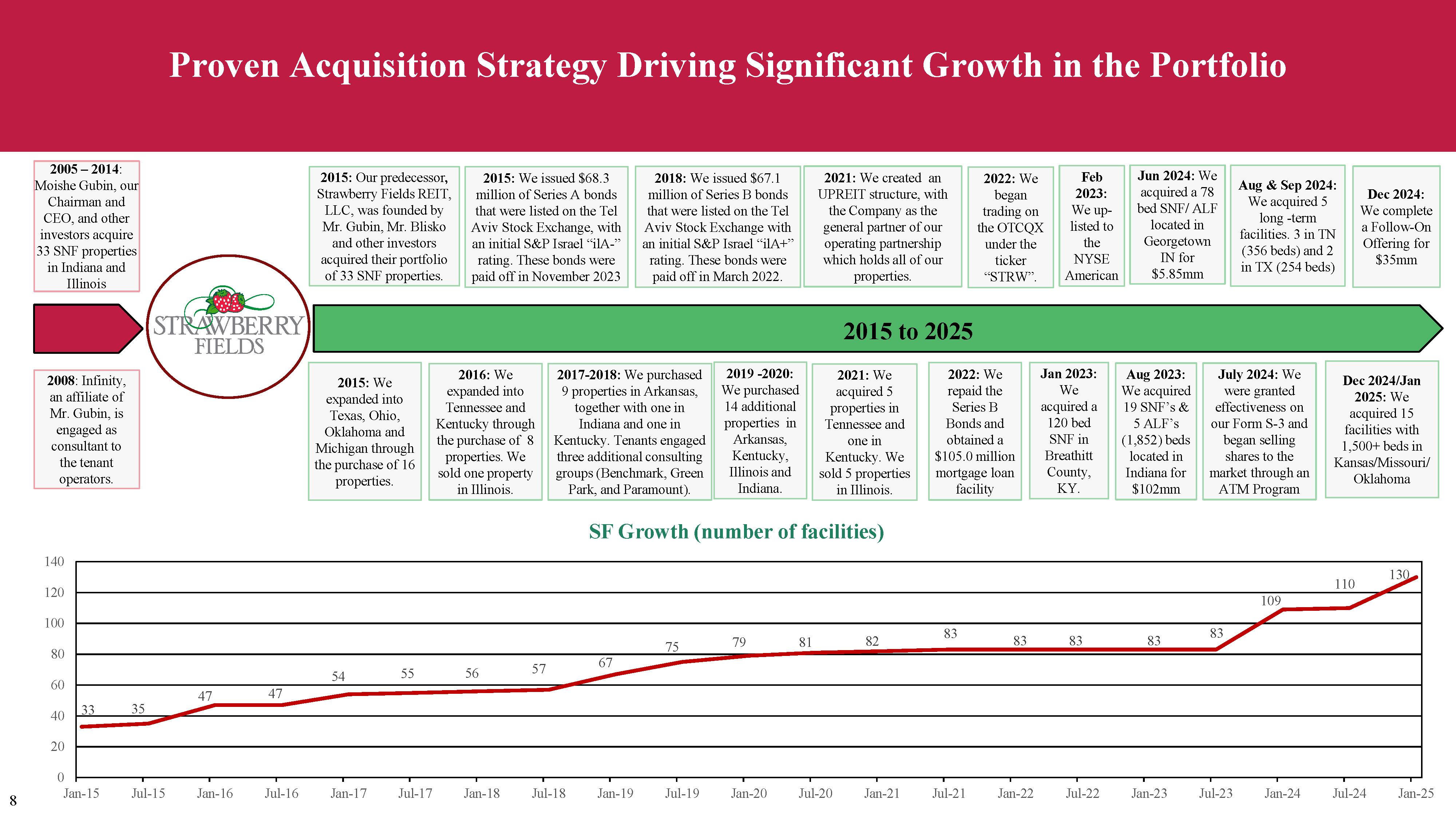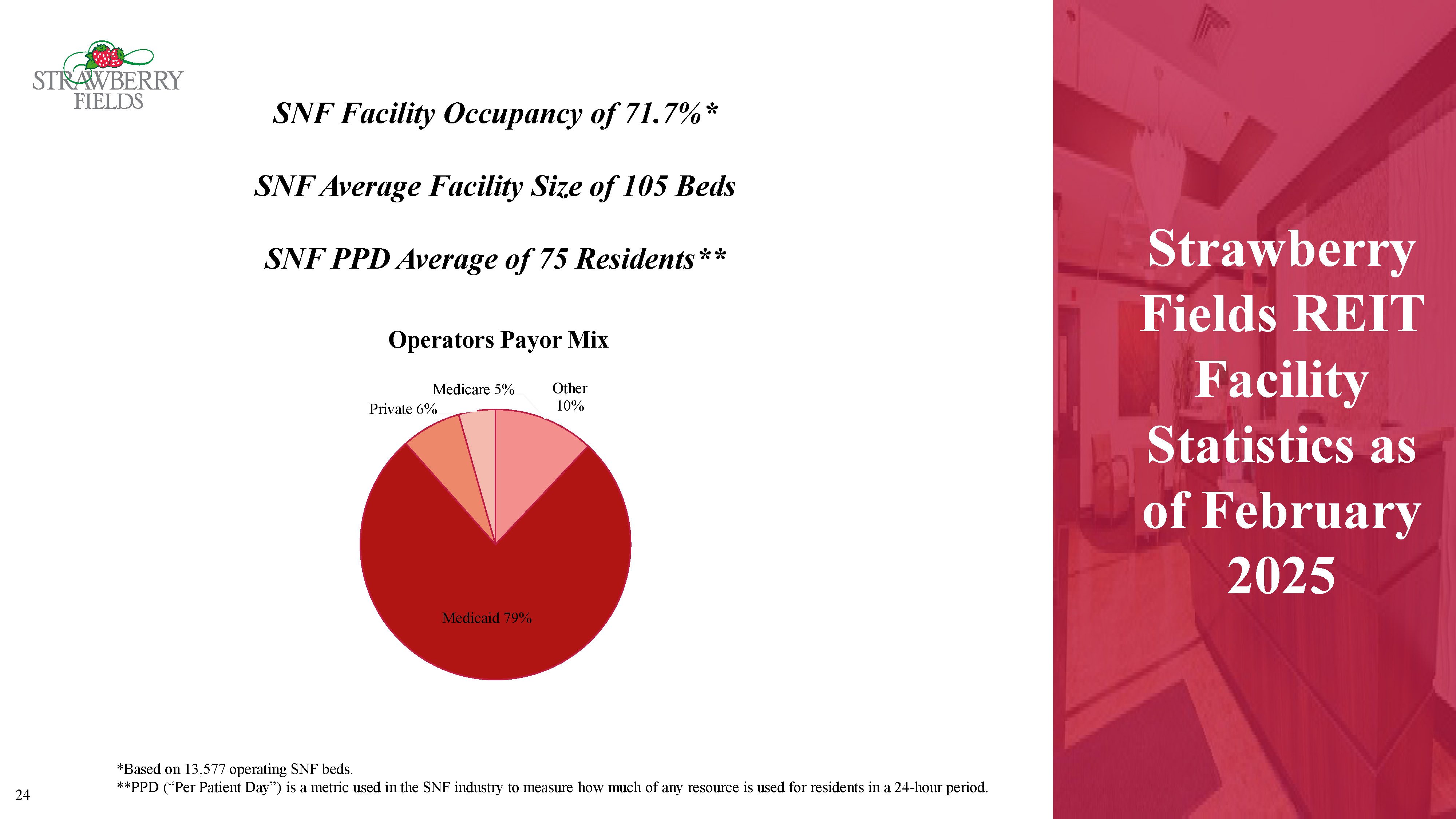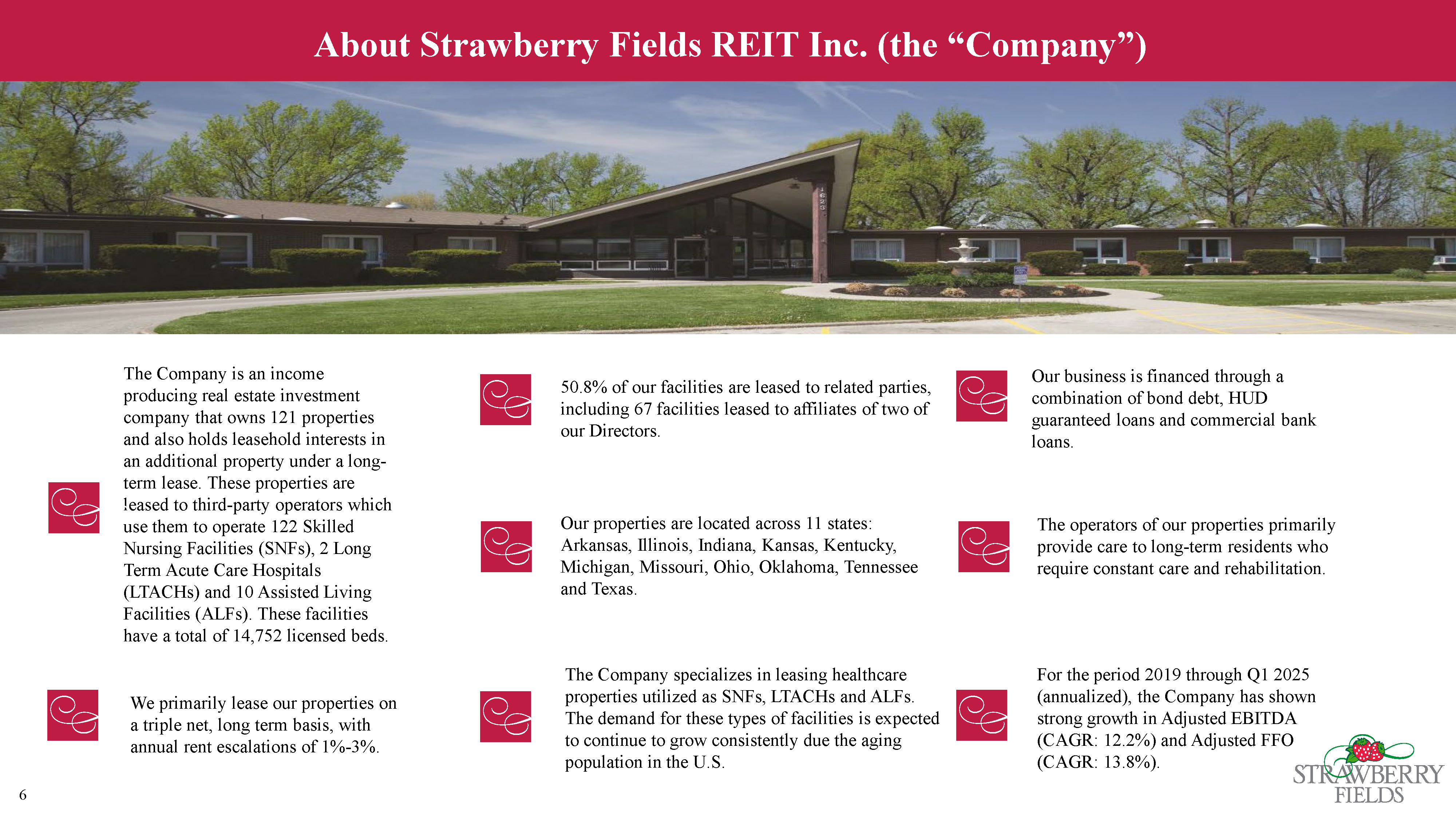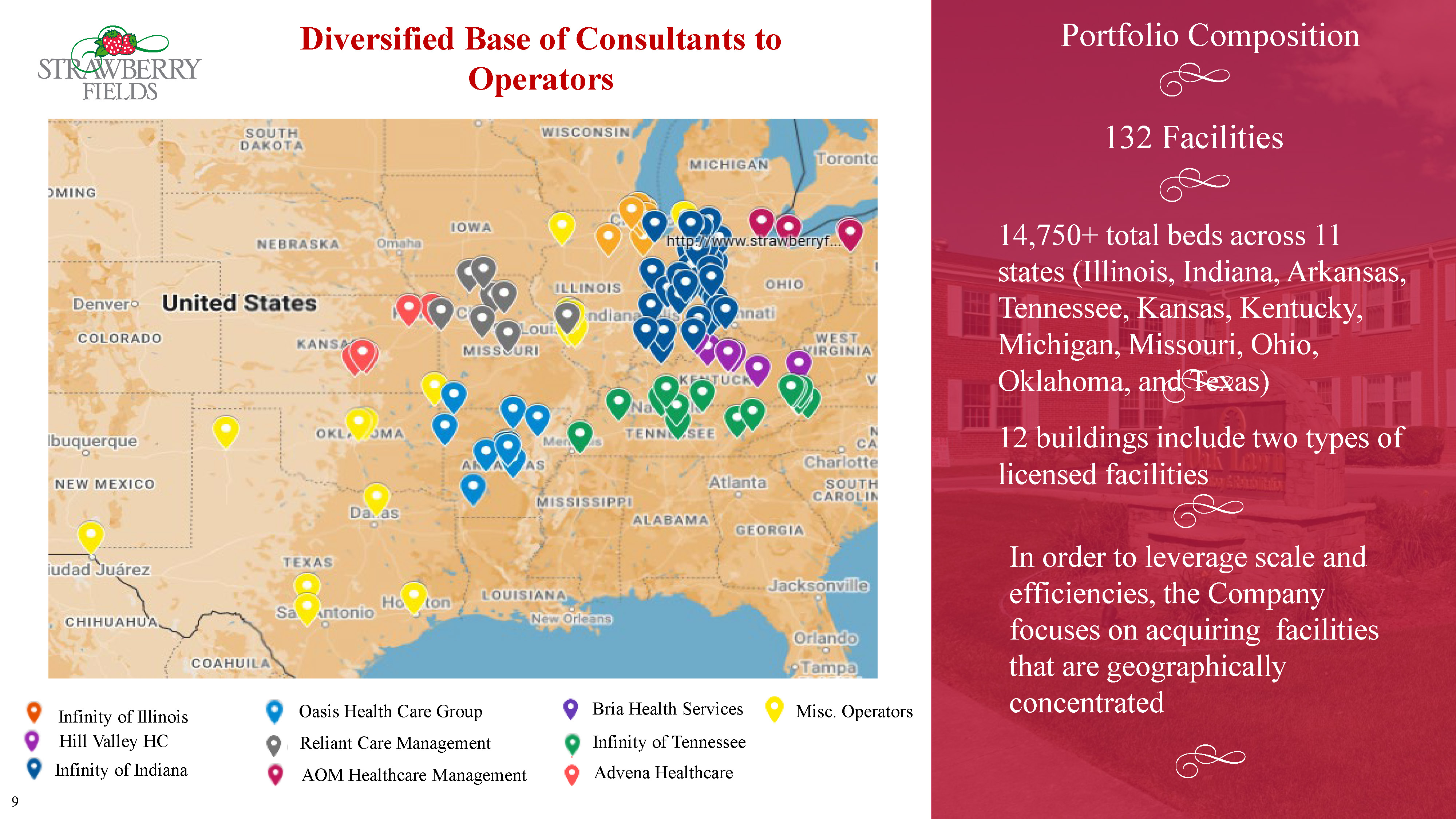 Strawberry Fields REIT, Inc., is a self-administered real estate investment trust engaged in the ownership, acquisition, development and leasing of skilled nursing and certain other healthcare- related properties. The Company’s portfolio includes 132 healthcare facilities with an aggregate of 14,750+ bed, located throughout the states of Arkansas, Illinois, Indiana, Kansas, Kentucky, Michigan, Missouri, Ohio, Oklahoma, Tennessee and Texas. The 132 healthcare facilities comprise 122 skilled nursing facilities, 10 assisted living facilities, and two long-term acute care hospitals.