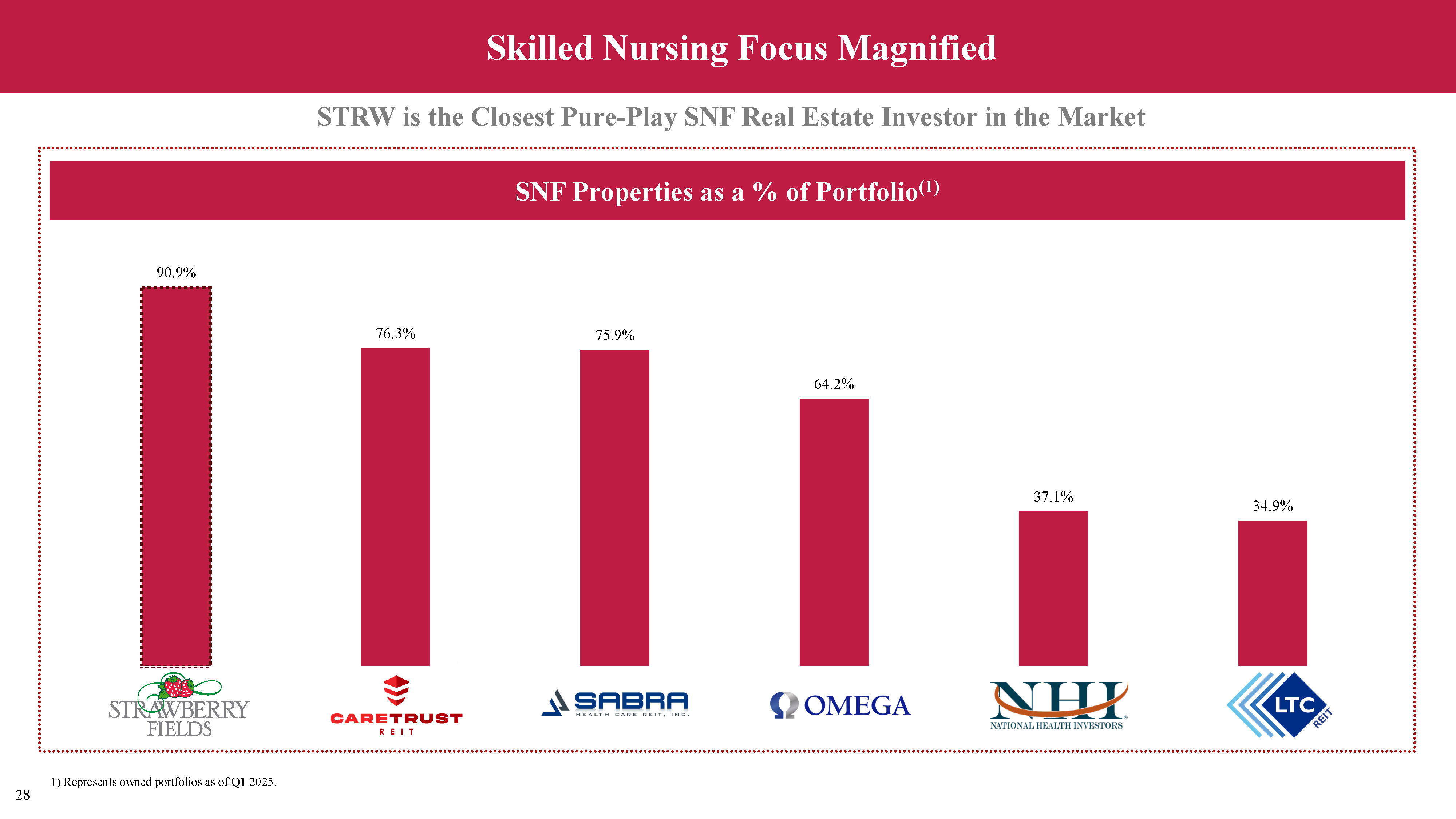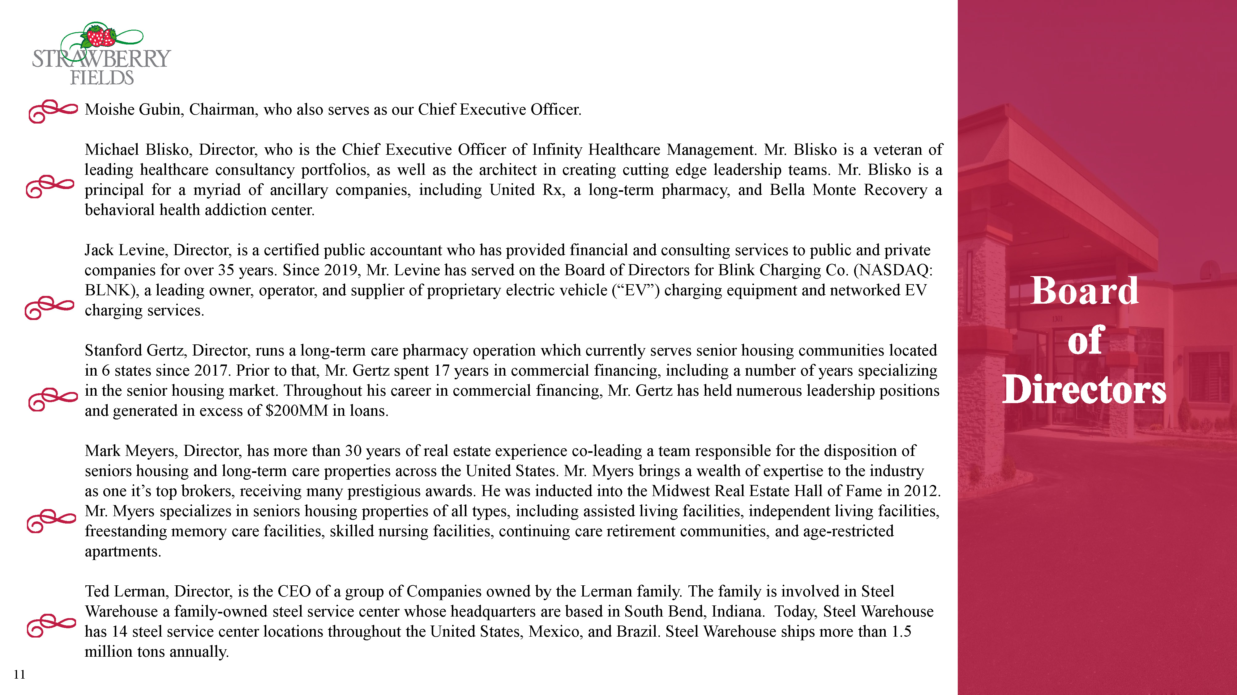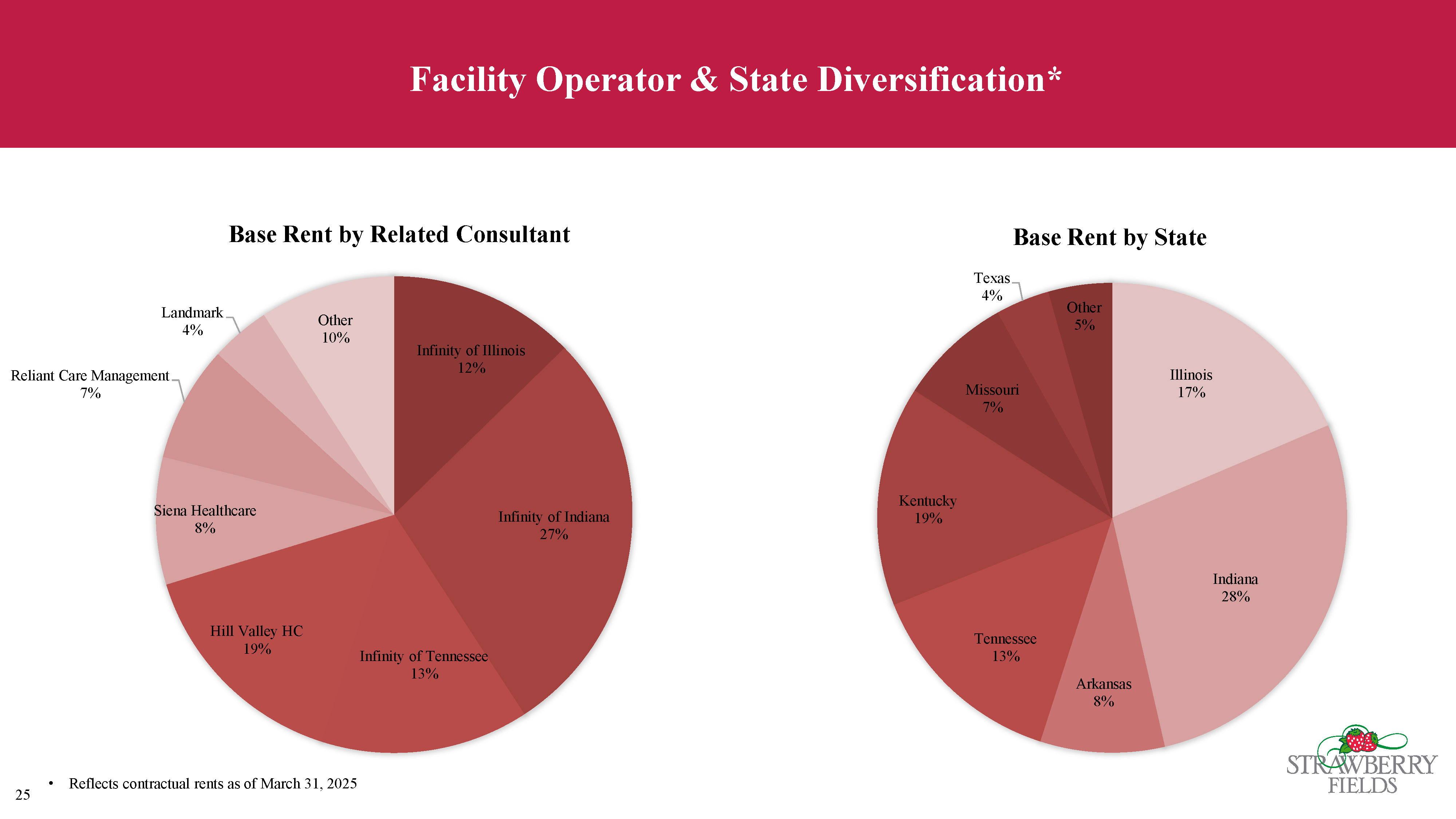 Strawberry Fields REIT, Inc., is a self-administered real estate investment trust engaged in the ownership, acquisition, development and leasing of skilled nursing and certain other healthcare- related properties. The Company’s portfolio includes 132 healthcare facilities with an aggregate of 14,750+ bed, located throughout the states of Arkansas, Illinois, Indiana, Kansas, Kentucky, Michigan, Missouri, Ohio, Oklahoma, Tennessee and Texas. The 132 healthcare facilities comprise 122 skilled nursing facilities, 10 assisted living facilities, and two long-term acute care hospitals.
