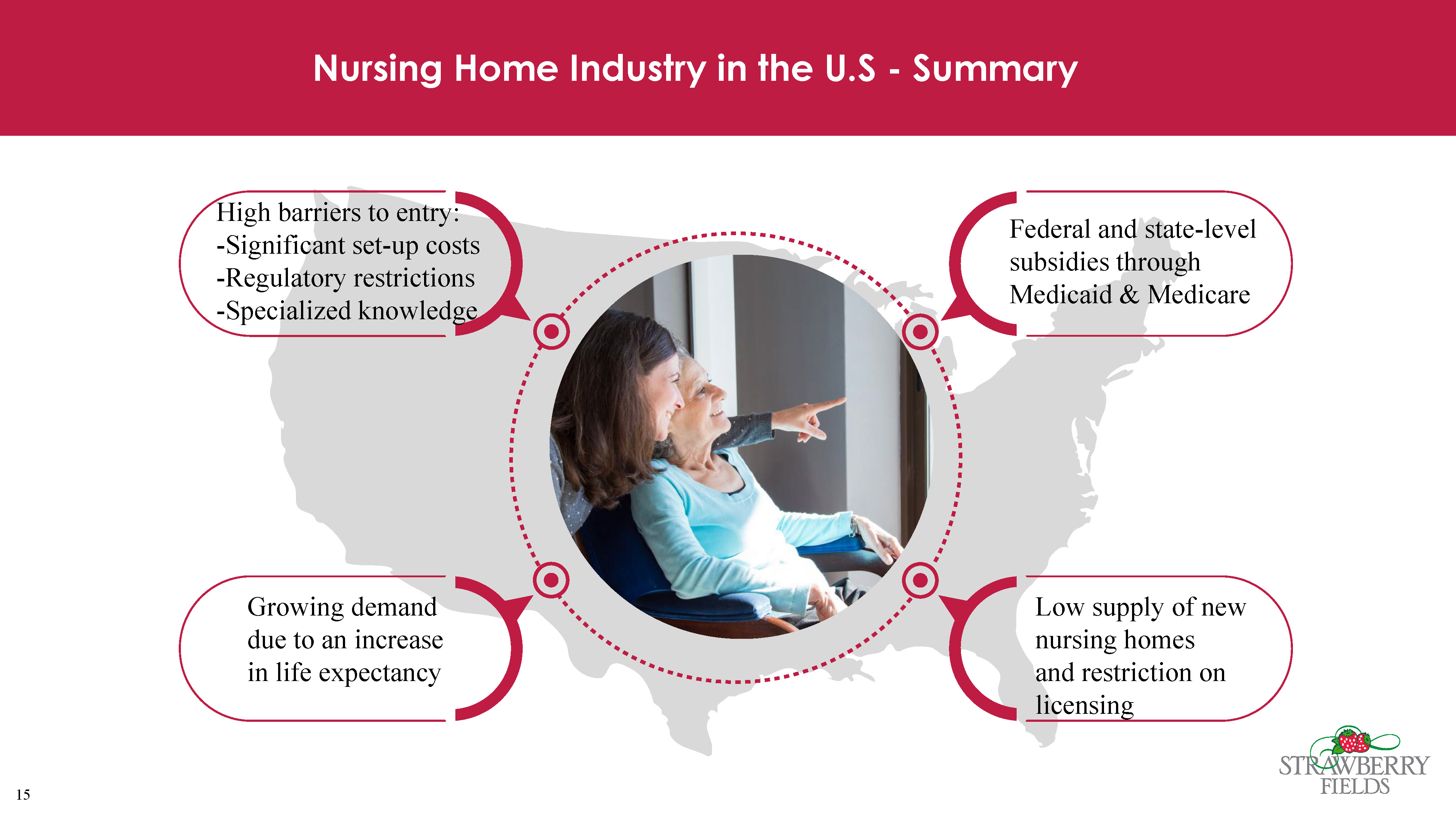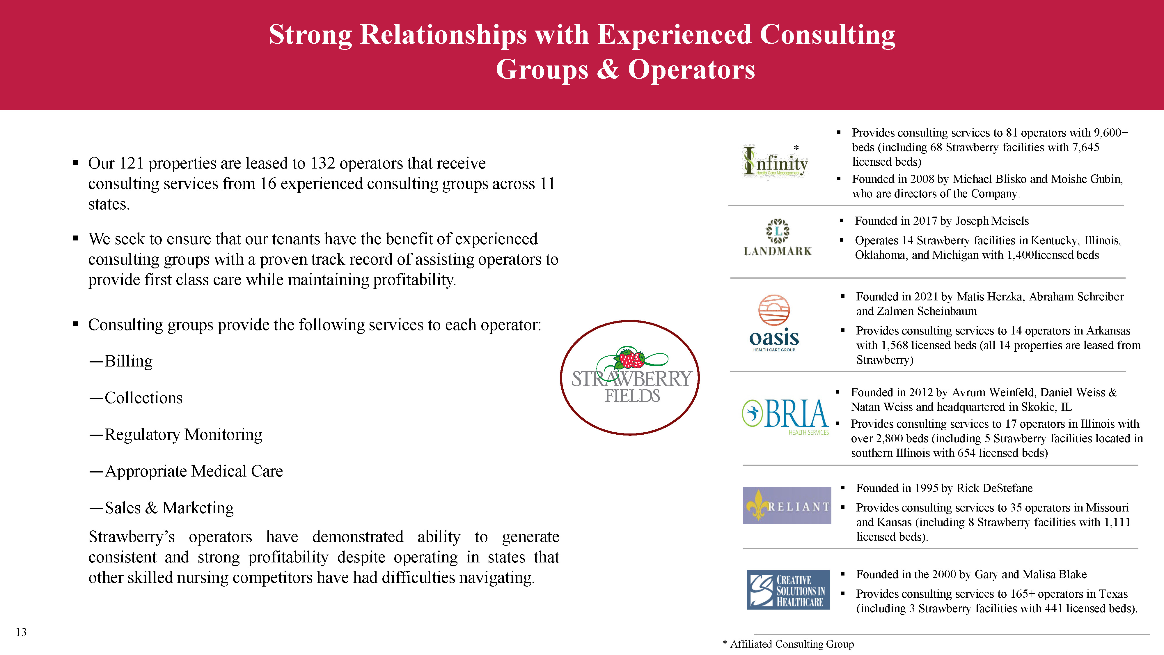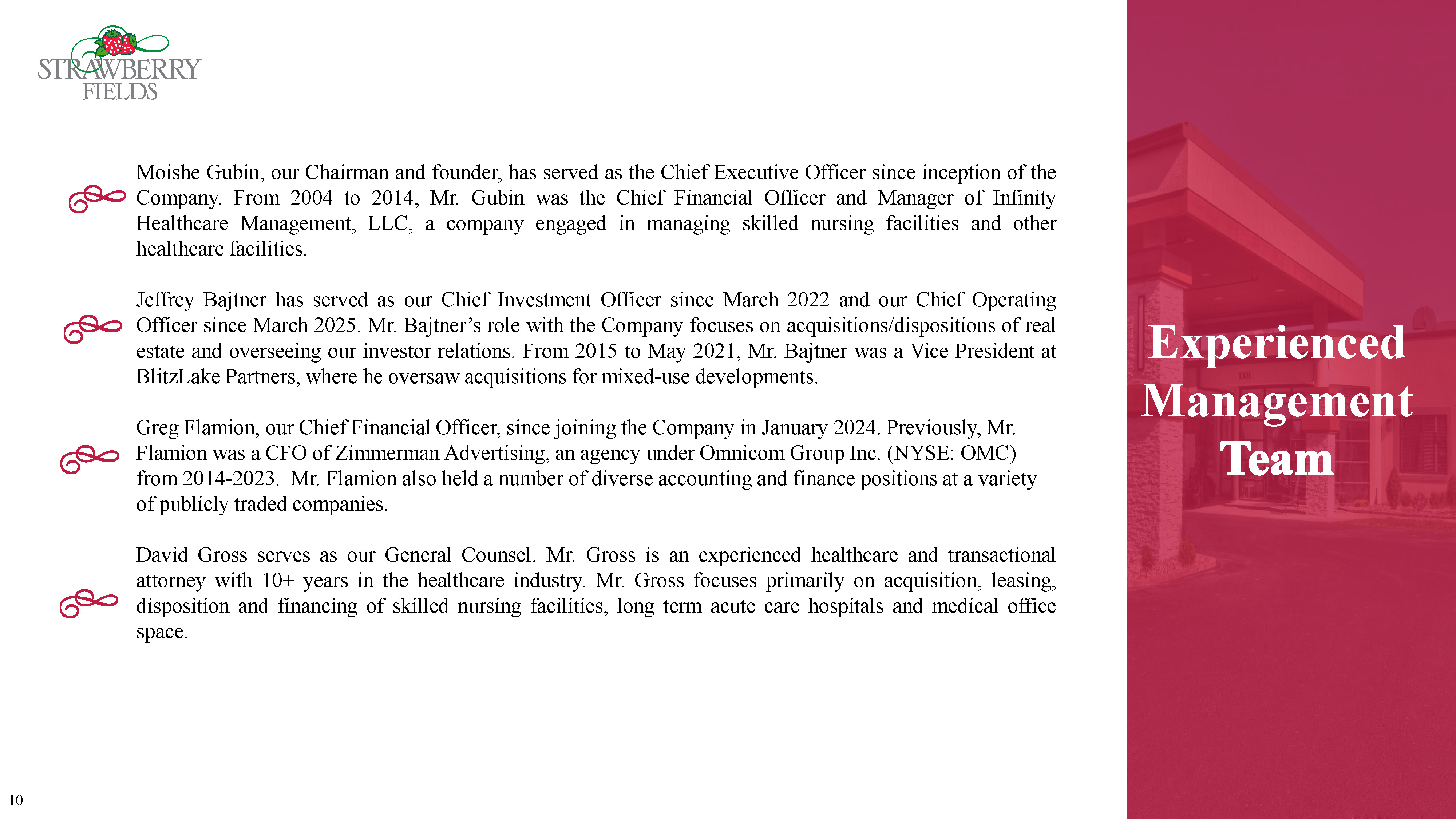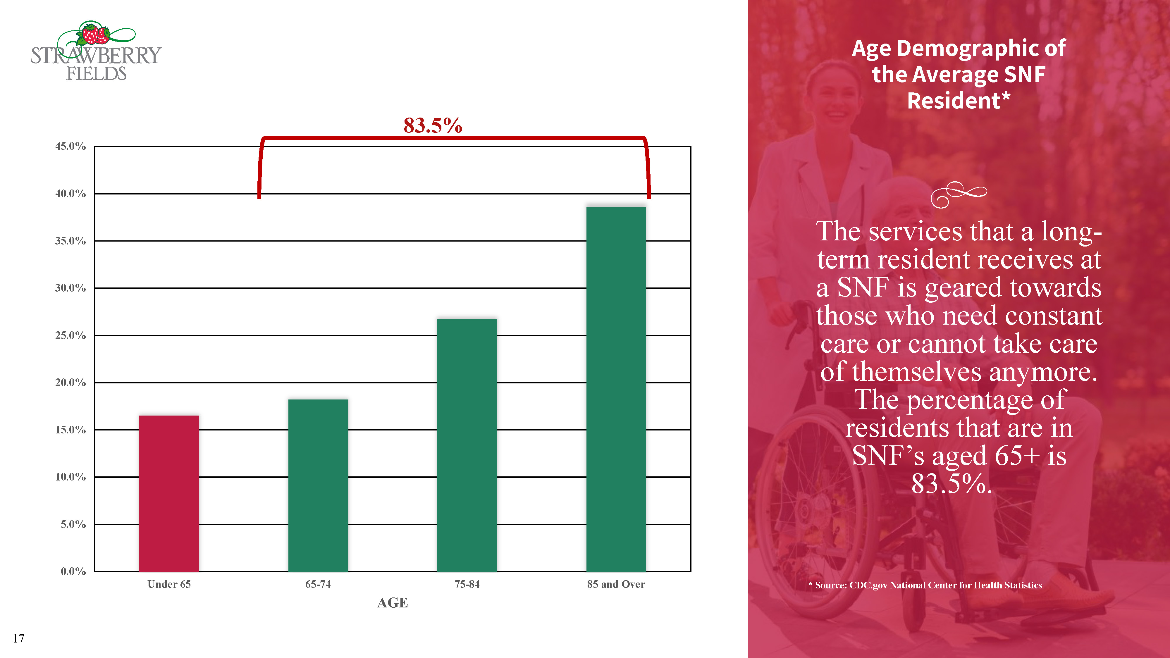 Strawberry Fields REIT, Inc., is a self-administered real estate investment trust engaged in the ownership, acquisition, development and leasing of skilled nursing and certain other healthcare- related properties. The Company’s portfolio includes 132 healthcare facilities with an aggregate of 14,750+ bed, located throughout the states of Arkansas, Illinois, Indiana, Kansas, Kentucky, Michigan, Missouri, Ohio, Oklahoma, Tennessee and Texas. The 132 healthcare facilities comprise 122 skilled nursing facilities, 10 assisted living facilities, and two long-term acute care hospitals.