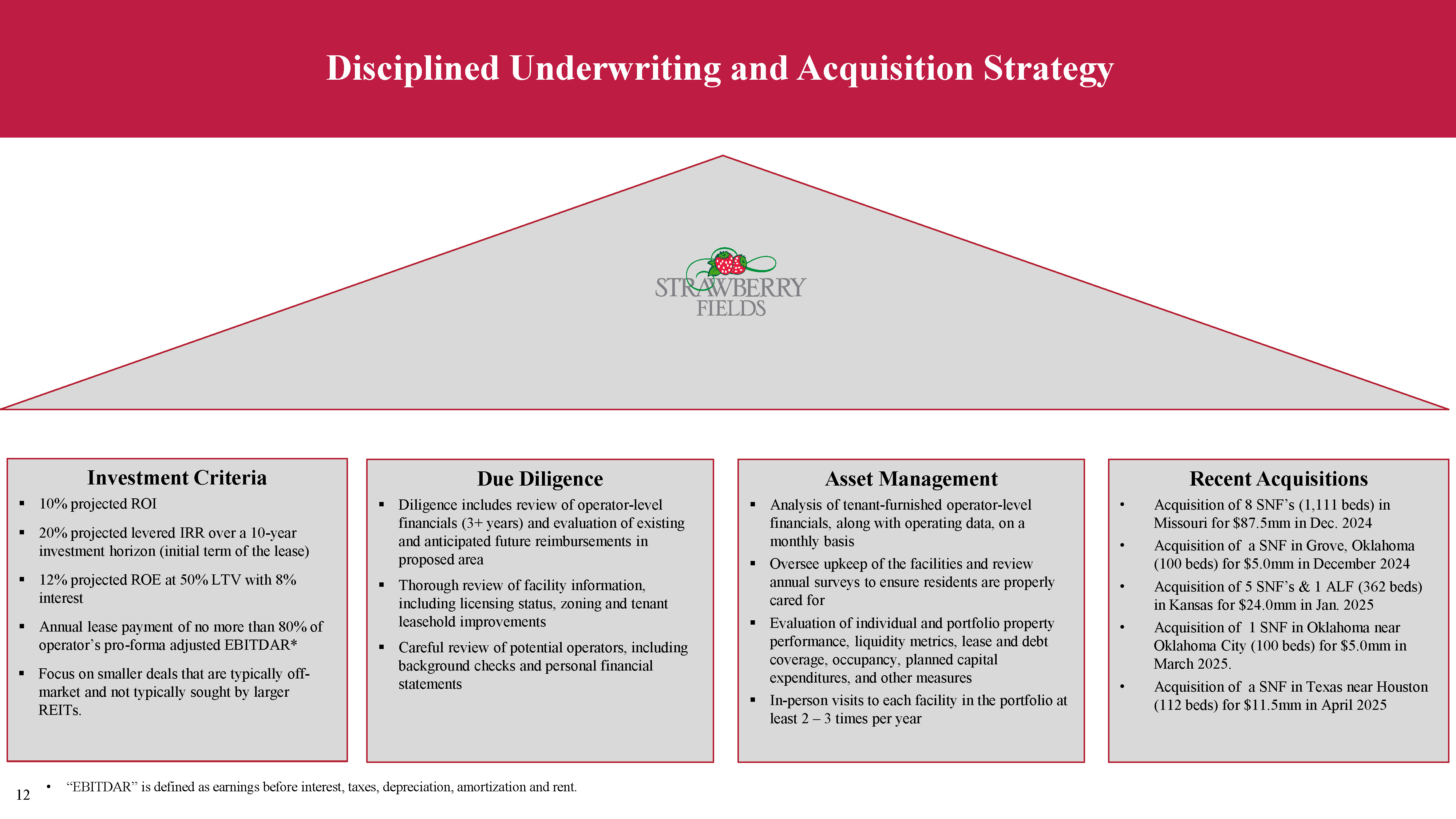 | ● | On March 31, 2025, the Company completed the acquisition for a skilled nursing facility with 100 licensed beds near Oklahoma City, Oklahoma. The acquisition was for $5.0 million. The Company funded the acquisition utilizing cash from the balance sheet. The facility is leased to an existing third-party operator who entered into a Master Lease for this facility as well as for the other facility acquired in December of 2024. The lease includes annual base rents of $0.5 million dollars with 3% annual rent increases and an initial term of 10 years with two options of 5-year extensions. | |