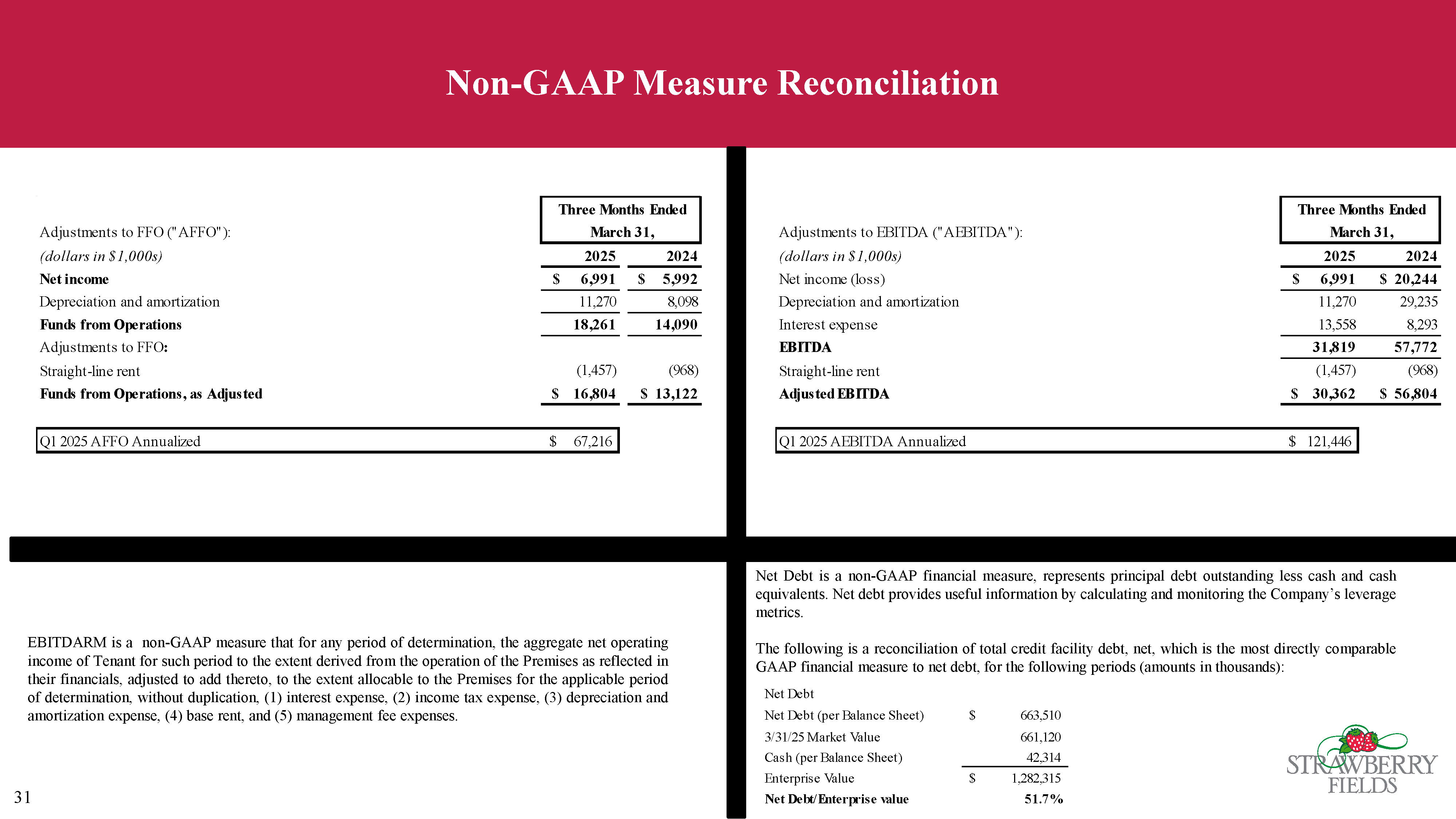 The following table reconciles our calculations of FFO and AFFO for the three months ended, March 31, 2025 and 2024, to net income the most directly comparable GAAP financial measure, for the same periods: