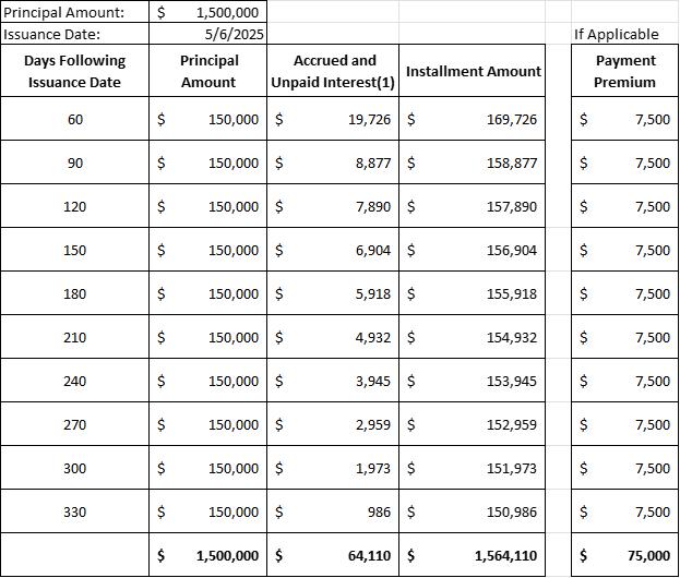 (c) Monthly Payments. On or before each date (each, an “Installment Date”) set forth on the repayment schedule attached hereto as Exhibit I (the “Repayment Schedule”), the Company shall repay a portion of the outstanding balance of this Note in an amount equal to the Principal amount set forth on the Repayment Schedule as of such Repayment Date, plus all accrued and unpaid Interest on this Note as of such Installment Date (collectively, the “Installment Amount”). With respect to the payment of any Installment Amount by the Company hereunder, the Company shall, at its own option, repay each Installment Amount either (i) in cash on or before the Installment Date, or (ii) by submitting an Advance Notice (as defined in Standby Equity Purchase Agreement dated December 20, 2023 (the “SEPA”)) (an “Advance Repayment”), or a series of Advance Notices, each with an Advance Date (as defined in the SEPA) on or before the applicable Instalment Date, or any combination of (i) or (ii) as determined by the Company. In respect of any Installment Amount, or portion thereof, to be repaid by the Company in accordance with (i) of this Section 1(c), the Company shall pay to the Holder such Installment Amount to the Holder by wire transfer of immediately available funds in cash on or before such Installment Date, which cash payment shall include the Payment Premium. If the Company elects an Advance Repayment in accordance with (ii) of this Section 1(c), for all or a portion of an Installment Amount, then the Company shall deliver an Advance Notice to the Holder in accordance with the terms and conditions of the SEPA, that will have an Advance Date on or before the applicable Installment Date. Upon the closing of such Advance Notice in accordance with the SEPA, the Holder shall offset the amount due to be paid by the Holder to the Company under the SEPA against an equal amount of the Installment Amount to be paid by the Advance Repayment. No Payment Premium shall apply in respect of an Advance Repayment. If, on the Installment Date any portion of the Installment Amount remains unpaid, the Company shall repay such outstanding Payment Amount as a cash repayment pursuant to (i) of this Section 1(c). The Repayment Schedule may be modified from time to time upon mutual consent.