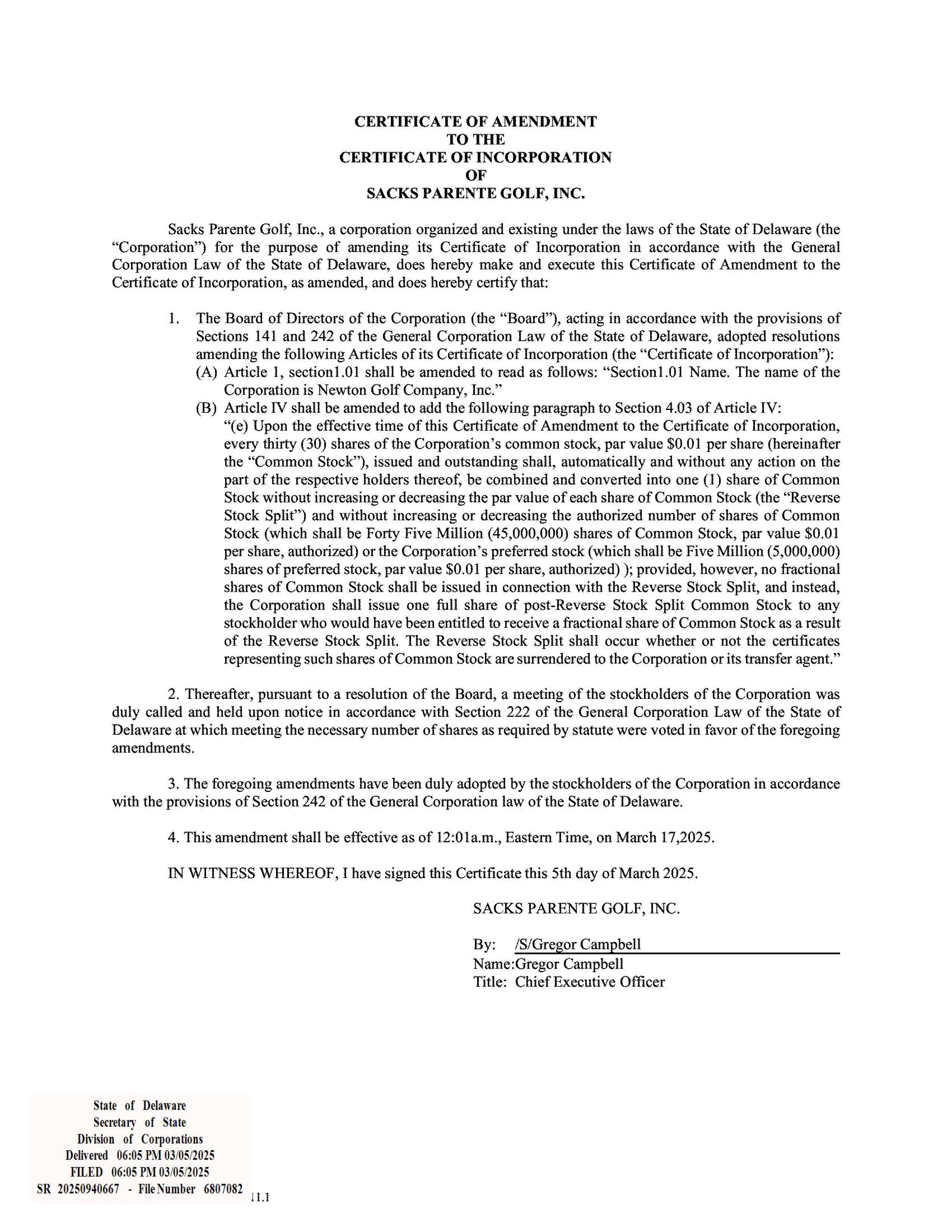 In connection with the Quarterly Report on Form 10-Q of Newton Golf Company, Inc., a Delaware corporation (the “Company”) for the period ended March 31, 2025 as filed with the U.S. Securities and Exchange Commission on the date hereof (the “Report”), Greg Campbell, Chief Executive Officer of the Company, hereby certifies, pursuant to 18 U.S.C. § 1350, as adopted pursuant to § 906 of the Sarbanes-Oxley Act of 2002, that, to the best of his knowledge and belief:
