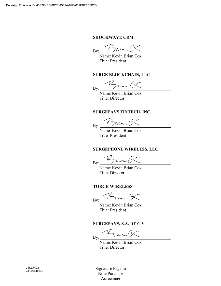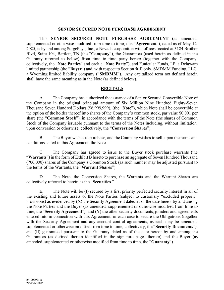 | 10.1* | Senior Secured Note Purchase Agreement, dated May 12, 2025, between SurgePays, Inc., the Guarantors, and Funicular Funds, LP | |
