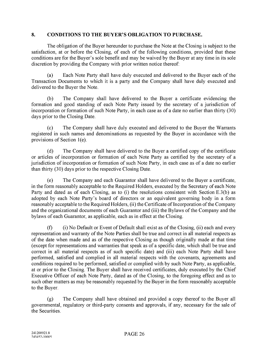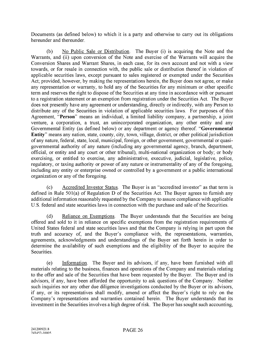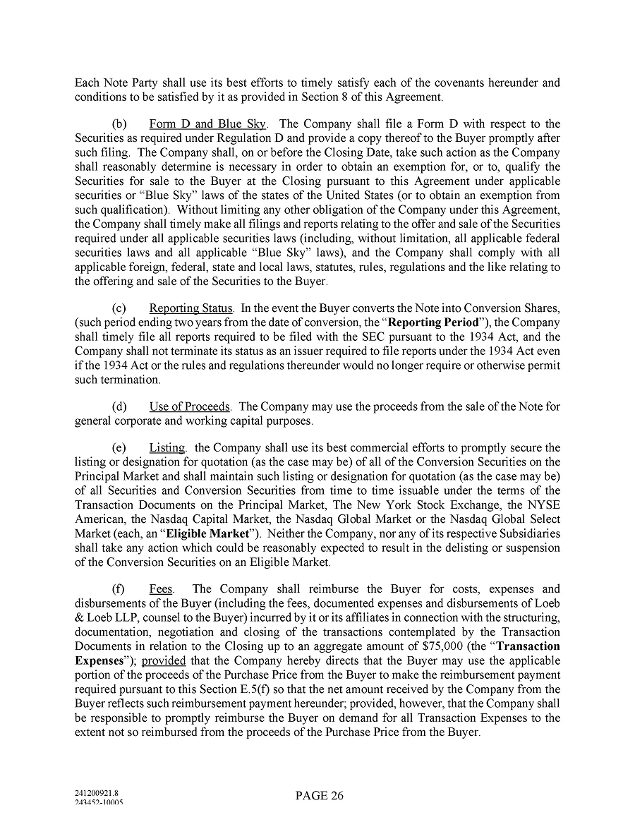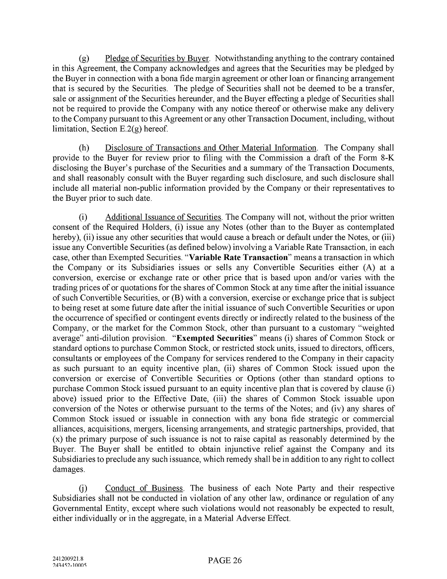 The Note contains customary terms, conditions, and agreements by the Company. Upon a notice of an event of default (as set forth in the Note), the Investor may require the Company to immediately redeem in cash (regardless of whether such Event of Default has been cured) all or any portion of the Note and all other outstanding and unpaid amounts due under the other offering documents by delivering a written notice to the Company, and indicate the portion of this Note and all other outstanding and unpaid amounts that the Investor is electing to redeem, and which amounts shall be redeemed in cash by the Company at a price equal to the sum of (i) an amount equal to (a) all outstanding and unpaid principal to be redeemed, multiplied by (b) the Redemption Premium (as defined in the Note) plus (ii) an amount equal to all other outstanding amounts. In the case of an event of default related to bankruptcy, immediately and without notice, all outstanding and unpaid outstanding amounts due under the Note and under the other offering documents plus the Bankruptcy Event of Default Redemption Premium (as defined in the Note), shall automatically become immediately due and payable in cash. Additionally, in the case of an event of default related to a liquidation event, immediately and without notice, the Company shall pay to the Investor an amount in cash equal to the greater of: (i) the sum of (x)(I) all outstanding and unpaid principal, multiplied by (II) the Redemption Premium (as defined in the Note), plus (y) an amount equal to all other outstanding amounts, and (ii) the amount of liquidation preference payable to the Holder if it has elected to convert this Note immediately prior to such liquidation event of default, in each case which shall automatically become immediately due and payable in cash.