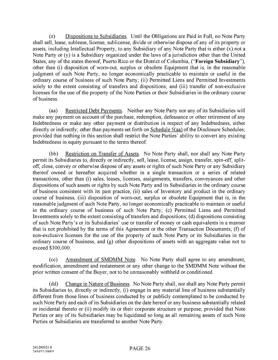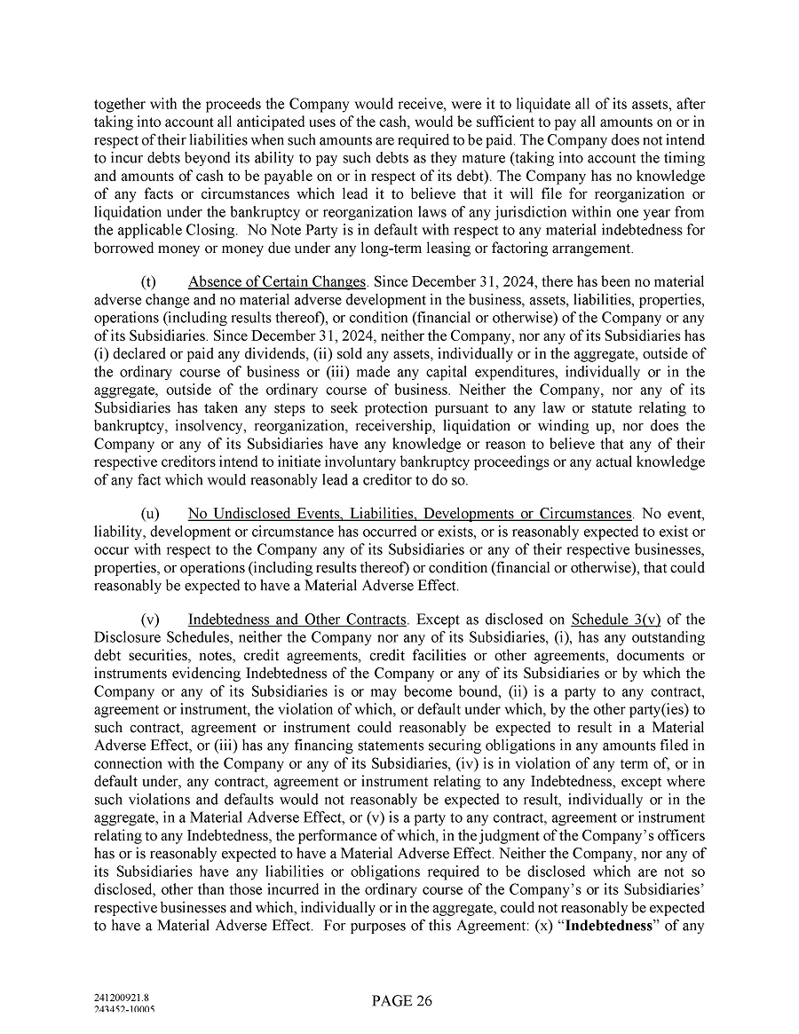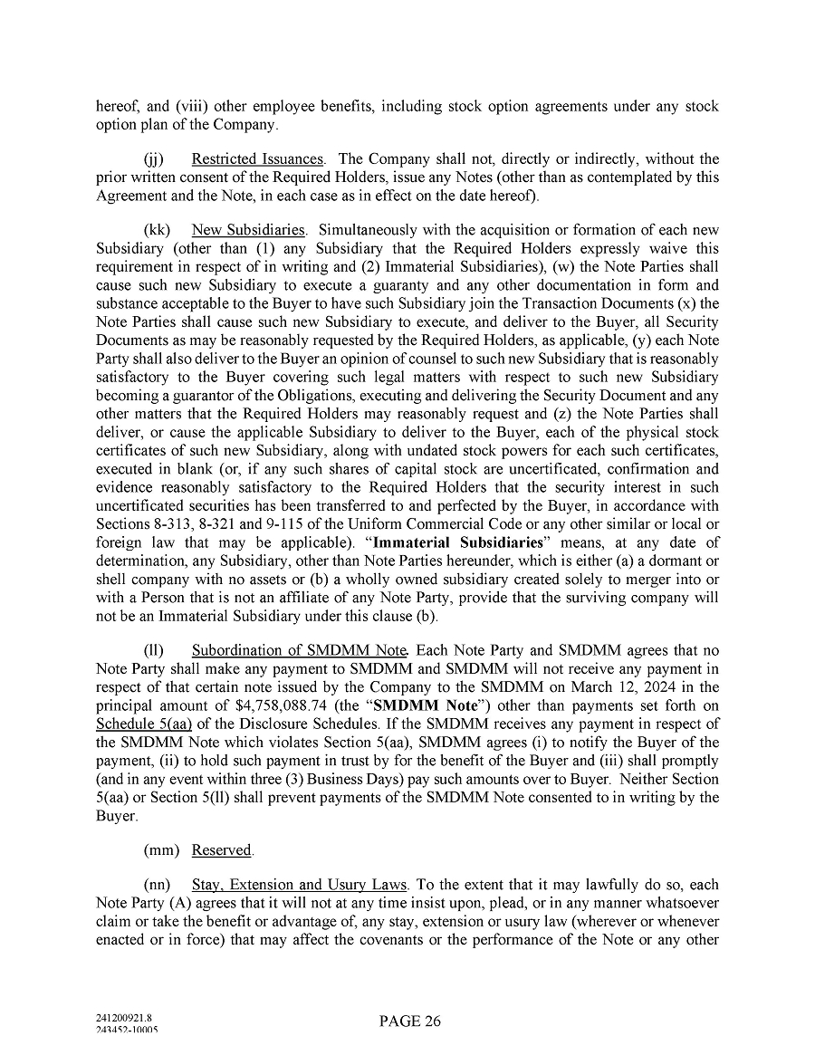 The NPA contains customary terms, conditions, and agreements by the Note Parties, indemnification obligations of the Note Parties, and termination provisions. The NPA also contains customary covenants, including but not limited to subordination of the certain outstanding note issued by the Company to SMDMM on March 12, 2024 in the principal amount of $4,758,088.74, restrictions on issuances of other debt, notes, or convertible securities involving variable rate transactions (as defined in the NPA), declarations or payments of dividends, ability for the Company to enact a stock split, restrictions on assumptions of liens or transfer of assets, as well as required post-closing conditions of the Note Parties.