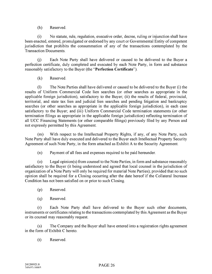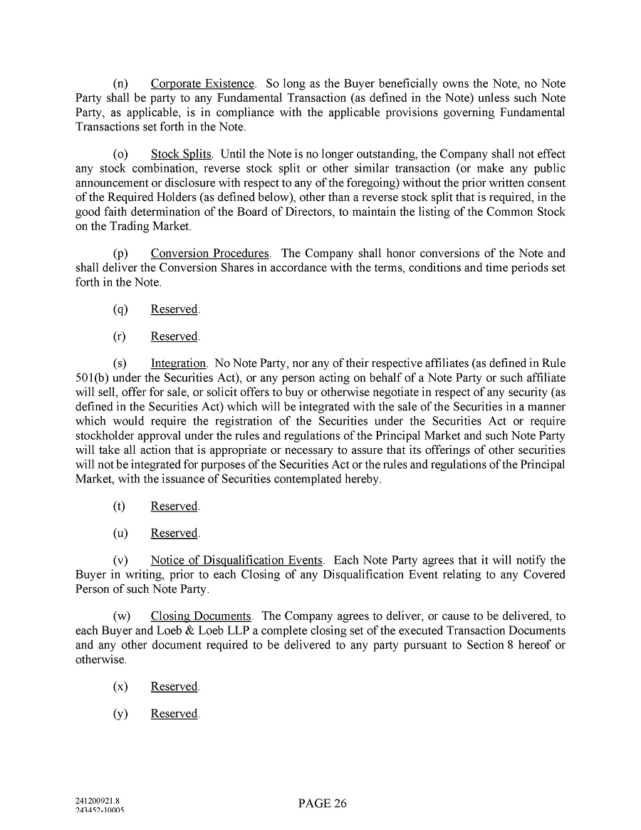 (v) the Company fails to remove any restrictive legend on any certificate of any shares of its Common Stock issued to the Holder upon conversion or exercise (as the case may be) of any Securities (as defined in the Purchase Agreement) acquired by the Holder under the Purchase Agreement (including this Note) as and when required by the Purchase Agreement, unless otherwise then prohibited by applicable federal securities laws, and any such failure remains uncured for at least ten (10) Business Days;