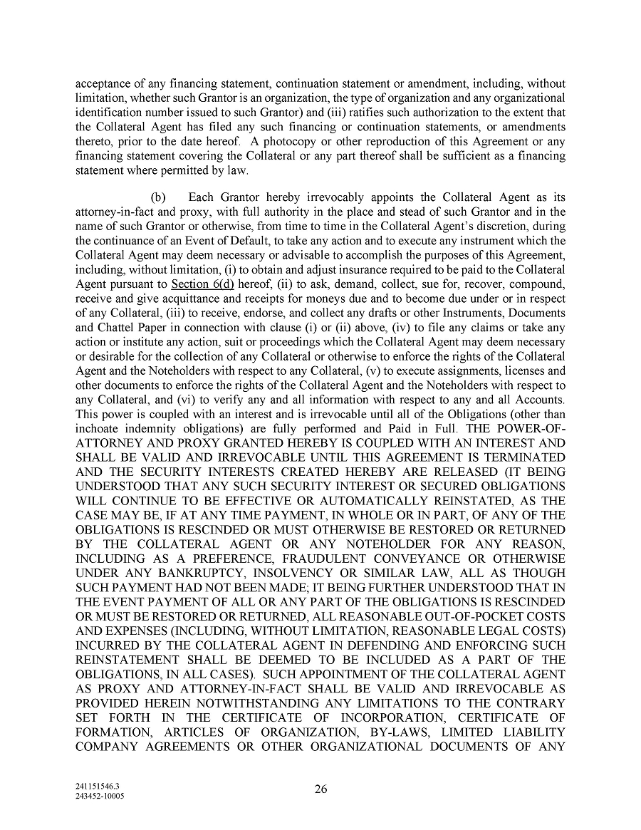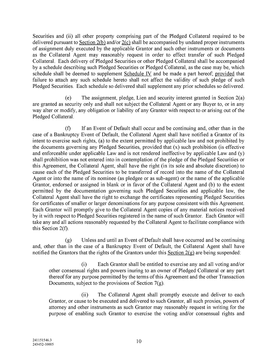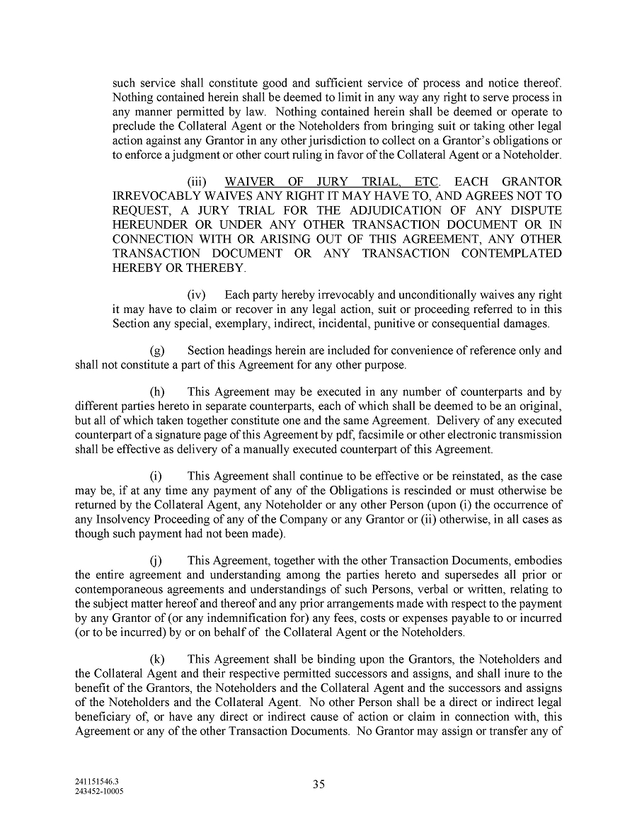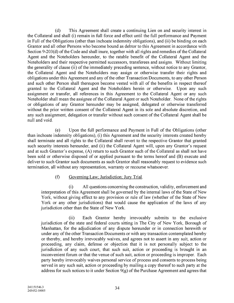 (e) This Guaranty is a continuing guaranty and shall (i) remain in full force and effect until Payment in Full of the Guaranteed Obligations (other than inchoate indemnity obligations) and shall not terminate for any reason prior to the respective Maturity Date of each Note (other than Payment in Full of the Guaranteed Obligations) and (ii) be binding upon each Guarantor and its respective successors and assigns. This Guaranty shall inure, together with all rights and remedies of the Collateral Agent hereunder, to the benefit of and be enforceable by the Collateral Agent, the other Secured Parties, and their respective successors, and permitted pledgees, transferees and assigns. Without limiting the generality of the foregoing sentence, the Collateral Agent or any other Secured Party may pledge, assign or otherwise transfer all or any portion of its rights and obligations under and subject to the terms of the Purchase Agreement or any other Transaction Document to any other Person in accordance with the terms thereof, and such other Person shall thereupon become vested with all the benefits in respect thereof granted to the Collateral Agent or such Secured Party (as applicable) herein or otherwise, in each case as provided in the Purchase Agreement or such Transaction Document. None of the rights or obligations of any Guarantor hereunder may be assigned or otherwise transferred without the prior written consent of each Secured Party.