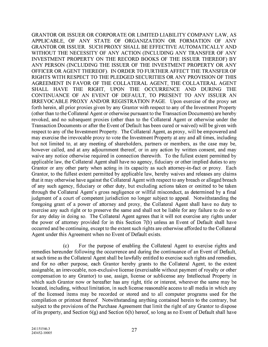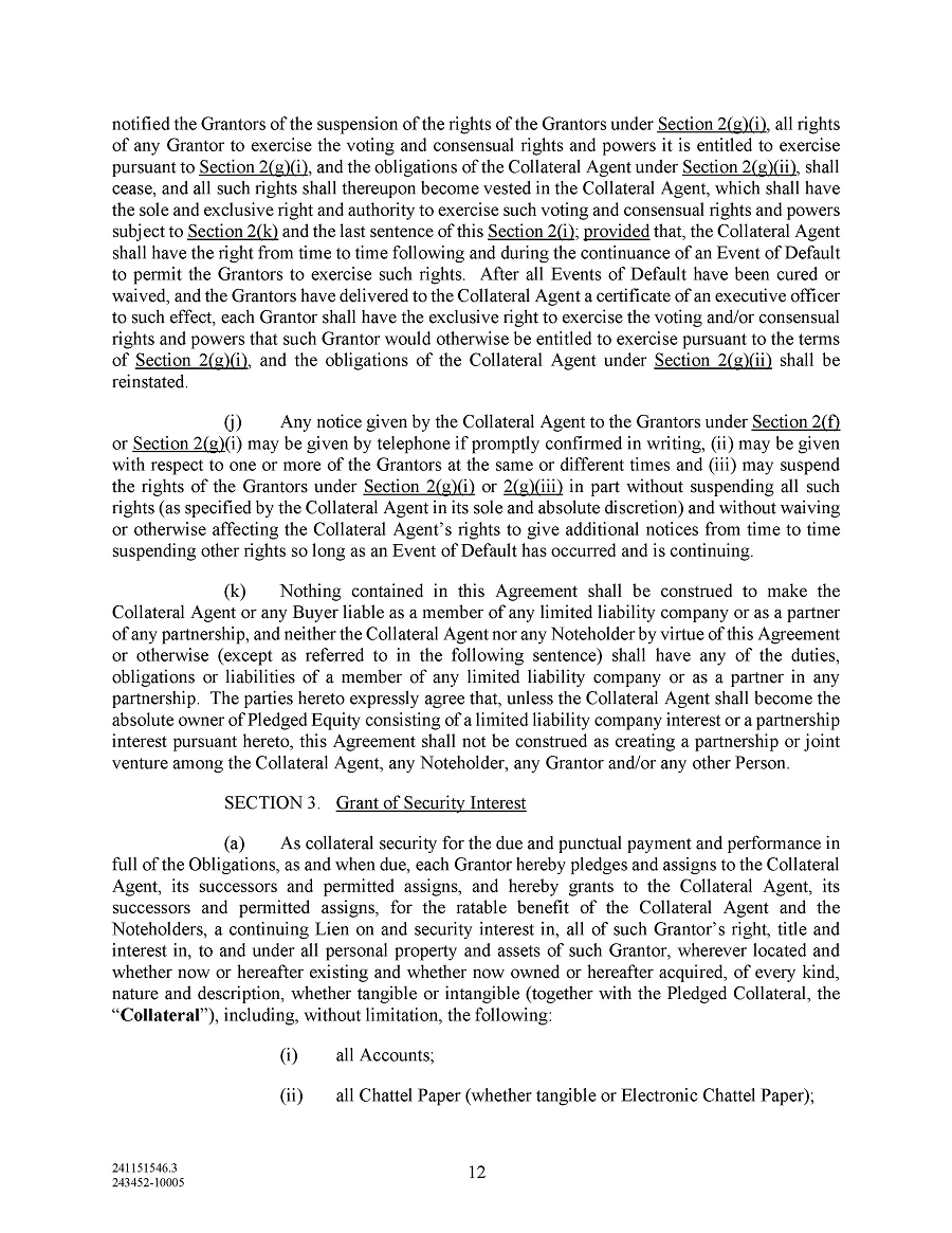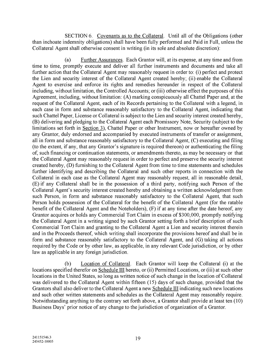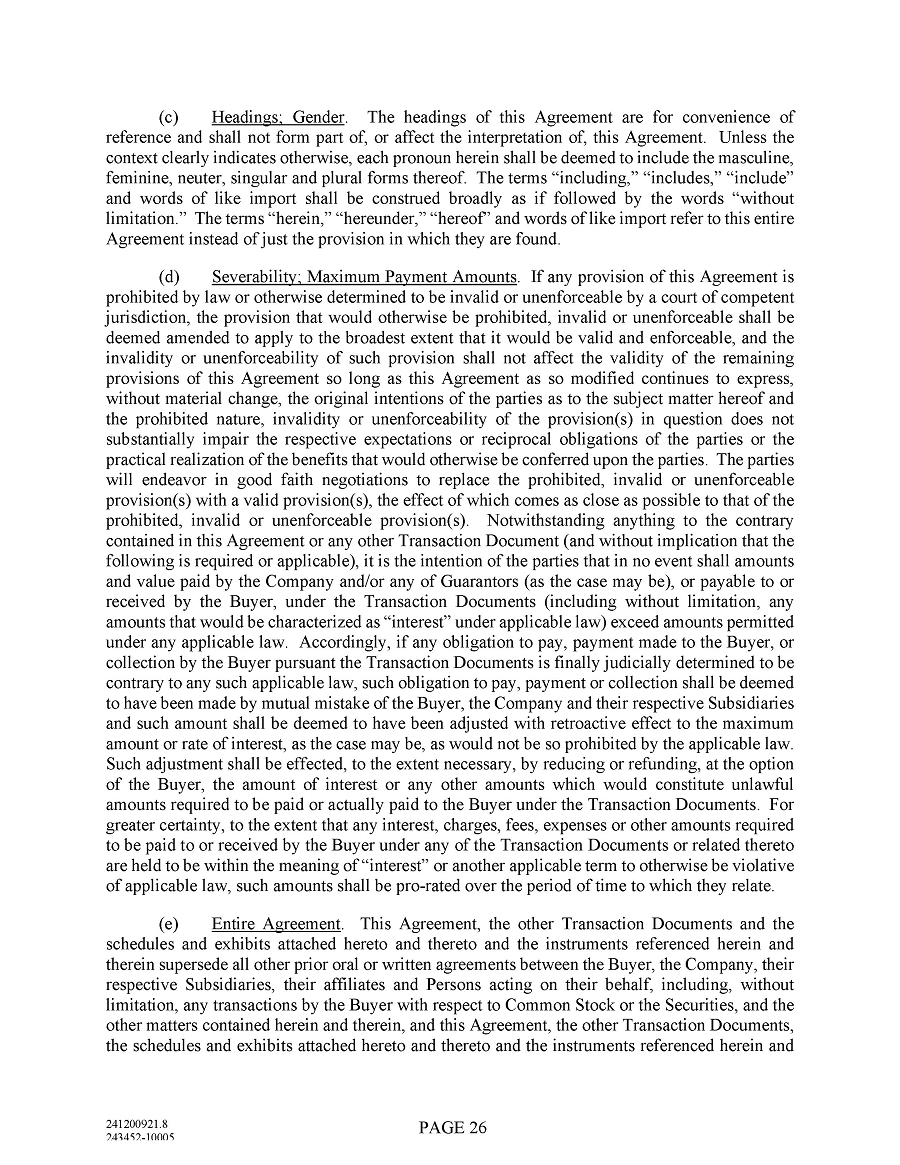 (e) This Guaranty is a continuing guaranty and shall (i) remain in full force and effect until Payment in Full of the Guaranteed Obligations (other than inchoate indemnity obligations) and shall not terminate for any reason prior to the respective Maturity Date of each Note (other than Payment in Full of the Guaranteed Obligations) and (ii) be binding upon each Guarantor and its respective successors and assigns. This Guaranty shall inure, together with all rights and remedies of the Collateral Agent hereunder, to the benefit of and be enforceable by the Collateral Agent, the other Secured Parties, and their respective successors, and permitted pledgees, transferees and assigns. Without limiting the generality of the foregoing sentence, the Collateral Agent or any other Secured Party may pledge, assign or otherwise transfer all or any portion of its rights and obligations under and subject to the terms of the Purchase Agreement or any other Transaction Document to any other Person in accordance with the terms thereof, and such other Person shall thereupon become vested with all the benefits in respect thereof granted to the Collateral Agent or such Secured Party (as applicable) herein or otherwise, in each case as provided in the Purchase Agreement or such Transaction Document. None of the rights or obligations of any Guarantor hereunder may be assigned or otherwise transferred without the prior written consent of each Secured Party.