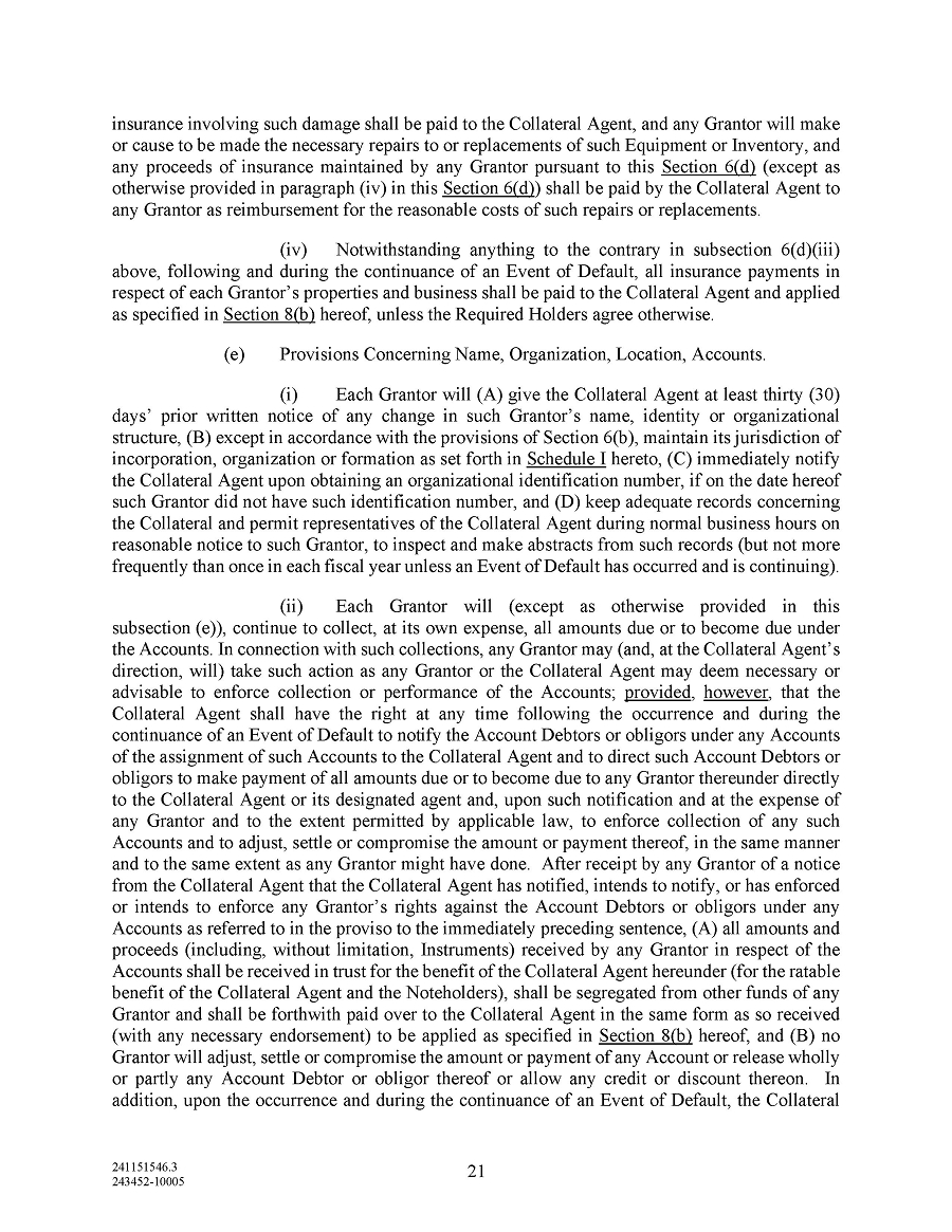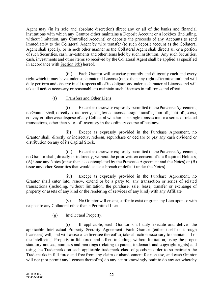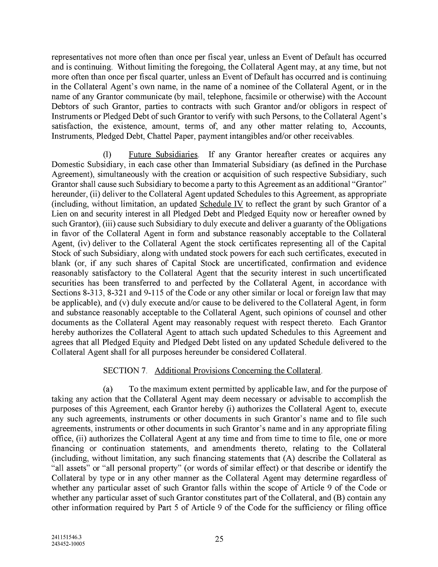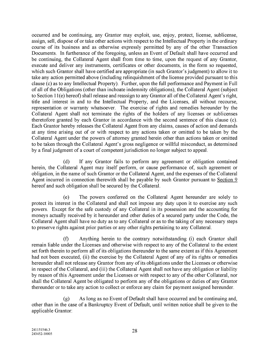 (e) This Guaranty is a continuing guaranty and shall (i) remain in full force and effect until Payment in Full of the Guaranteed Obligations (other than inchoate indemnity obligations) and shall not terminate for any reason prior to the respective Maturity Date of each Note (other than Payment in Full of the Guaranteed Obligations) and (ii) be binding upon each Guarantor and its respective successors and assigns. This Guaranty shall inure, together with all rights and remedies of the Collateral Agent hereunder, to the benefit of and be enforceable by the Collateral Agent, the other Secured Parties, and their respective successors, and permitted pledgees, transferees and assigns. Without limiting the generality of the foregoing sentence, the Collateral Agent or any other Secured Party may pledge, assign or otherwise transfer all or any portion of its rights and obligations under and subject to the terms of the Purchase Agreement or any other Transaction Document to any other Person in accordance with the terms thereof, and such other Person shall thereupon become vested with all the benefits in respect thereof granted to the Collateral Agent or such Secured Party (as applicable) herein or otherwise, in each case as provided in the Purchase Agreement or such Transaction Document. None of the rights or obligations of any Guarantor hereunder may be assigned or otherwise transferred without the prior written consent of each Secured Party.