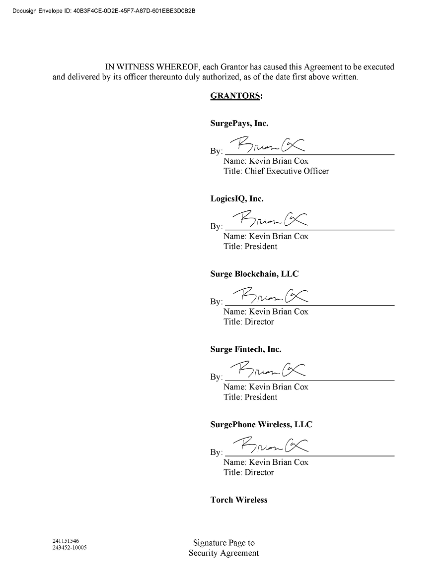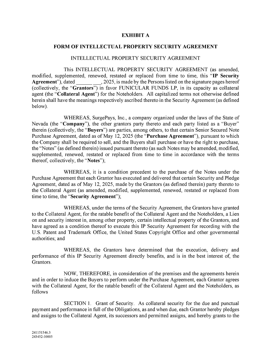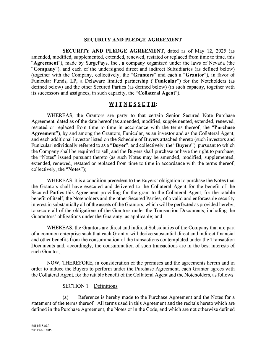 | 10.2* | Security And Pledge Agreement, dated May 12, 2025, between SurgePays, Inc., the Guarantors, and Funicular Funds, LP | |