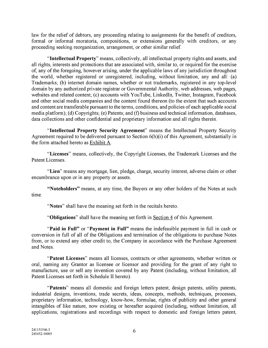 WHEREAS, the Guarantors are party to that certain Senior Secured Note Purchase Agreement, dated as of the date hereof (as amended, modified, supplemented, extended, renewed, restated or replaced from time to time in accordance with the terms thereof, the “Purchase Agreement”), by and among the Company, the Guarantors, Funicular, as an investor and as the Collateral Agent, and each additional investor listed on the Schedule of Buyers attached thereto (such investors and Funicular individually referred to as a “Buyer”, and collectively, the “Buyers”), pursuant to which the Company shall be required to sell, and the Buyers shall purchase or have the right to purchase, the “Notes” issued pursuant thereto (as such Notes may be amended, modified, supplemented, extended, renewed, restated or replaced from time to time in accordance with the terms thereof, collectively, the “Notes”);