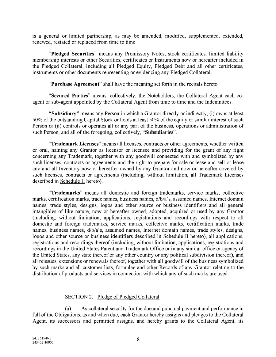 SECTION 1. Definitions. Reference is hereby made to the Purchase Agreement, Security Agreement and the Notes for a statement of the terms thereof. All terms used in this Guaranty and the recitals hereto which are defined in the Purchase Agreement, Security Agreement or the Notes, and which are not otherwise defined herein shall have the same meanings herein as set forth therein. In addition, the following terms when used in the Guaranty shall have the meanings set forth below: