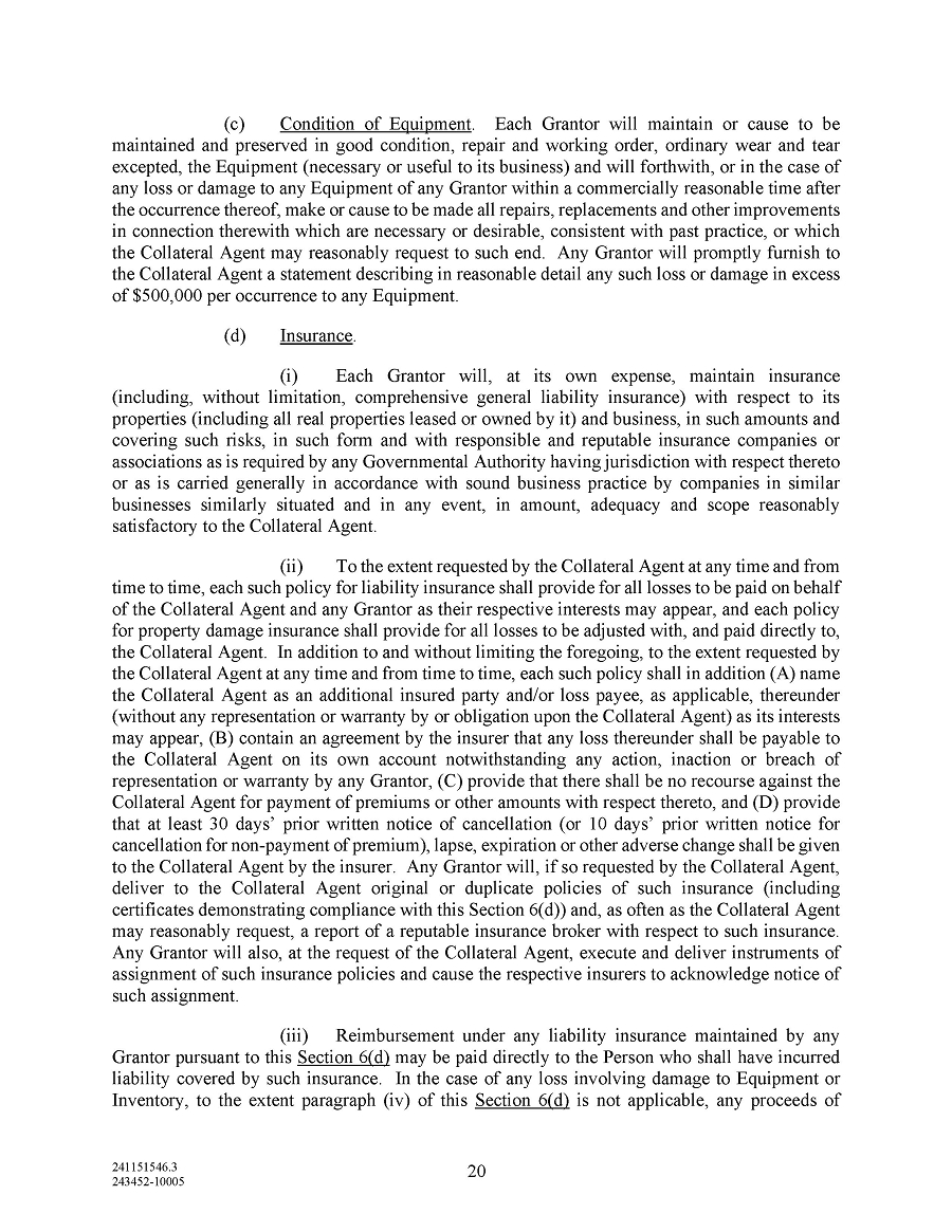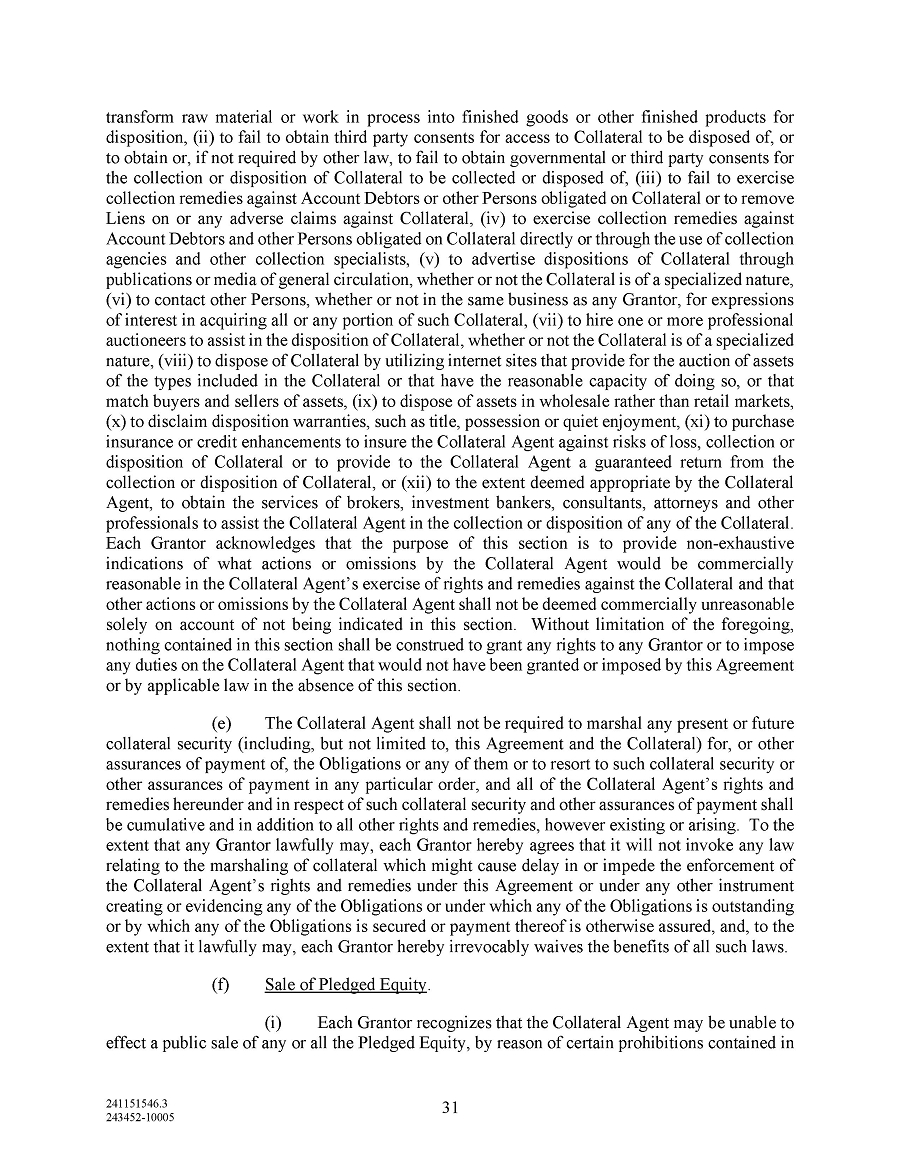 (vi) any manner of application of Collateral or any other collateral, or proceeds thereof, to all or any of the Guaranteed Obligations, or any manner of sale or other disposition of any Collateral or any other collateral for all or any of the Guaranteed Obligations or any other Obligations of any Transaction Party under the Transaction Documents or any other assets of any Transaction Party or any of its Subsidiaries;