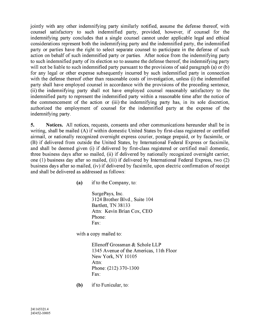 FOR VALUE RECEIVED, SurgePays, Inc., a Nevada corporation (the “Company”), hereby promises to pay to the order of Funicular Funds, LP, a Delaware limited partnership, or its registered assigns (“Holder”) the amount set forth above as the Original Principal Amount (as reduced or increased pursuant to the terms hereof pursuant to redemption, conversion or otherwise, including PIK Interest (as defined below), the “Principal”) when due, whether upon the Maturity Date, or upon acceleration, redemption or otherwise (in each case in accordance with the terms hereof) from the date set forth above as the Issuance Date (the “Issuance Date”) until the same becomes due and payable, whether upon the Maturity Date or upon acceleration, conversion, redemption or otherwise (in each case in accordance with the terms hereof).