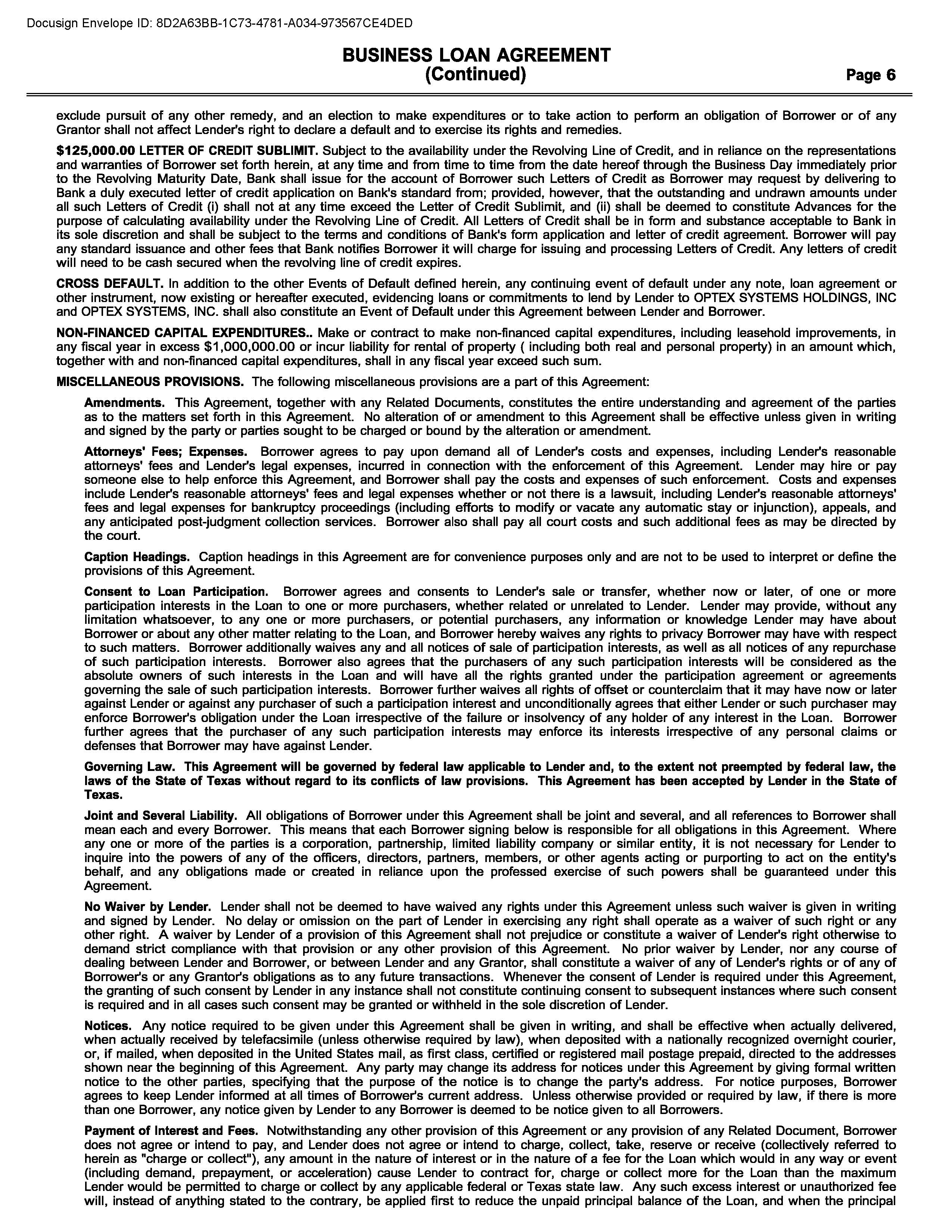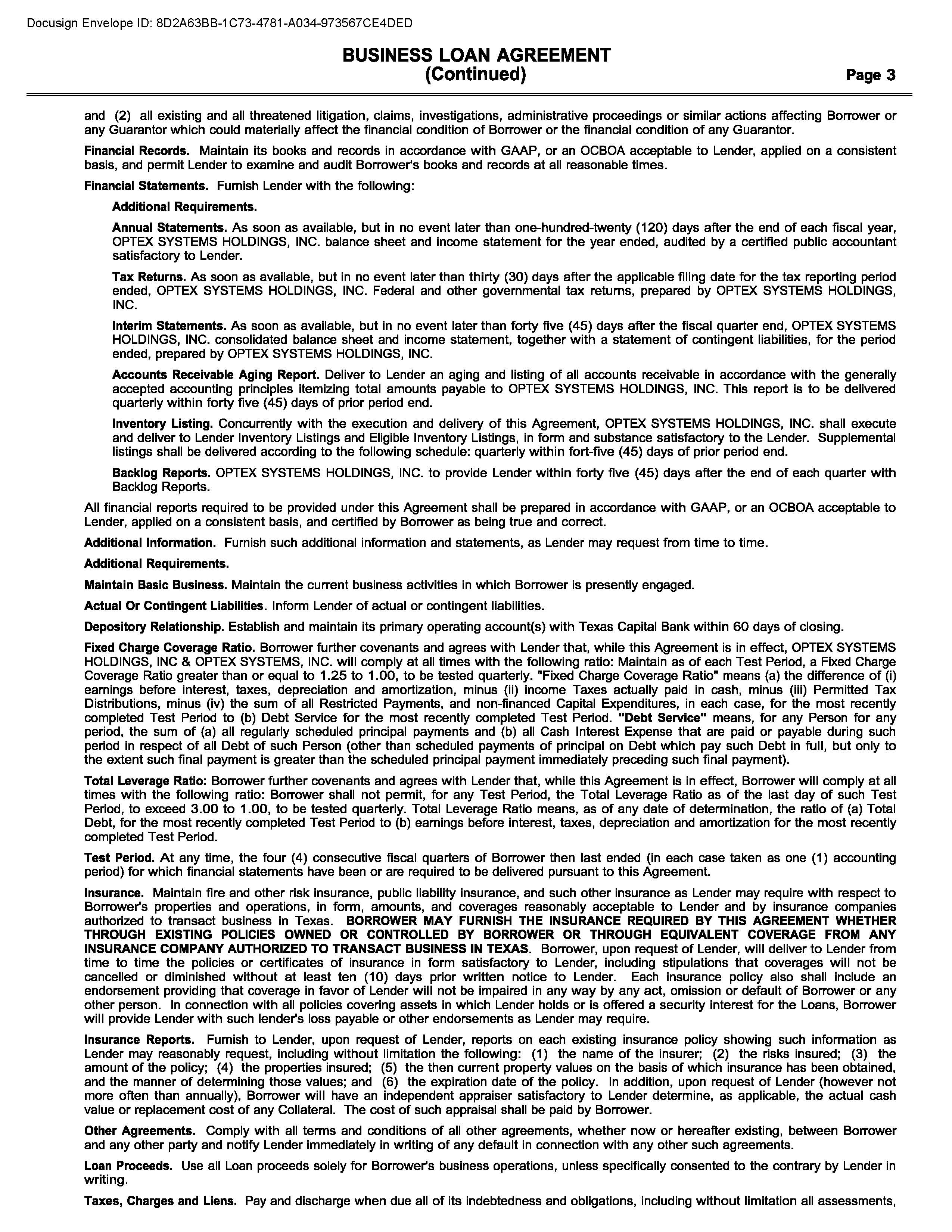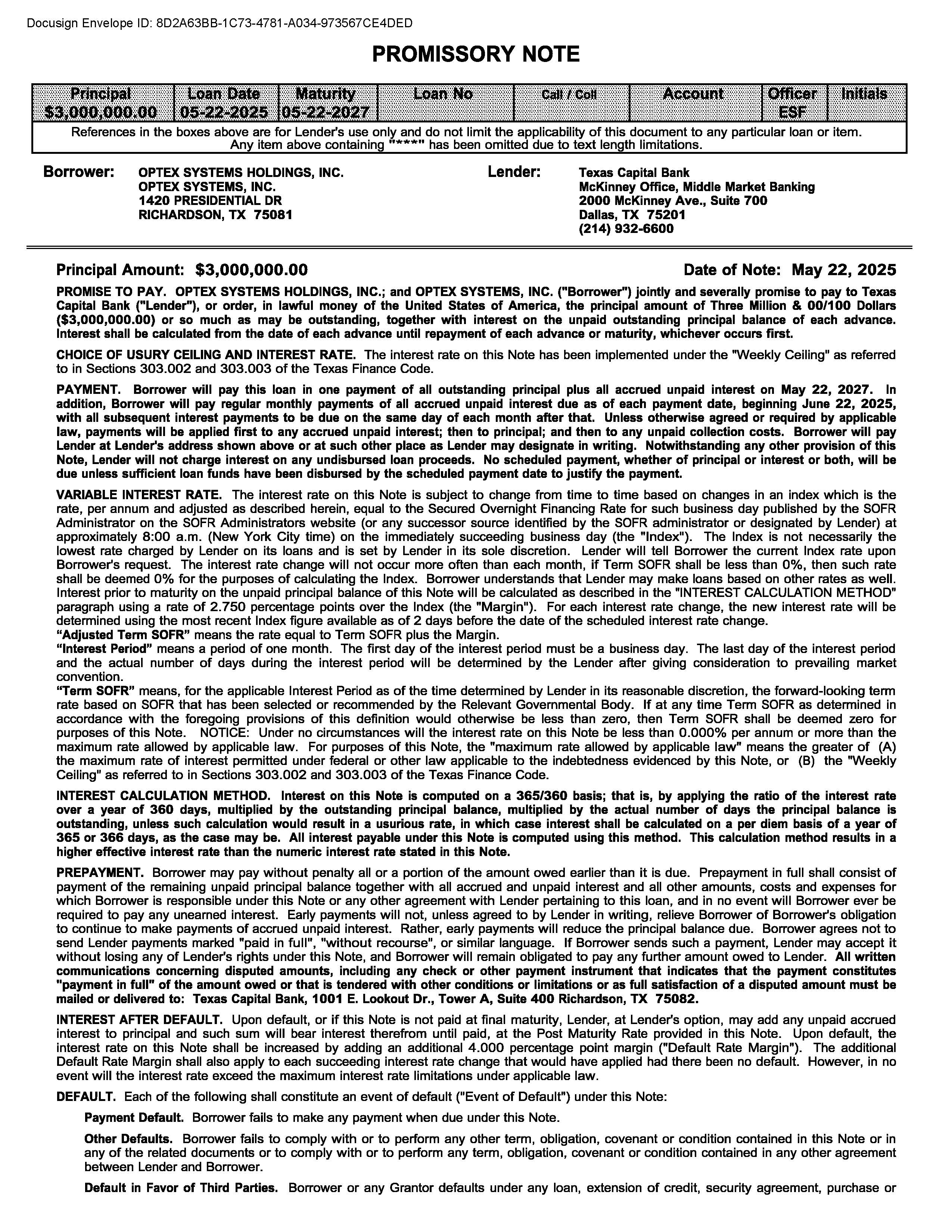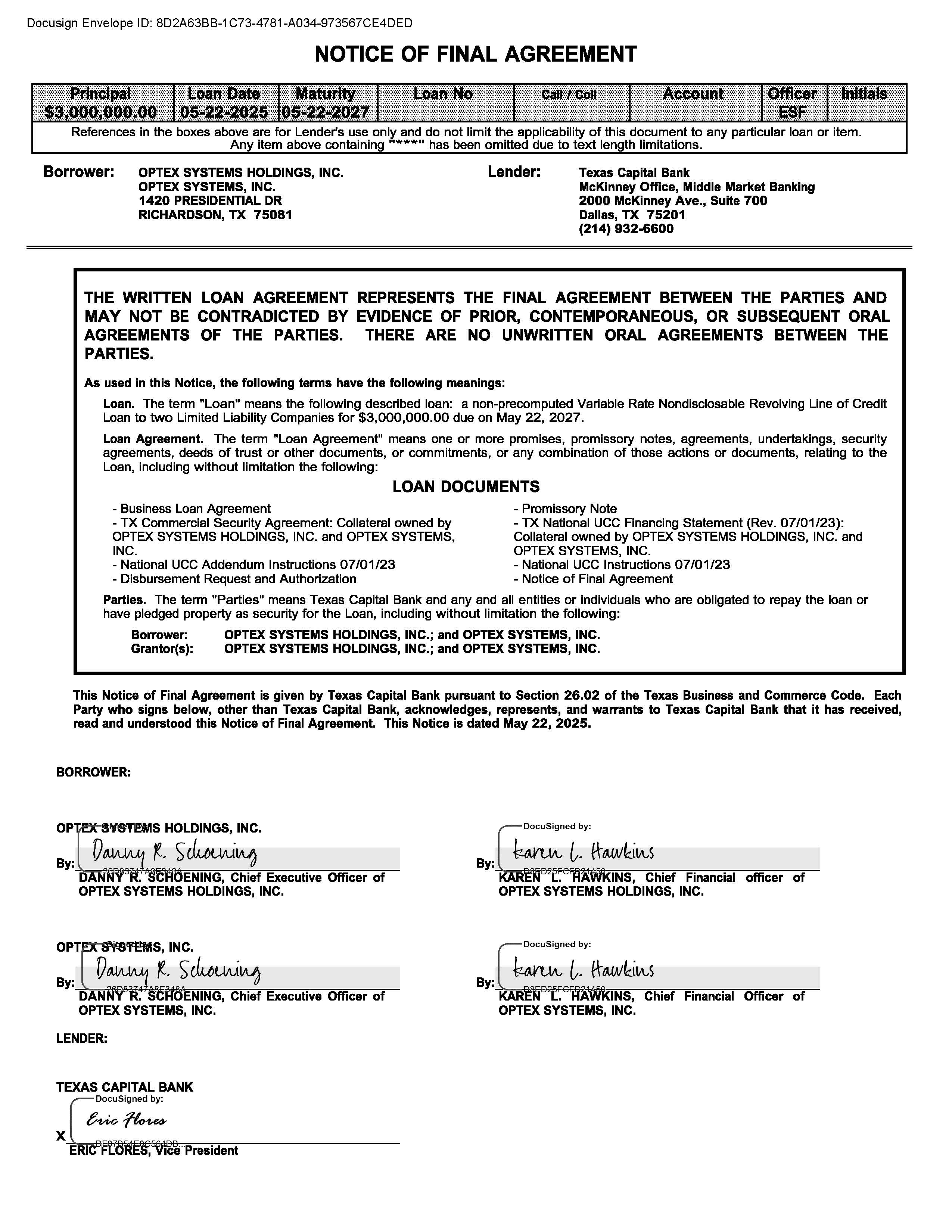| 10.1 | Business Loan Agreement effective as of May 22, 2025 by and among Optex Systems Holdings, Inc., Optex Systems, Inc., and Texas Capital Bank (including Note) | |