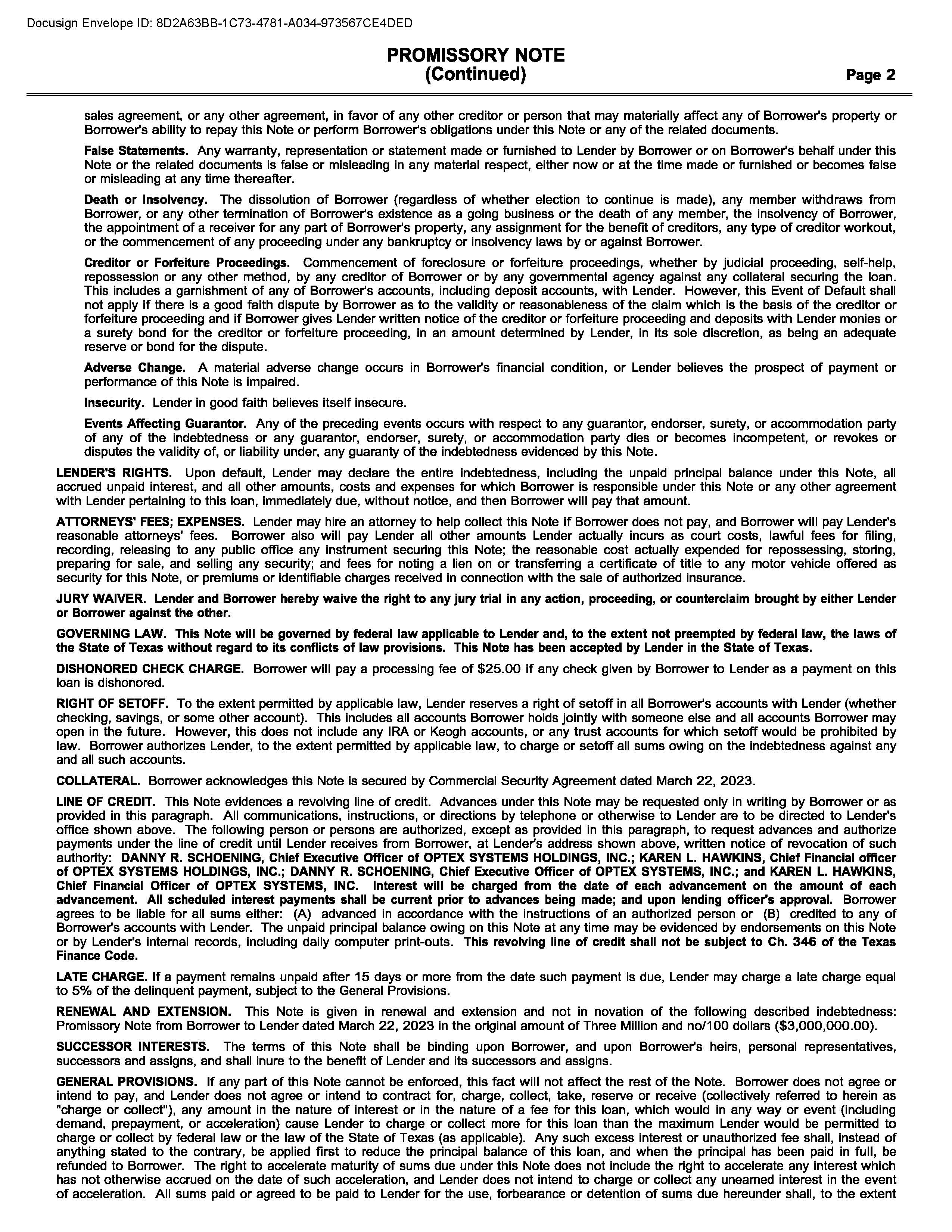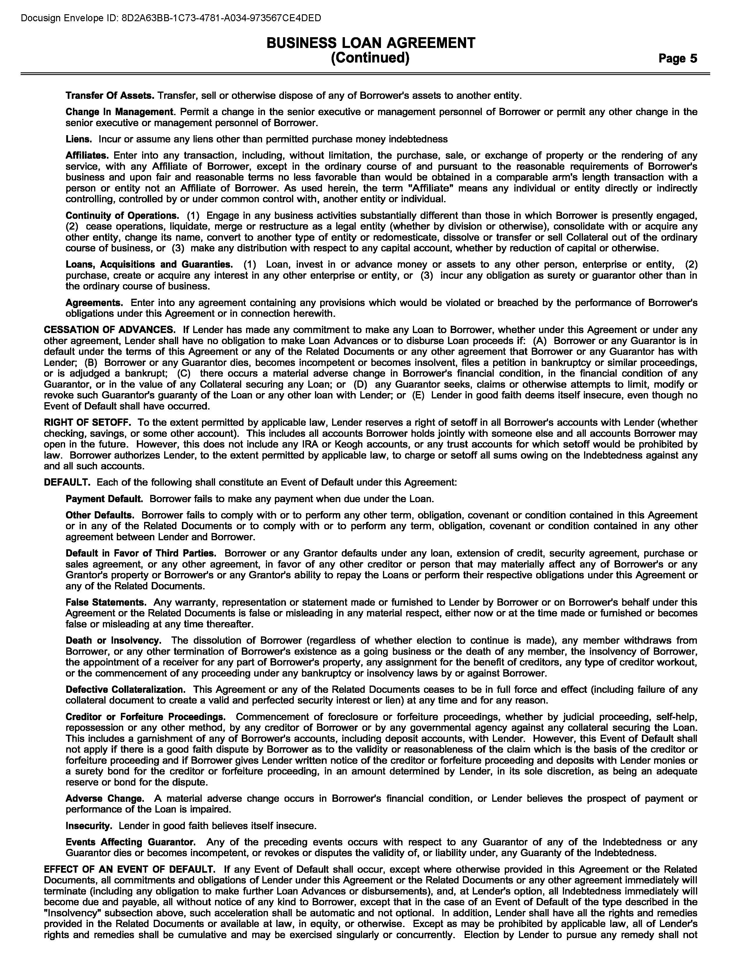 The Loan Agreement contains customary events of default and negative covenants, including but not limited to those governing capital expenditures (limited to $1 million per year), indebtedness and liens, affiliate transactions, fundamental changes (including change in management), investments, and restricted payments (including dividends). The Loan Agreement also requires the Borrowers to maintain a fixed charge coverage ratio of at least 1.25:1 and a total leverage ratio of 3:1. The Credit Facility is secured by substantially all of the operating assets of the Borrowers as collateral. The Borrowers’ obligations under the Credit Facility are subject to acceleration upon the occurrence of an event of default as defined in the Loan Agreement. The Loan Agreement further provides for a $125,000 Letter of Credit sublimit.