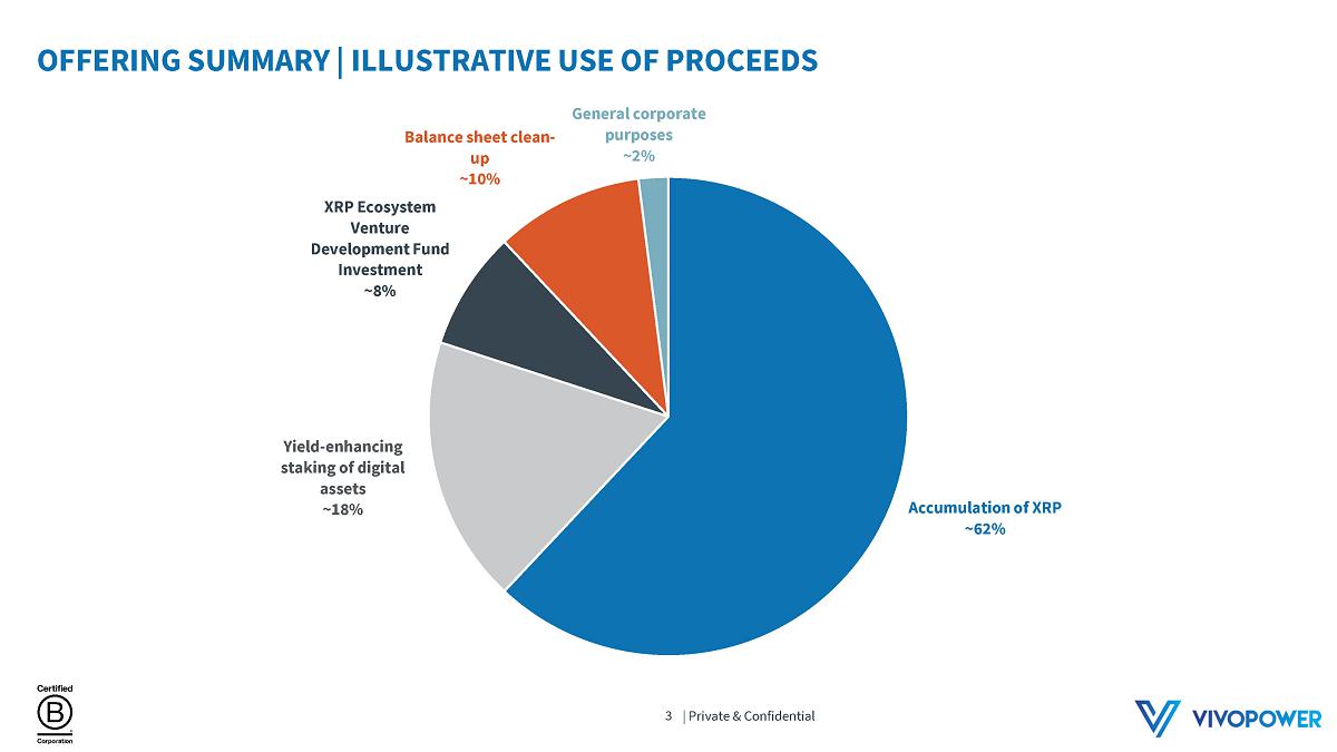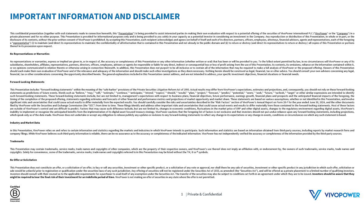 Executive Chairman of VivoPower, Kevin Chin, said: “We are incredibly privileged to have His Royal Highness, Prince Abdulaziz bin Turki Abdulaziz Al Saud of Saudi Arabia leading this transformational capital raising and are also pleased to welcome other digital asset industry investors joining in this round. As long-term holder of XRP myself, we all share a common vision and objectives with regards to how a publicly listed XRP-focused treasury company can be scaled for the benefit of the XRP community and VivoPower stakeholders alike. Furthermore, I am personally enthusiastic about the multiple real-world use cases that help resolve issues such as international wire payment friction, which we have experienced first-hand given the markets we operate in. We can see a number of potentials XRP blockchain solutions for our Tembo business and Caret Digital businesses. By way of update, we are now accelerating to complete the spin-offs of both Tembo and Caret Digital and will continue to engage with Energi to discuss next steps in relation to their takeover proposal.”