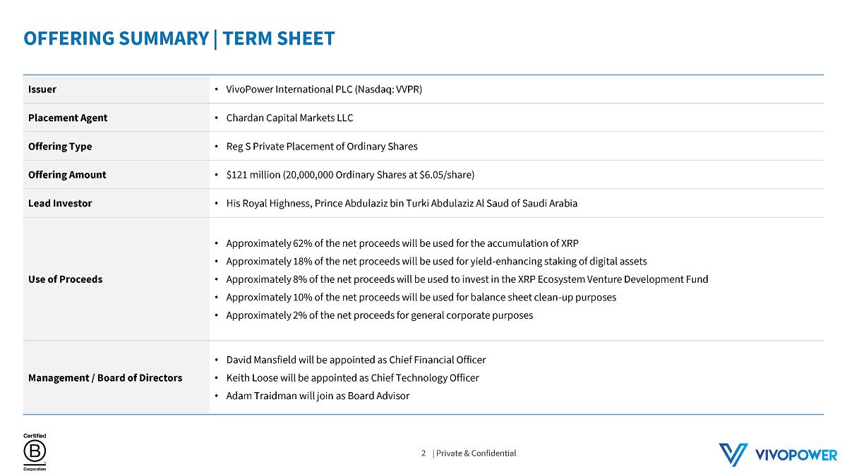 His Royal Highness, Prince Abdulaziz bin Turki Abdulaziz Al Saud, said: “We have been investors in the digital asset sector for a decade and have been long-term holders of XRP. After reviewing a number of listed vehicles seeking to embrace a digital asset treasury model, we selected VivoPower given its strategic focus on XRP and its objective to contribute to building out of the XRPL ecosystem. Furthermore, we are committed to the long-term partnership objective that we share with Kevin Chin and his team. We are honored to be leading this capital raising for a company that will be the first in the world executing on an XRP-focused treasury strategy. Having met with President Trump and his leadership group during their recent visit to Saudi Arabia, we believe the timing is appropriate for digital assets and blockchain technology to be rolled out in the Kingdom and we are delighted to be assisting VivoPower in this regard.”