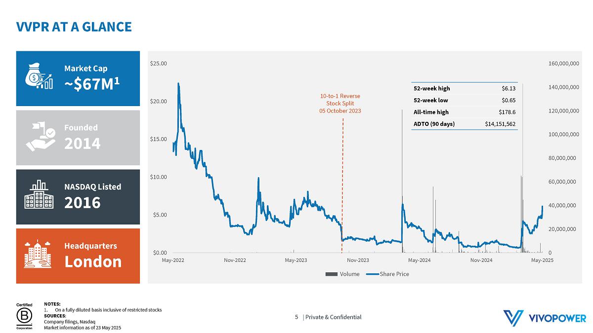 LONDON, 28 May 2025 (GLOBE NEWSWIRE) — VivoPower International PLC (Nasdaq: VVPR, the “Company”) is pleased to announce that it has reached agreement with certain investors in relation to a private capital raise priced at US$6.05 per share, above the last market closing price of US$6.04 under Nasdaq rules. In connection therewith, the Company has entered into securities purchase agreements (Subscription Agreement) with the investors for the purchase and sale of an aggregate of 20,000,000 ordinary shares of the Company at a price of US$6.05 per share for aggregate gross proceeds of approximately US$121 million, before deducting placement agent fees and other offering expenses.