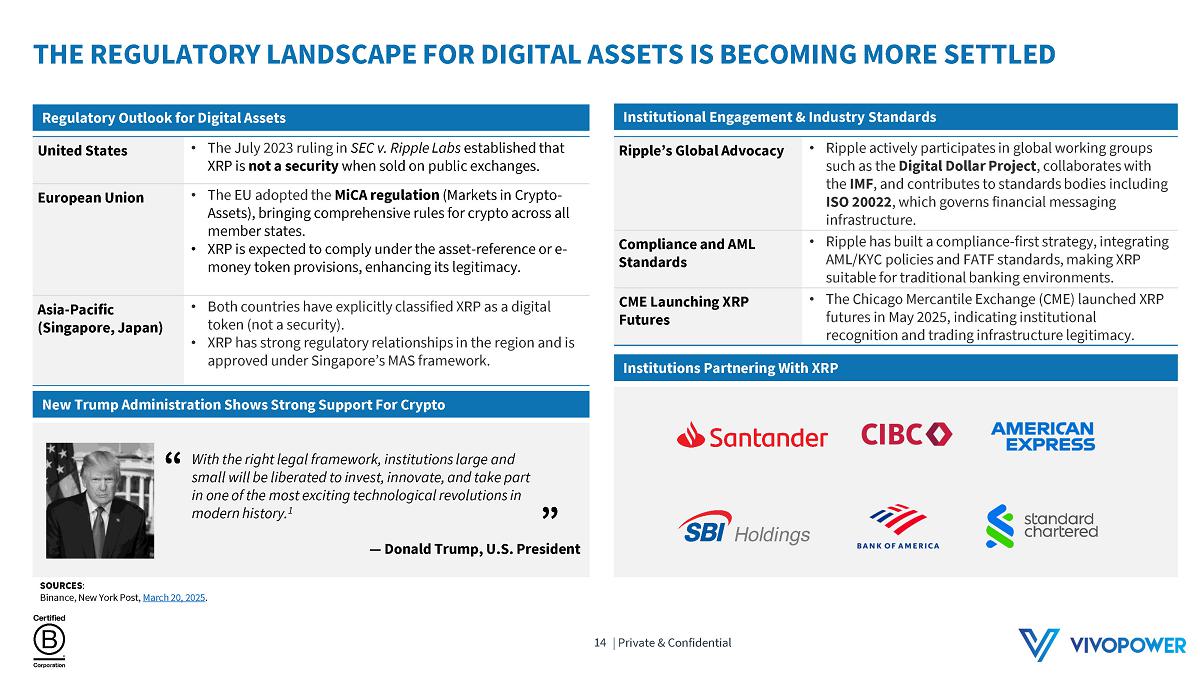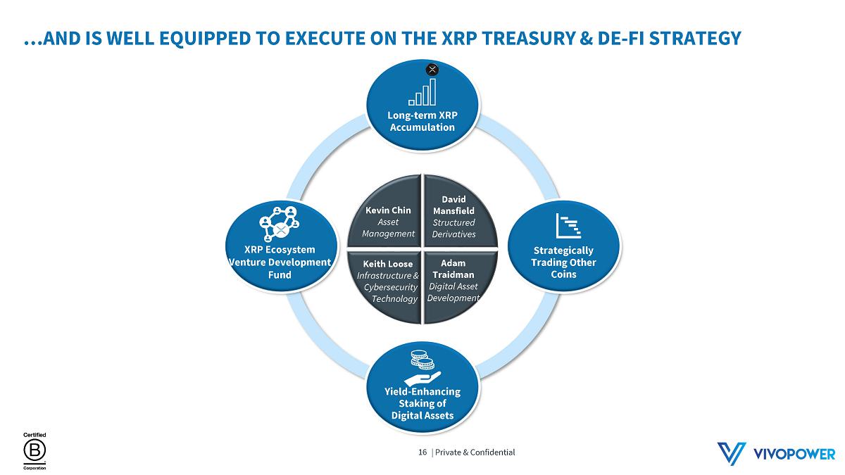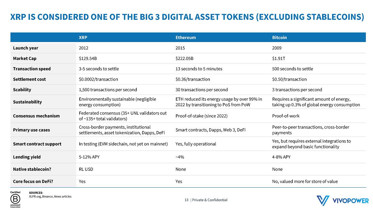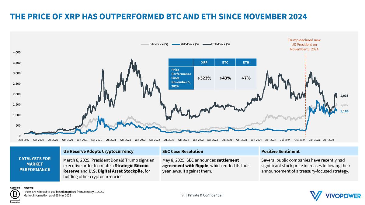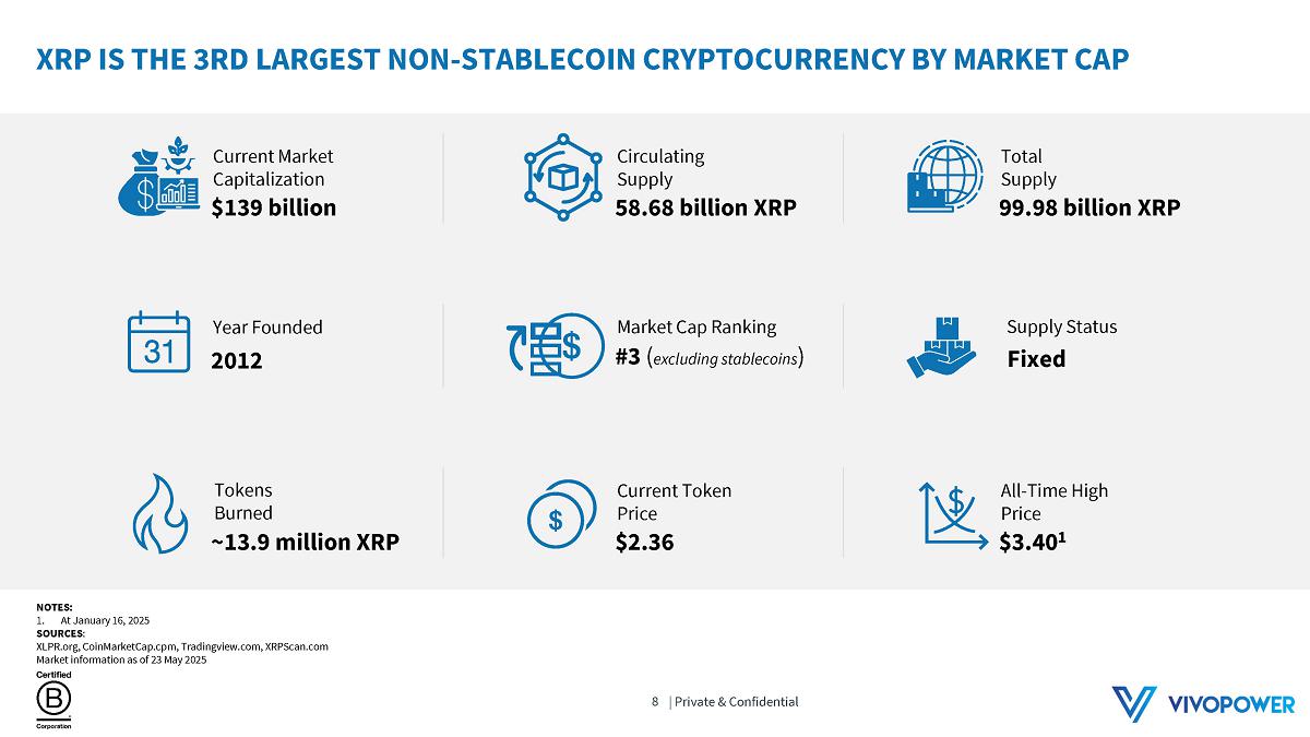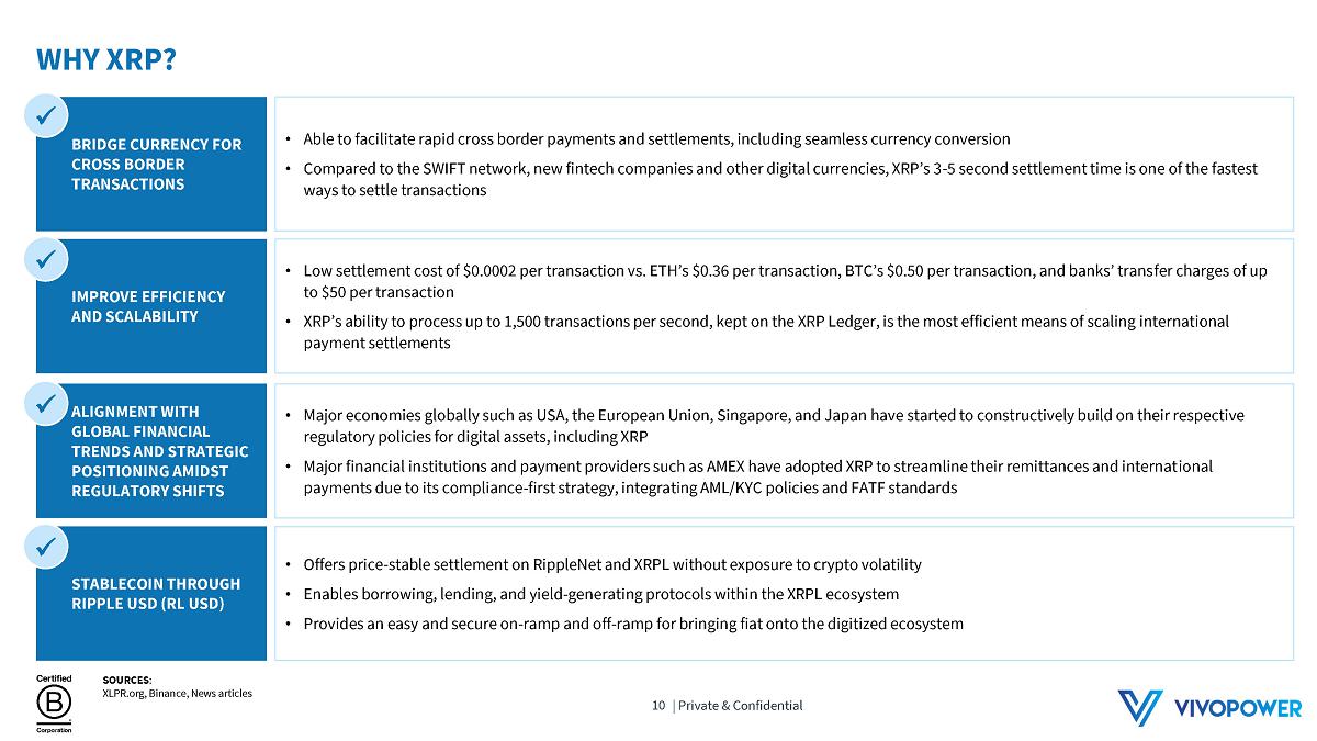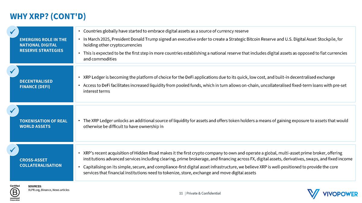 VivoPower is believed to be the first publicly listed company in the world to launch an XRP-focused digital asset treasury strategy that also encompasses the contribution to building out the XRPL ecosystem for real-world decentralized finance blockchain solutions. XRP is expected to be one of five digital assets that will be accumulated by the US Government as part of President Donald Trump’s recently announced Strategic Bitcoin Reserve and United States Digital Asset Stockpile.