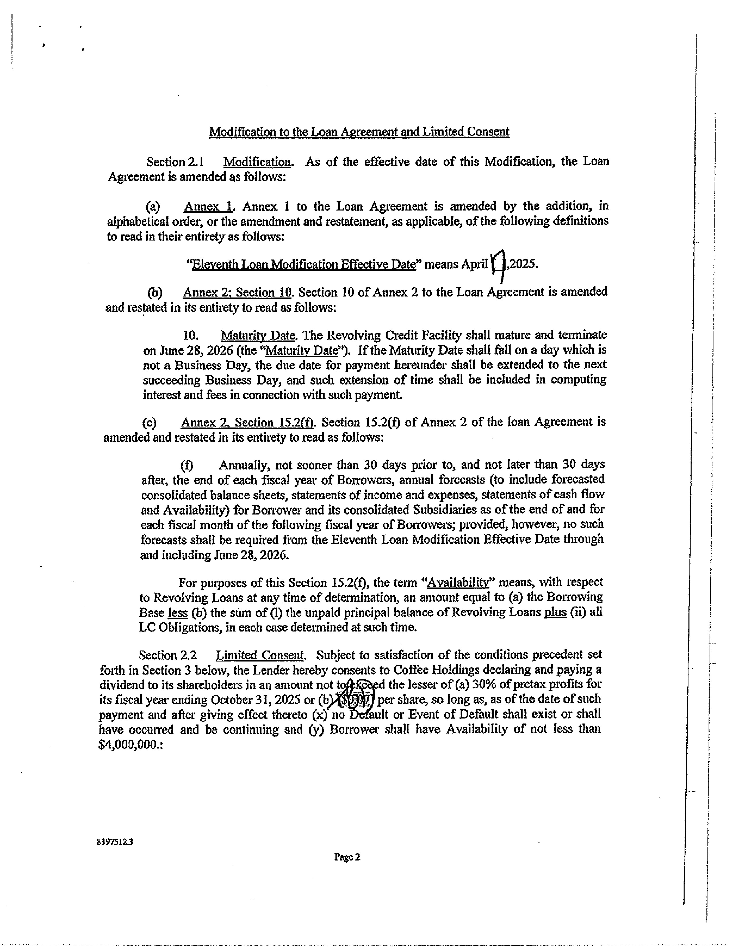 | 10.1 | Eleventh Loan Modification Agreement and Limited Consent, dated April 17, 2025, by and among Coffee Holding Co., Inc., Organic Products Trading Company LLC and Webster Bank, National Association. | |