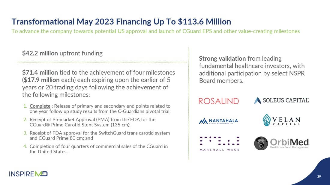 The Company’s announcement of FDA approval of the CGuard Prime Carotid Stent System triggers the second of four milestone-driven warrant tranches pursuant to the private placement financing of up to $113.6 million announced in May 2023. Gross proceeds from this warrant tranche are expected to be $17.9M if exercised in full. Proceeds, if any, will be used to support the imminent commercial launch of the CGuard Prime Carotid Stent System in the United States, initiating new regulatory pathways for advanced applications of our CGuard stent platform, and developing new products, while at the same time continuing to develop our business outside of the United States. Warrant holders include Marshall Wace, OrbiMed, Rosalind, Nantahala, Soleus, Velan, and certain InspireMD Board members.